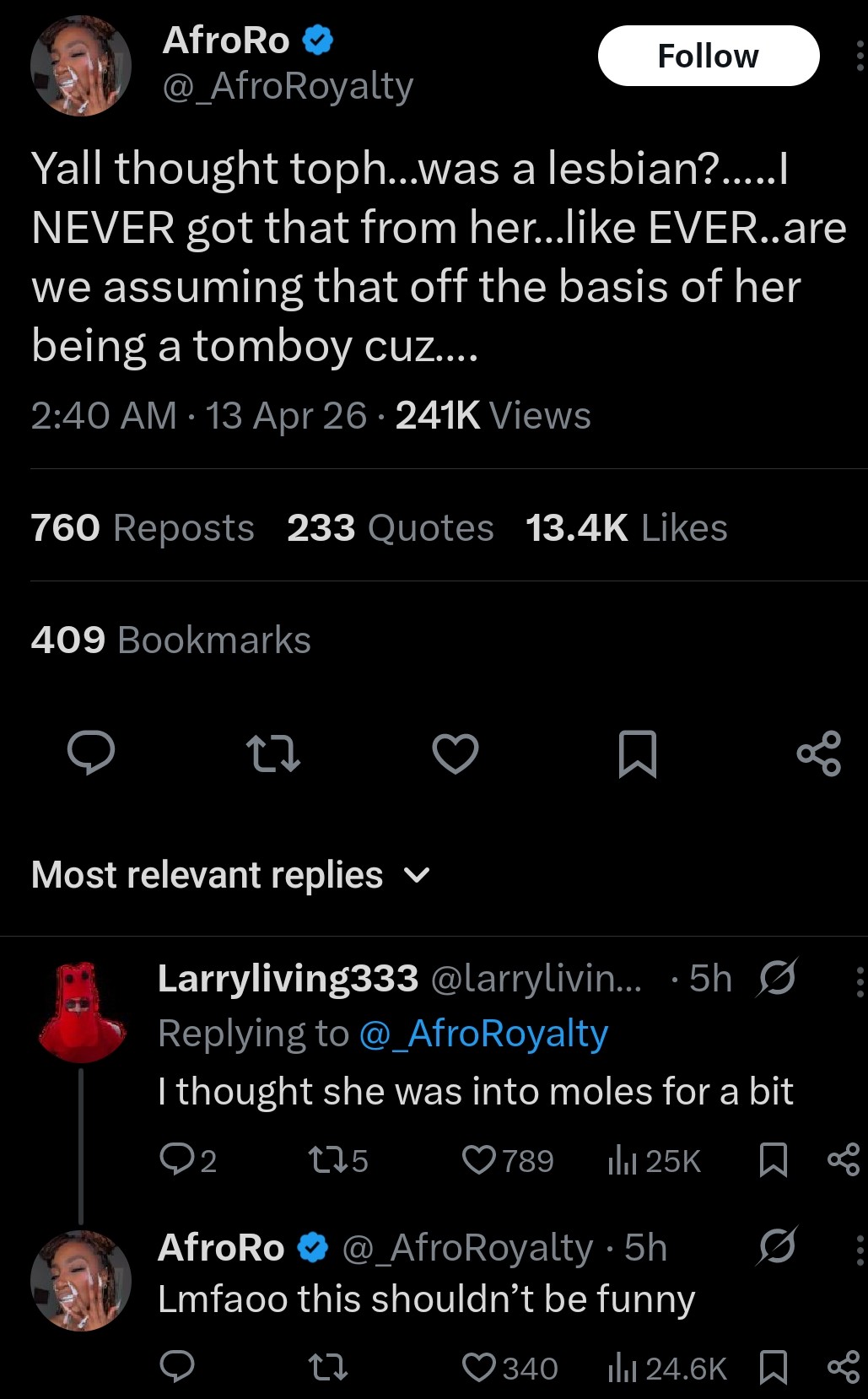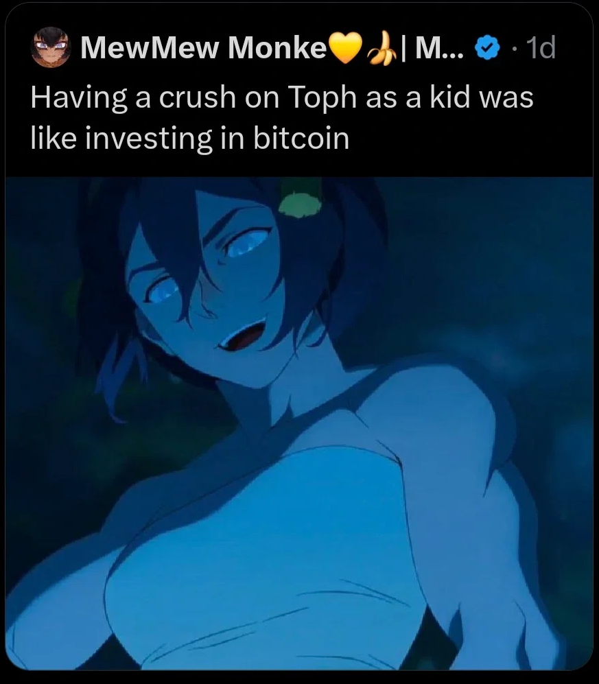 >>153324742This is really the only thing I can think of that people would assume Tooh is a lesbian. In context even them doesn't make sense since she assumed it was Sokka, and even then ask to be let drown finding out it eas Suki. But honestly there js a strong disconnect of people online who see an image and can't even do the bare minimum to look up context. It's fucking retarded but that's the world we live in