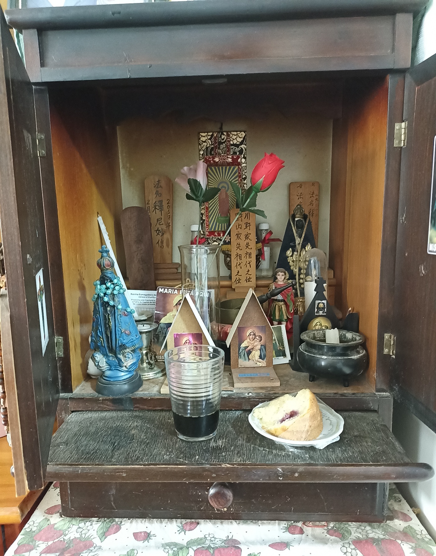 on the topic of christian-japanese syncretism, I have an interesting pic to share. this is a family shrine I asked if I could take a photo of while staying at a friend's house earlier this year. the food was left as an offering.