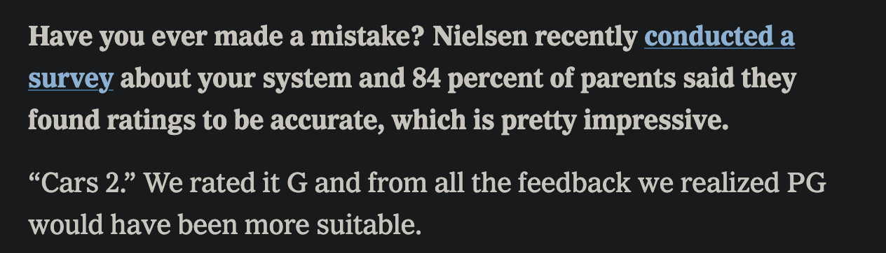 It's still incredibly funny that they asked the lady who'd been rating and later ran the MPAA ratings for 30 years if she had any decisions she regretted and she said "Cars 2"