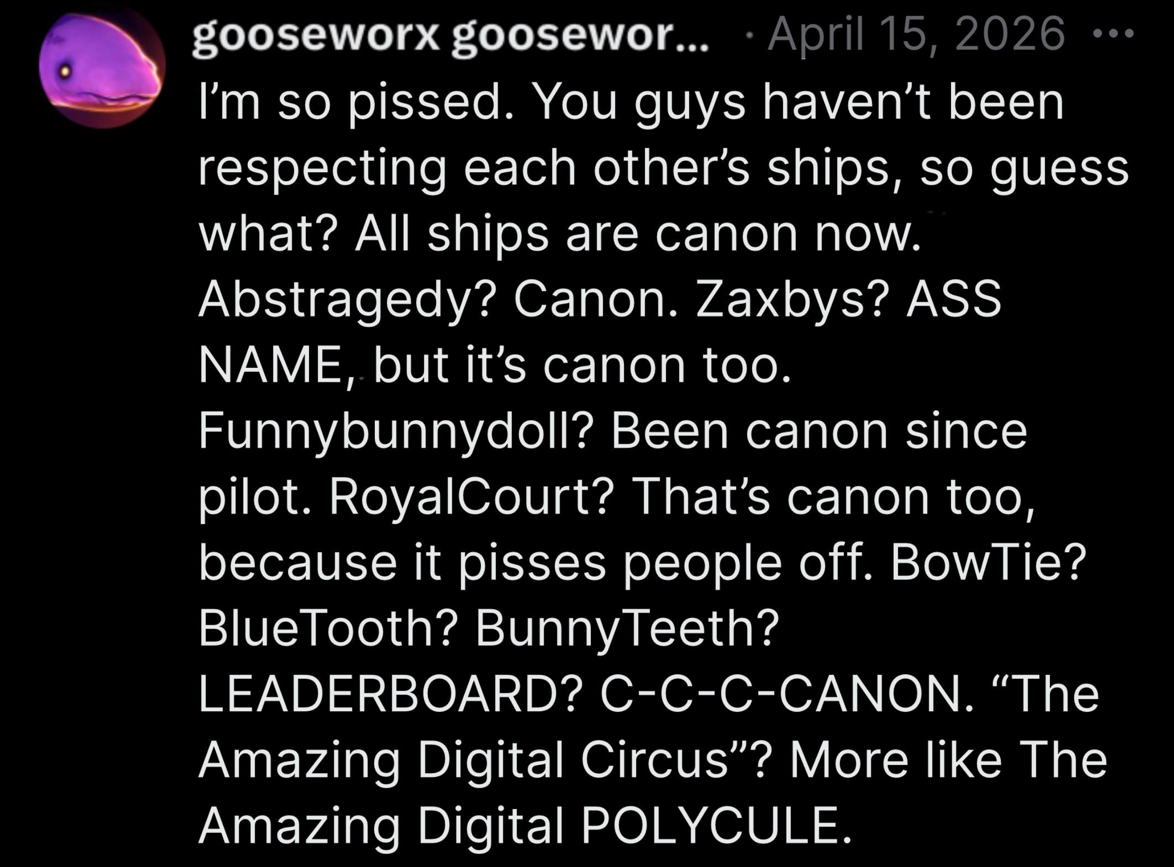 drama TLDR for people who aren't terminally online:>Jax and Zooble's VAs laughed at "nega" sounding like the gamer word on a livestream 7 years ago>Goose was in the chat and also said "nega">Caine's VA tried to defend them but quickly deleted the tweet>Kinger's VA is having disproven grooming allegations dredged back up>the rest of the cast made TADC songs with a guy who allegedly groomed his wife (also disproven)