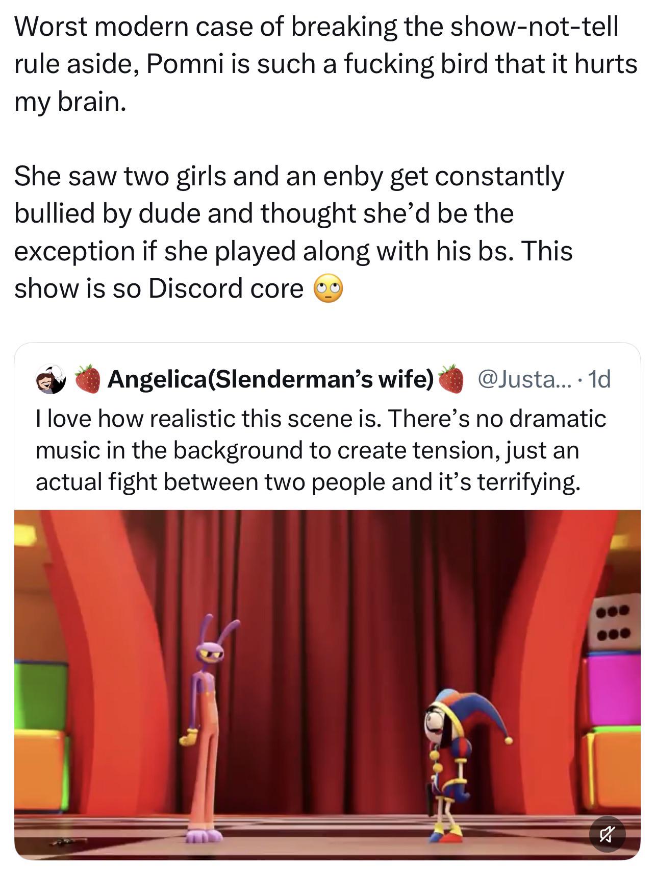 Pomni isn't real. She's actually just Jax's split personality. Everyone woke will insist that this means that Jax is a tranny, even though Jax himself is a man to the very end.