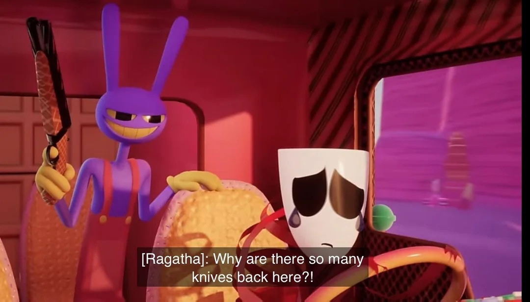 >>153358730But the very things that were making it tolerable were contributing to Caine's crashout. Before Gangle got them into the Fast Food Adventure, Caine wanted yet another horror adventure because, to him, that is what stakes are. Every time they rejected any of his ideas, the crashout got a little closer, but as an AI many of those ideas were legitimately bad fits for human comfort.