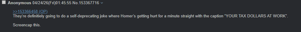 >>153366458They’re definitiely going to do a self-deprecating joke where Homer’s getting hurt for a minute straight with the caption “YOUR TAX DOLLARS AT WORK”.Screencap this.