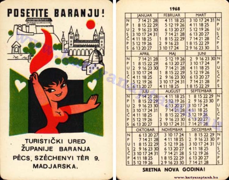 >>153385818>>153387313There's not a lot to it. Pusztai was a commercial artist and many ads, postcards and public service posters used his art. Sometimes he featured Jucika in the ads.This pocket calendar is Croatian I think and promotes tourist spots in Hungary's Baranya county.