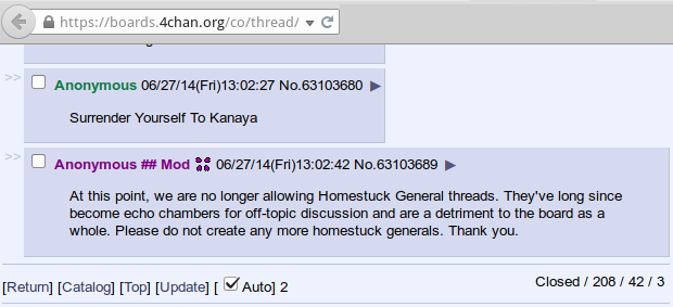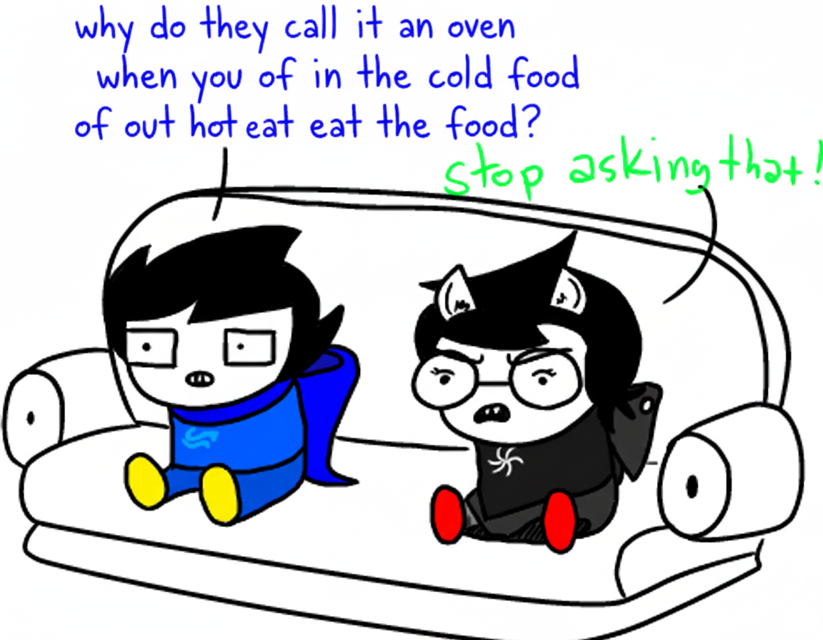 >>153381019What year of hsg are you referring to? If ou're talking 2014 or such you need to let it goAs of now, homestuck deserves a general due to it sporadic dubiously canon updates, but it's of course gonna be slow