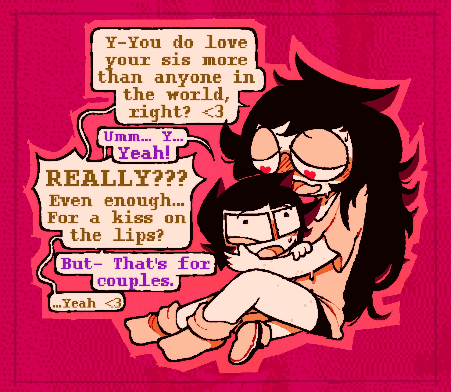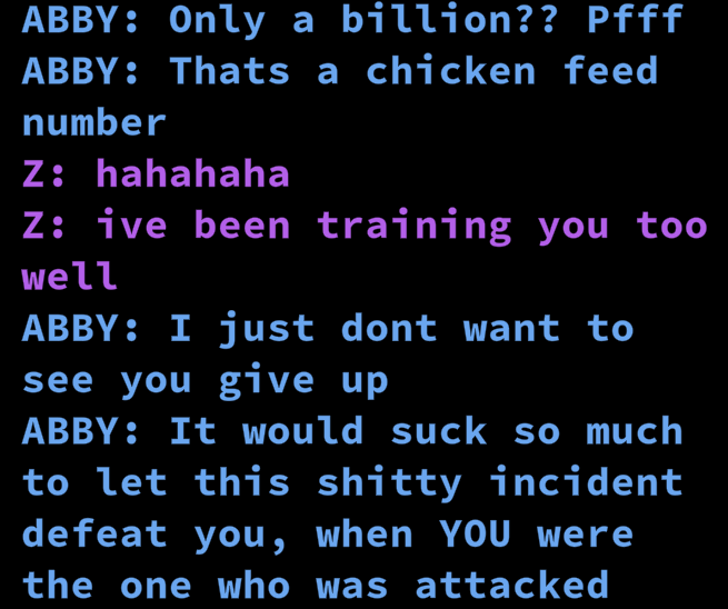 >>153397798............ no. you see i already have problems with identidy and delusions. i really dont need it again. also sadly i kinda already inspired her dialogue in the later pages? wich made me really self concious. didnt help even my friends said im like her. so i think the more i distance myself from this character, it will be better for me. i like to think she is my friend, rather than being me. because im not good, and she is a good troll. i'm real and she is not. she should not mix with me. that is it for now.