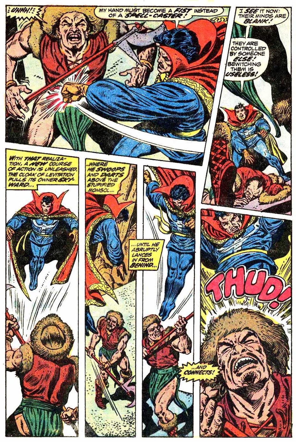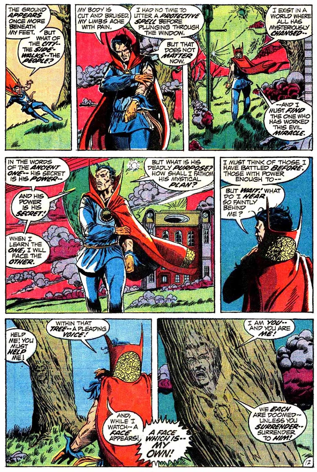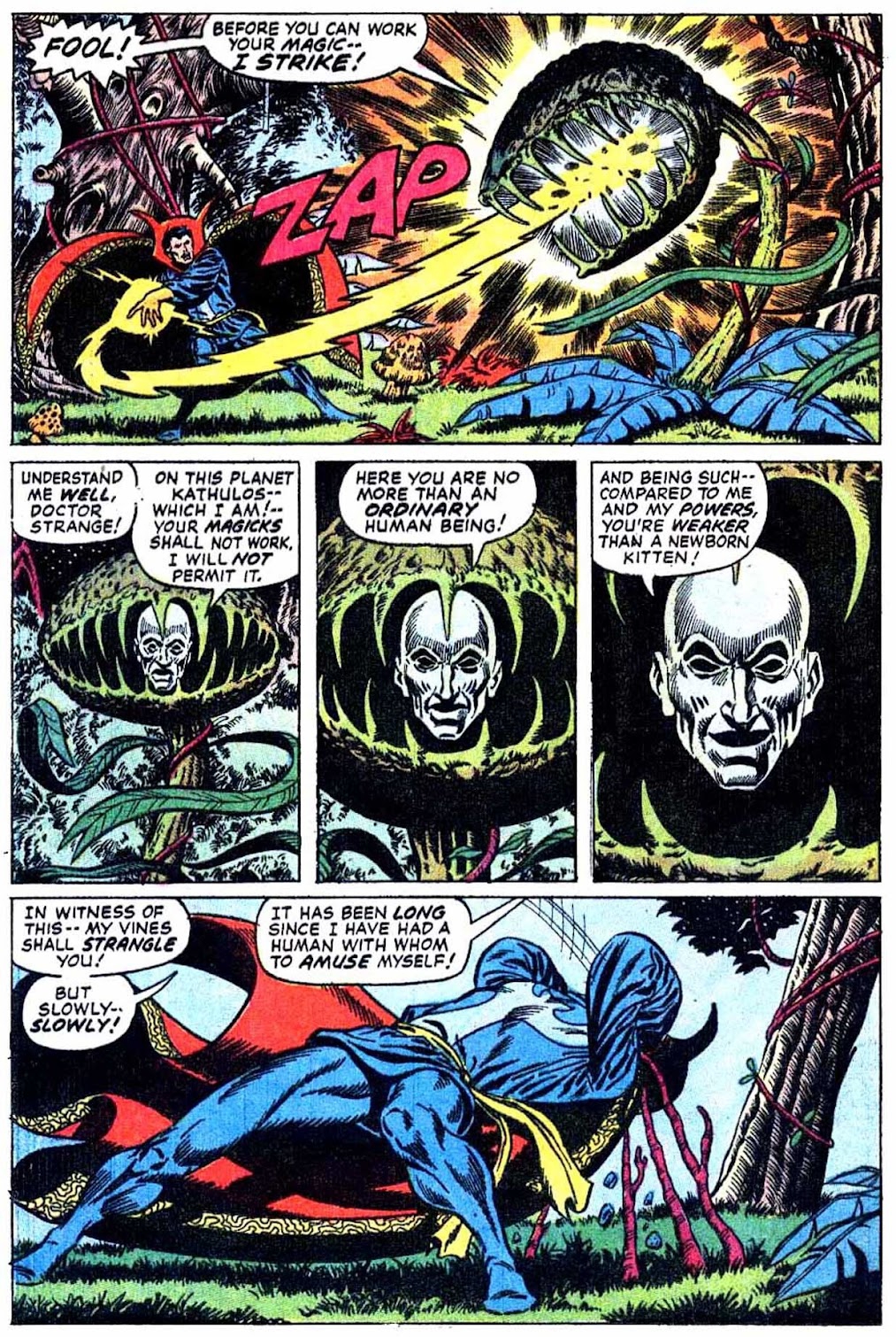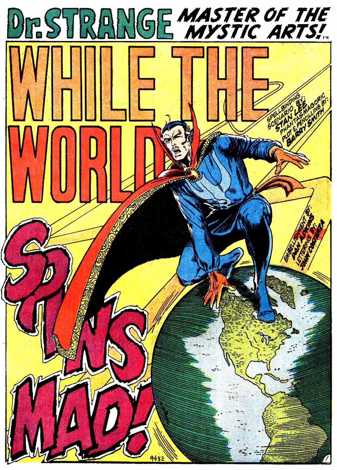 For some context as to why the cover is proudly proclaiming that Dr. Strange "lives again:" this is Strange's first purely solo story in nearly two and a half years. Strange had been relegated mostly to a supporting role on the newly-formed Defenders from July 1969 'til now, and his most recent solo appearances involved him donning a mask and trying to change his name to Stephen Sanders in a failed attempt at giving him a secret identity. (Despite Dr. Strange making prolific use of memory-wiping powers around this era.) Since the character only debuted in April 1963, a break that long was a pretty big deal at the time.The title of this story really is "While the World Spins Mad!", by the way, despite the cover insisting otherwise. Anyways, this splash page is mostly unrelated to the rest of this story...