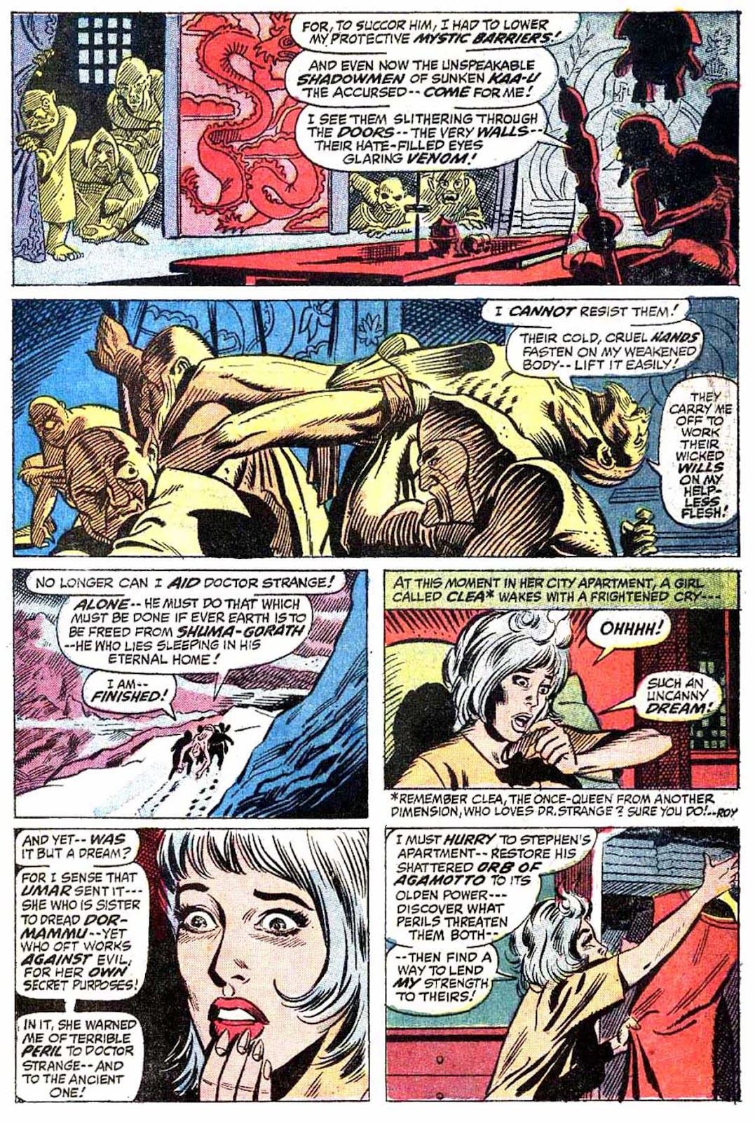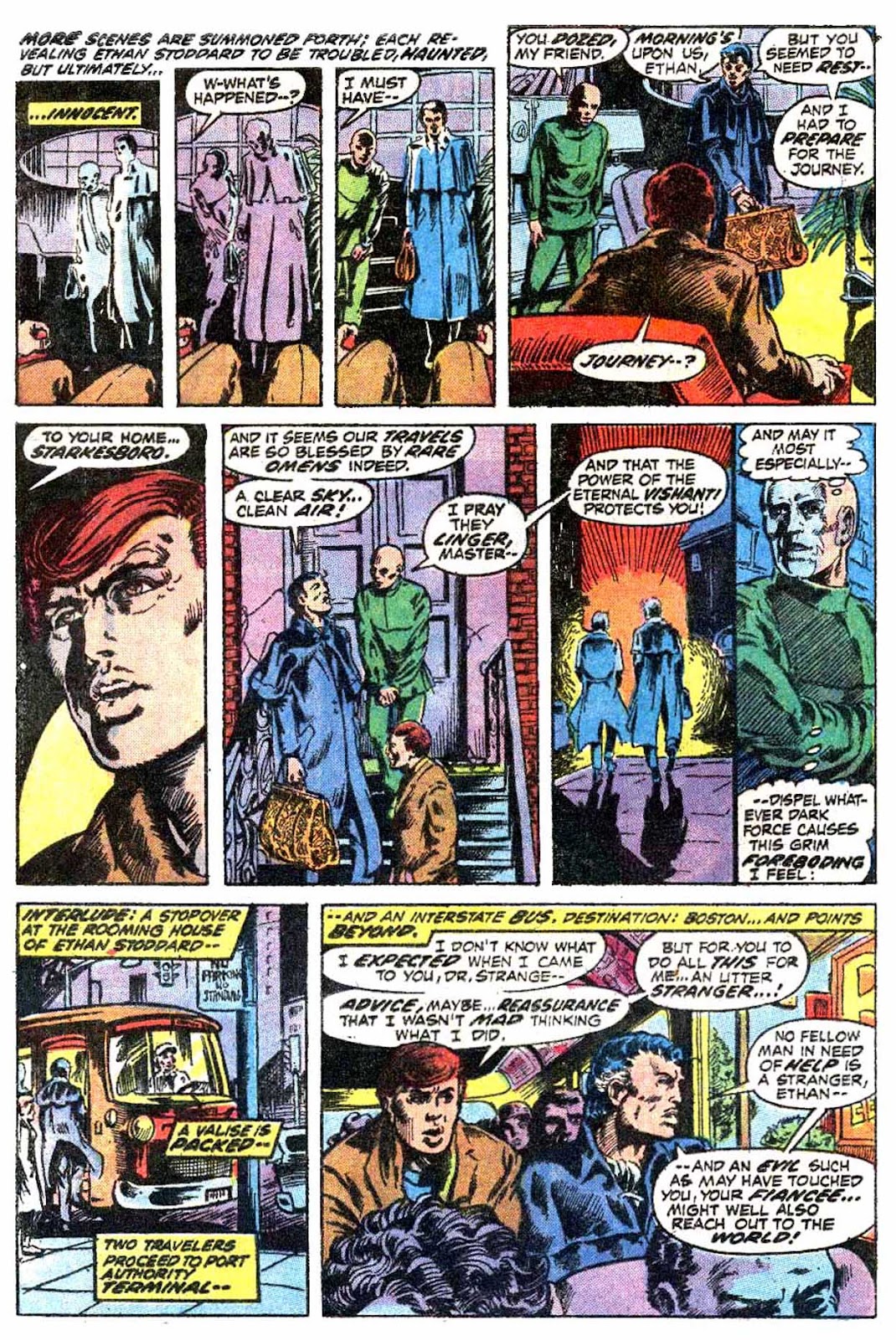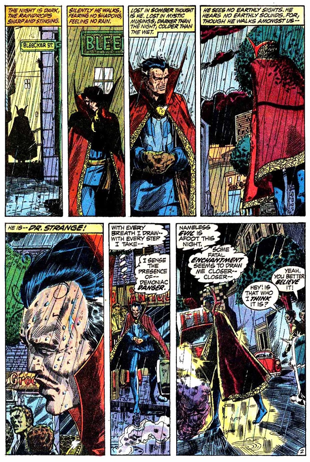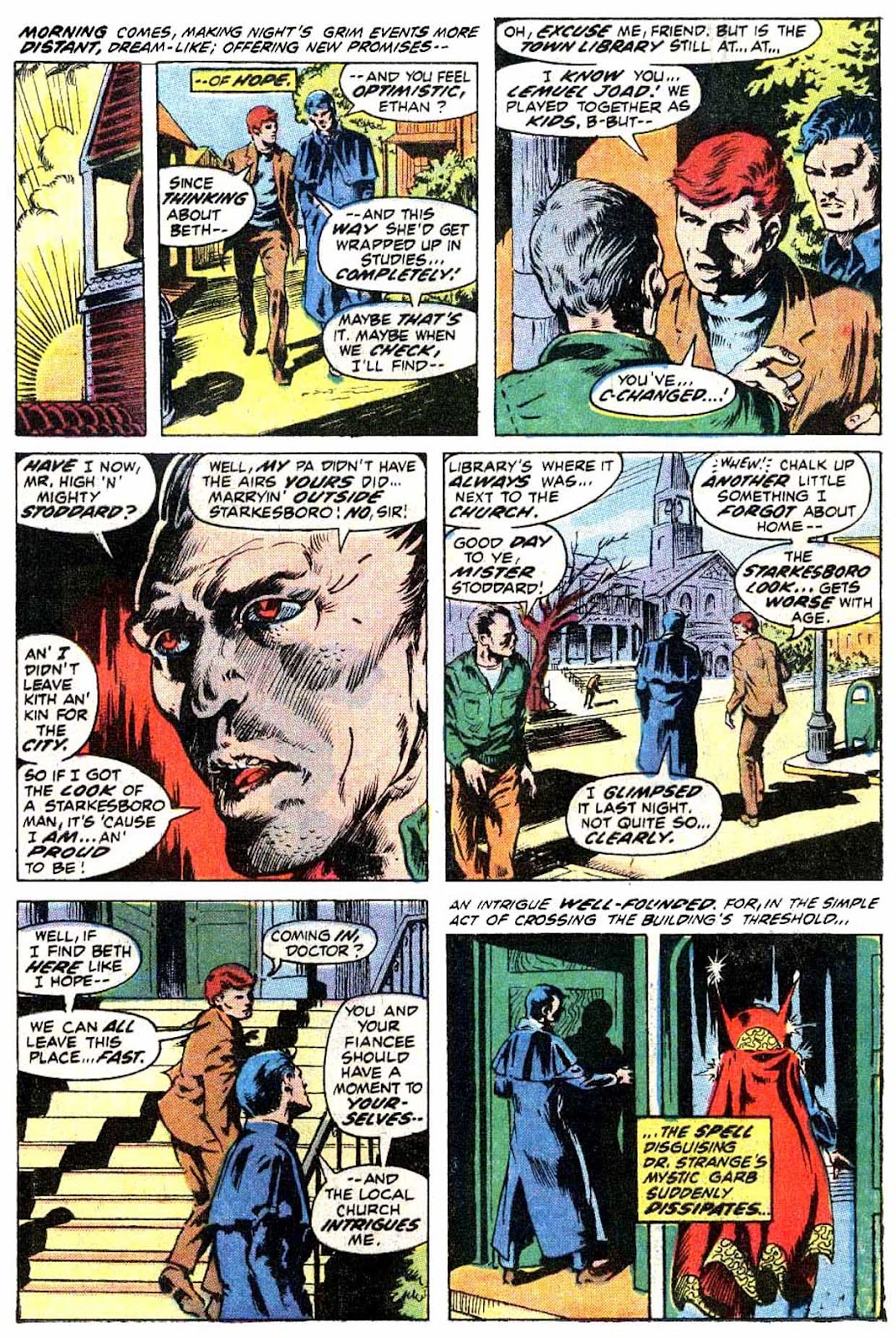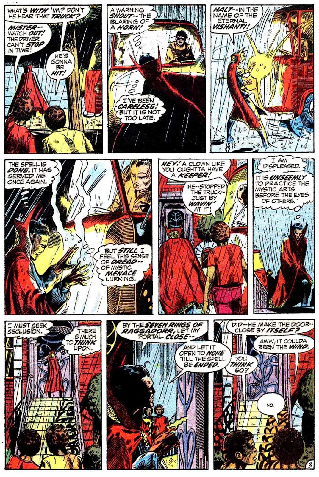 Another lost habit of Strange's: the man used to disguise his caped outfit while out and about with a simple glamor. I'm halfway certain that Ditko started this, but I think it was inconsistently done up until this very issue (as you can see in issue #3, where Strange is walking around in his cape completely undisguised). After this, I'm pretty sure it became a relatively constant trait of his through to Peter Gillis's run. I guess it became kind of redundant with Marvel's "superheroes as celebrities" angle from the 2000s onwards.