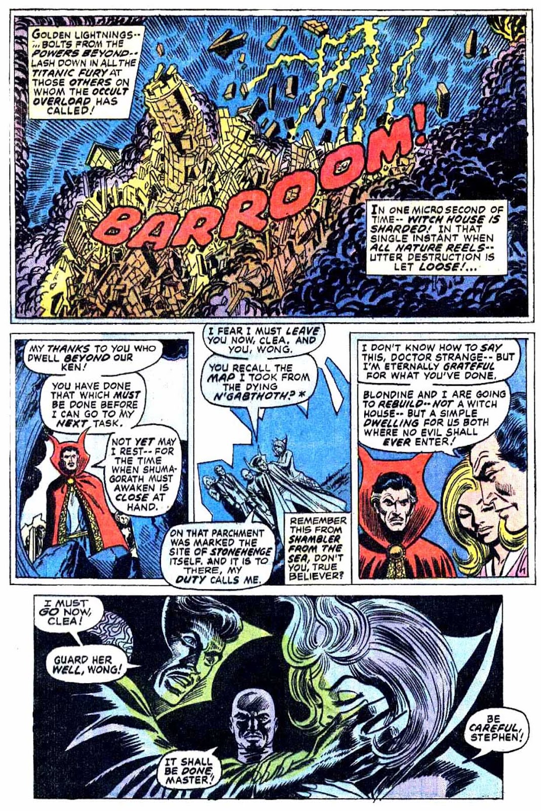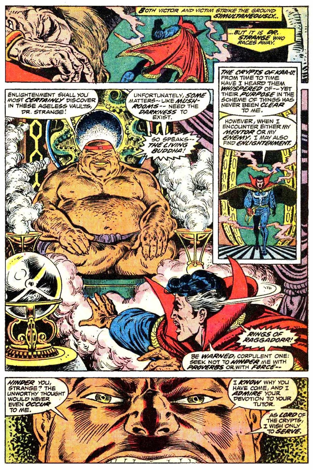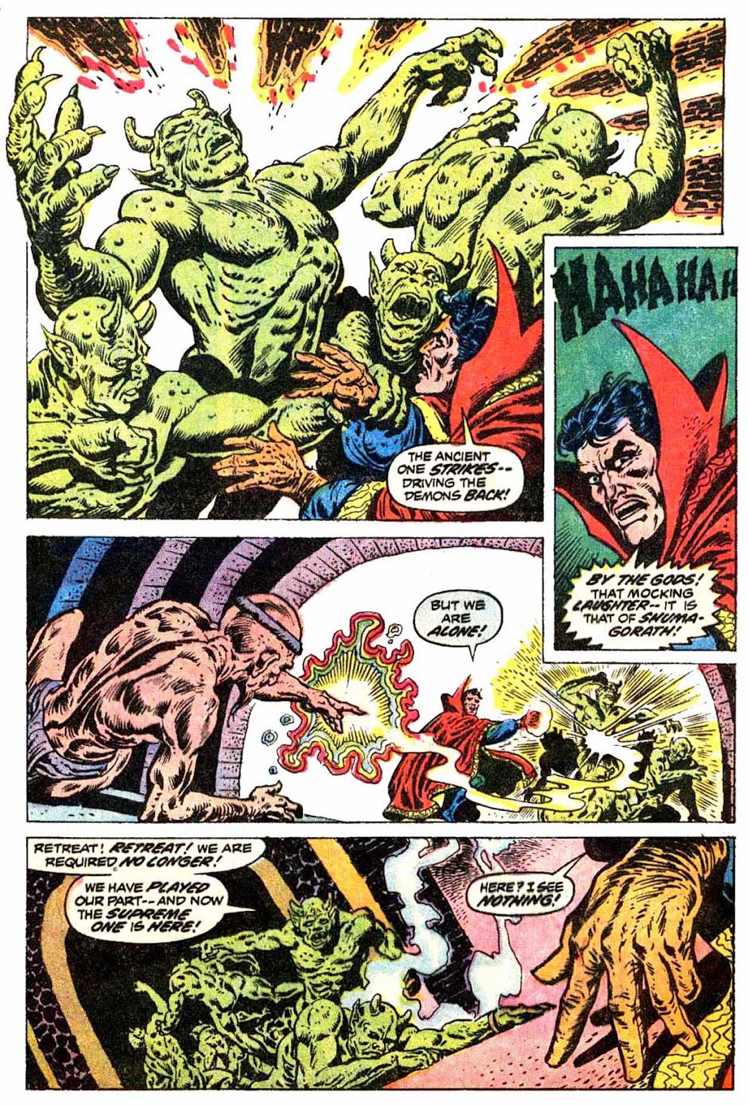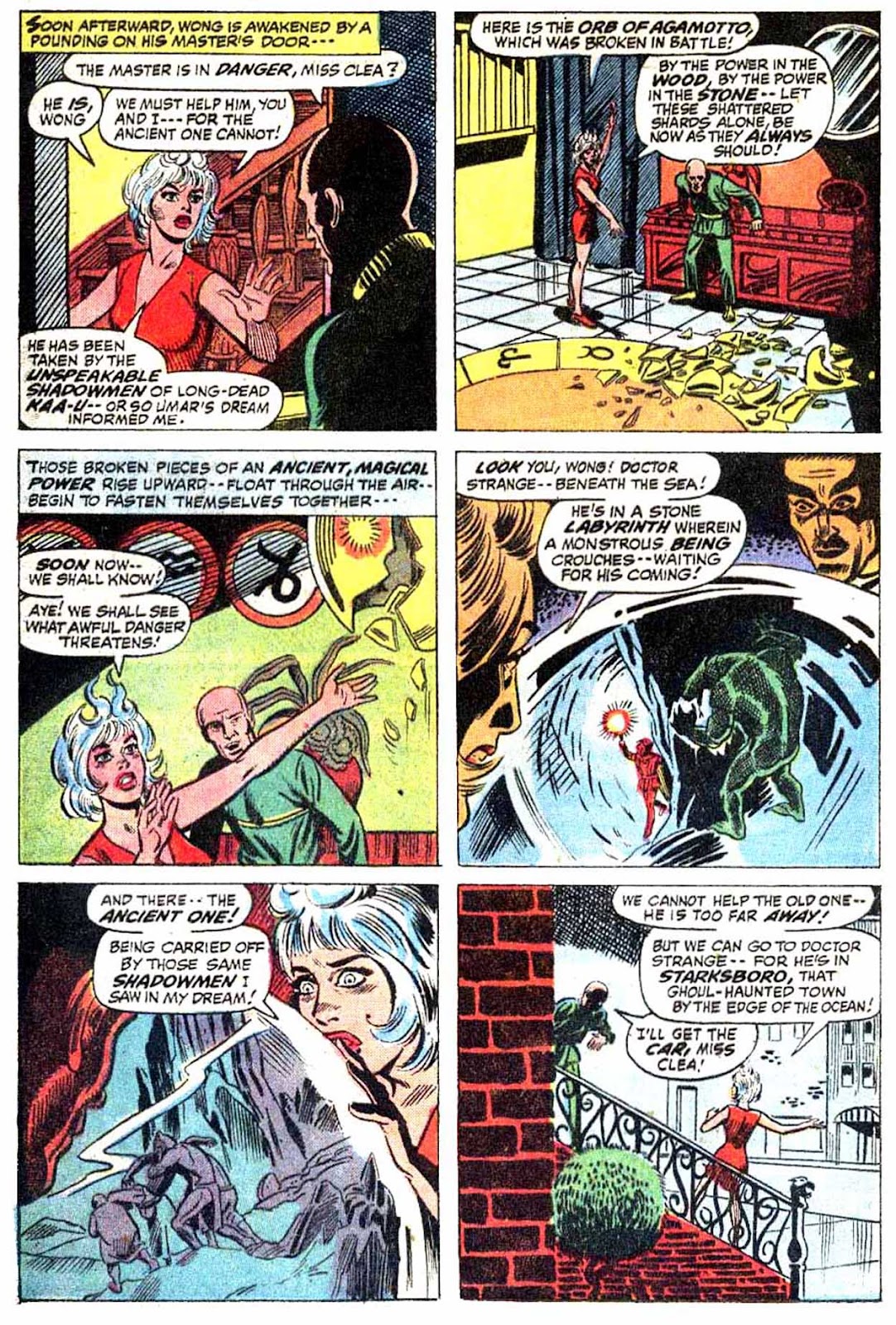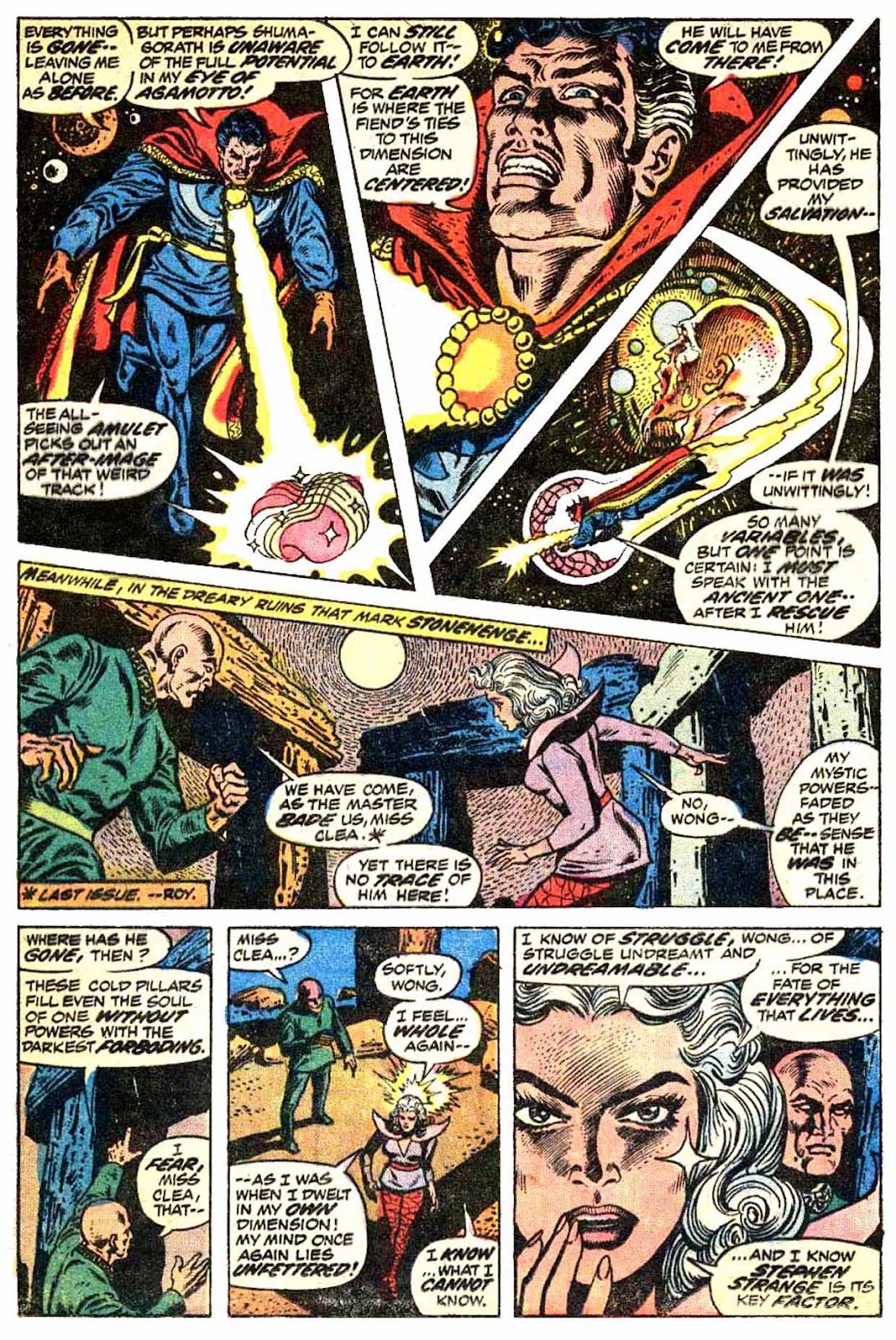 If I've got my chronology right, this is the very first appearance of the term "Sorcerer Supreme"! It's purely an Englehart thing, from what I understand-- Gerber never touched upon it around the same time, and neither Ditko nor Thomas ever brought it up. The Ancient One was always Strange's superior, but it was never so directly stated as it is here.