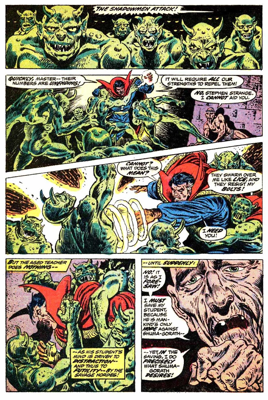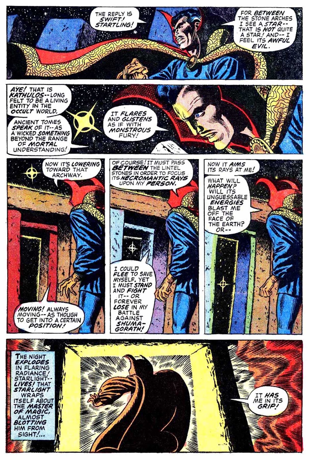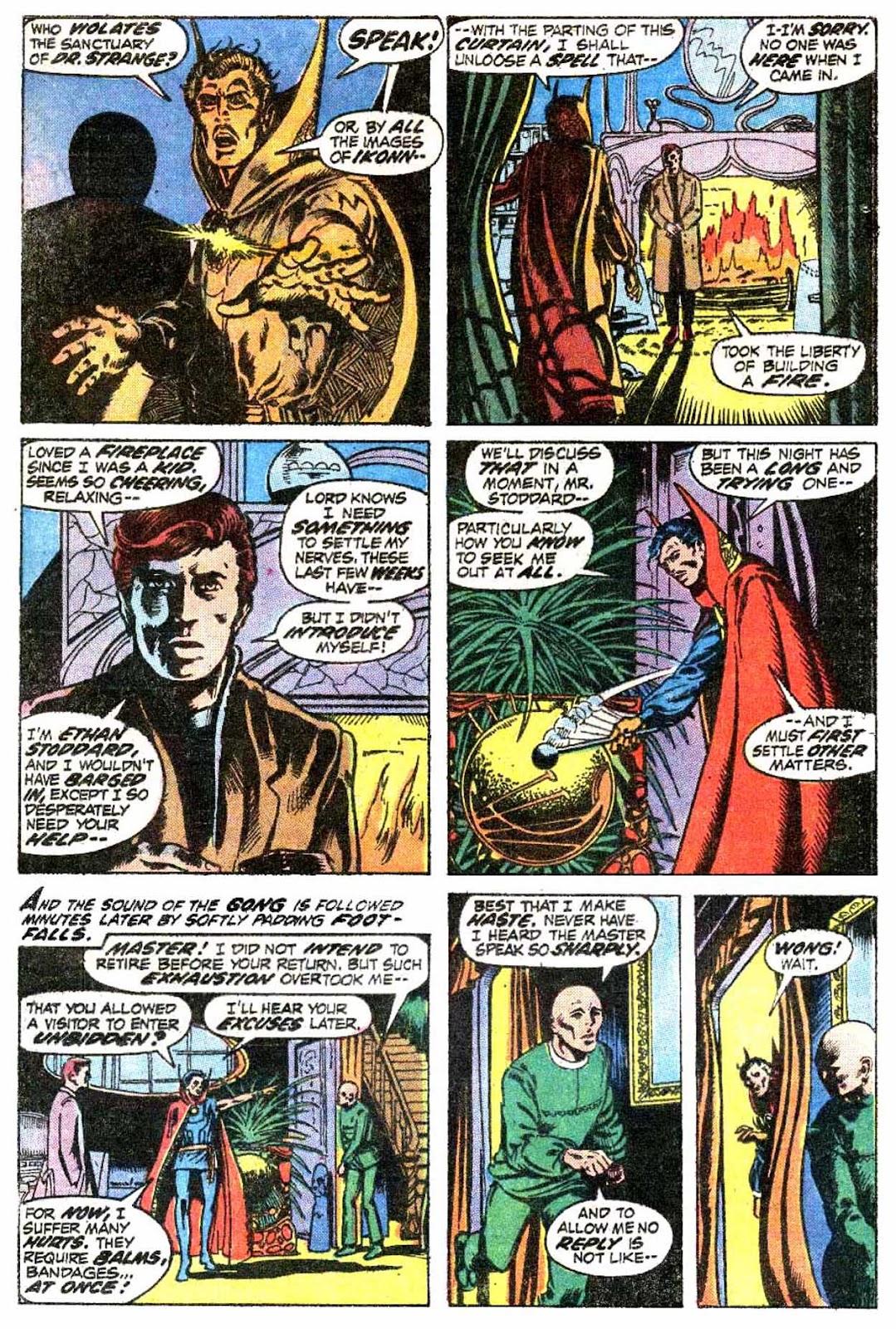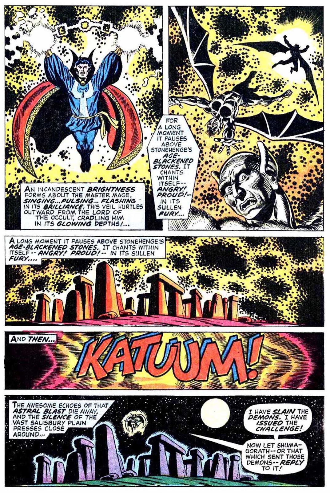 If I've got my chronology right, this is the very first appearance of the term "Sorcerer Supreme"! It's purely an Englehart thing, from what I understand-- Gerber never touched upon it around the same time, and neither Ditko nor Thomas ever brought it up. The Ancient One was always Strange's superior, but it was never so directly stated as it is here.