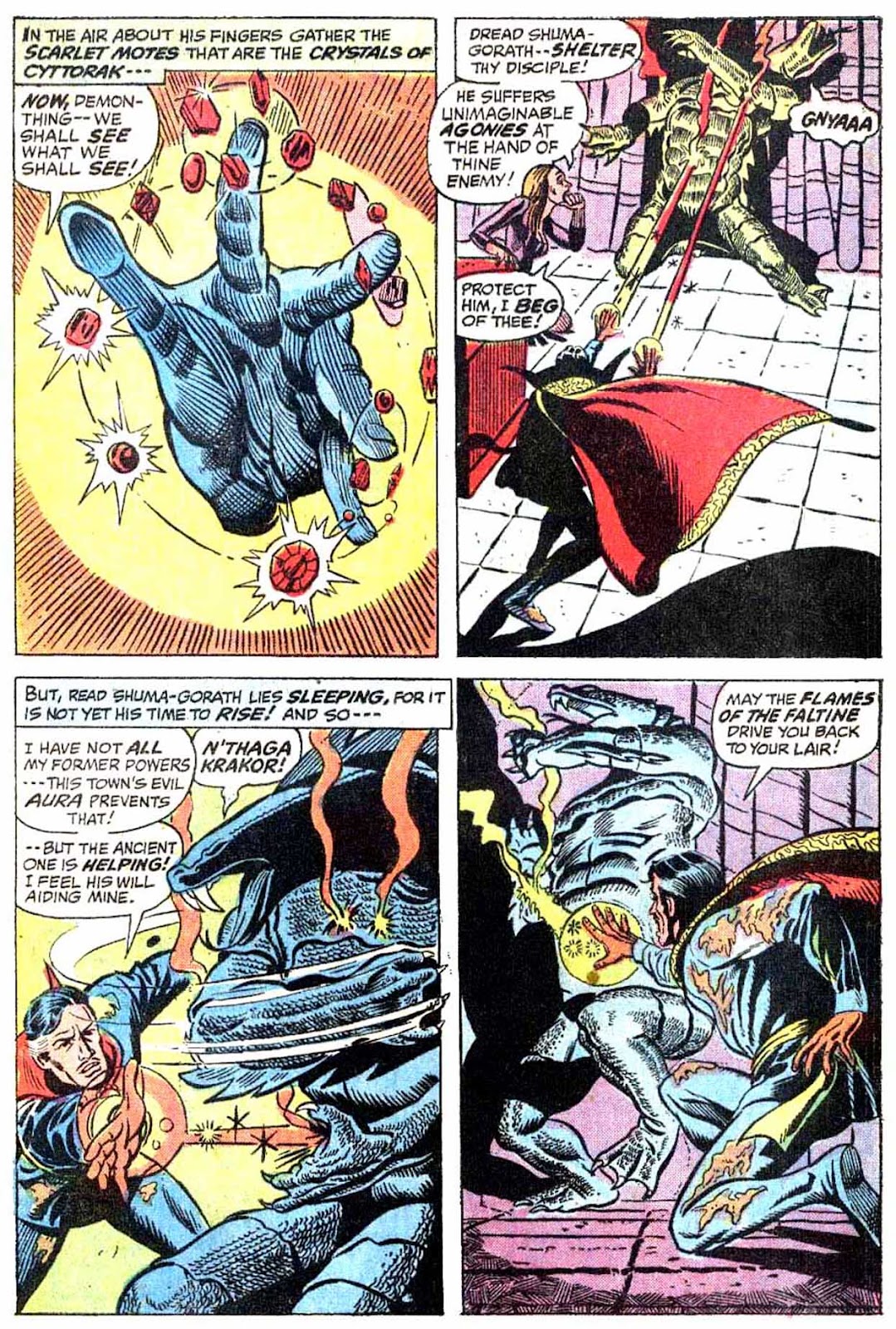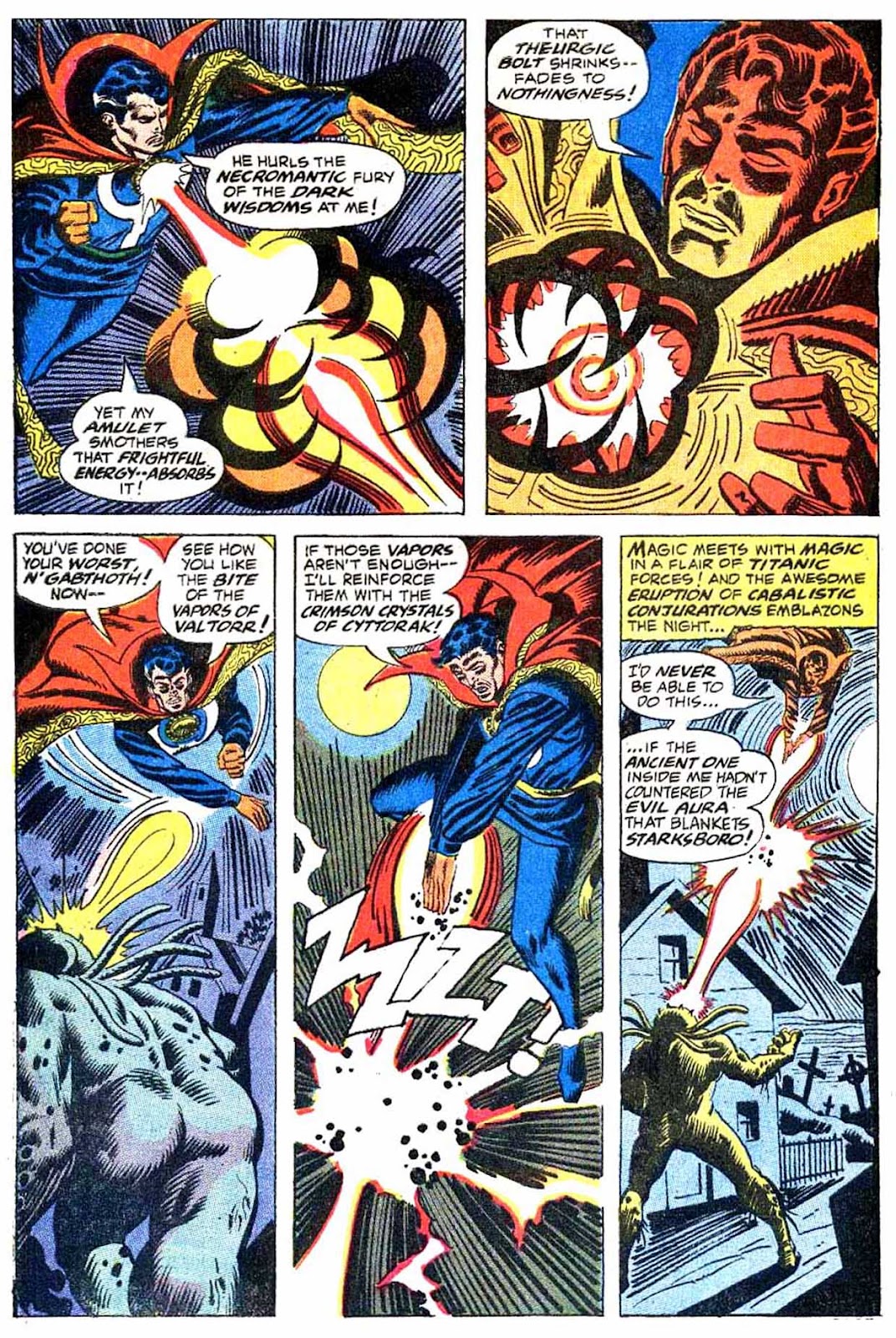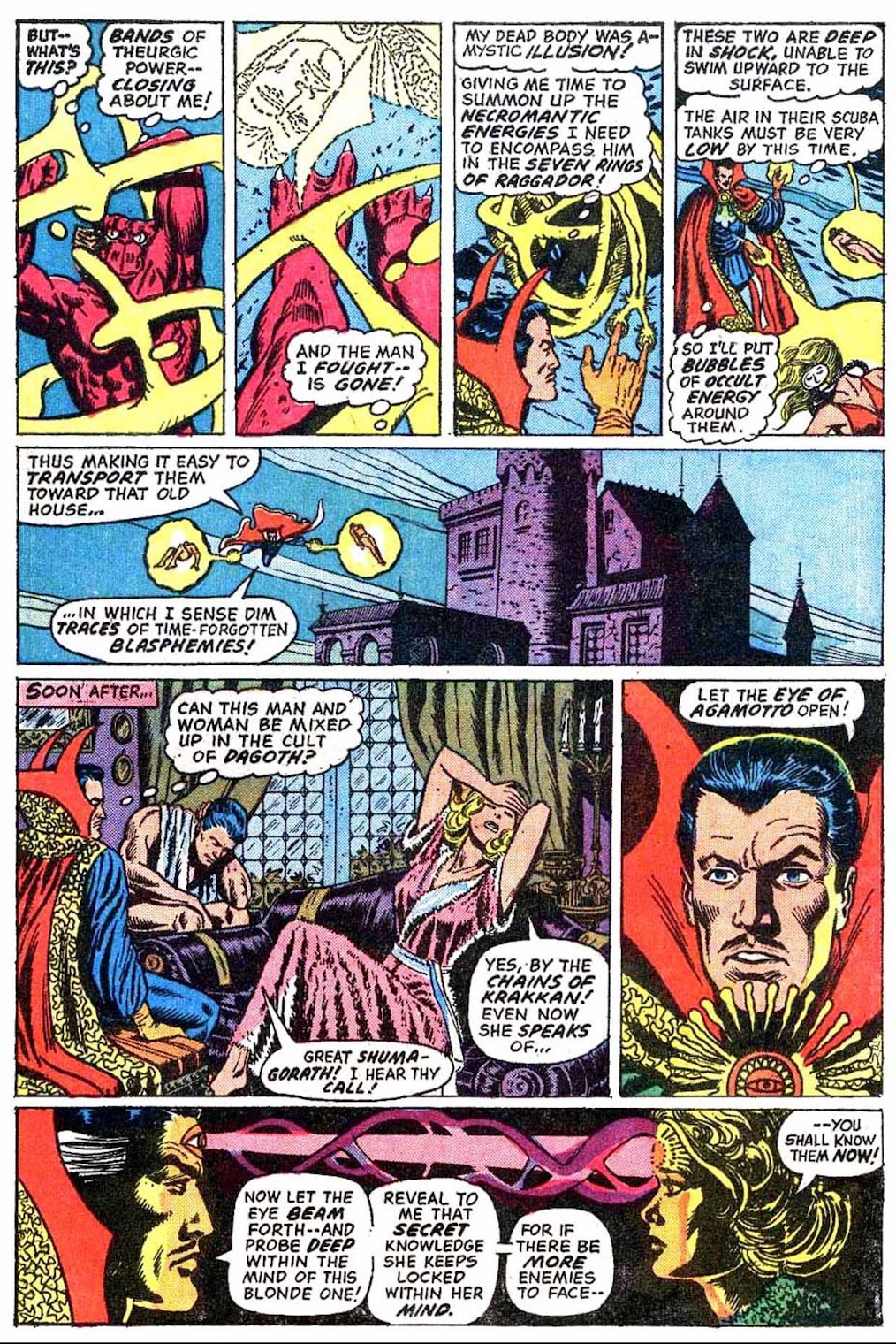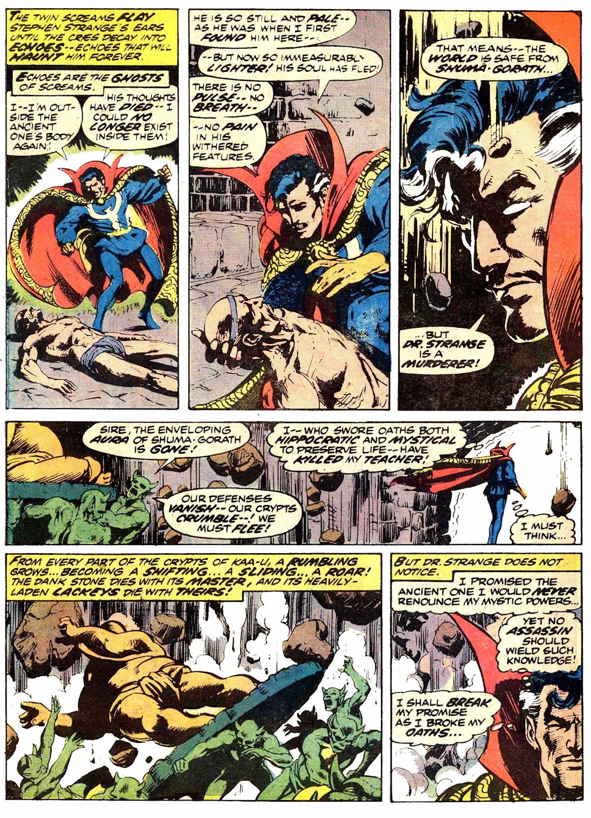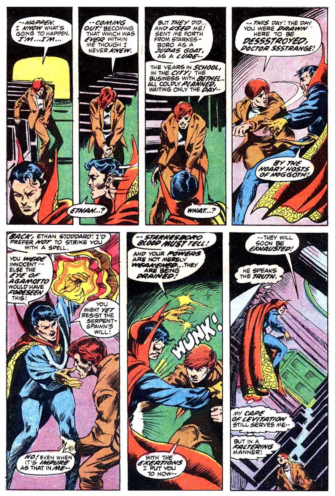 If I've got my chronology right, this is the very first appearance of the term "Sorcerer Supreme"! It's purely an Englehart thing, from what I understand-- Gerber never touched upon it around the same time, and neither Ditko nor Thomas ever brought it up. The Ancient One was always Strange's superior, but it was never so directly stated as it is here.