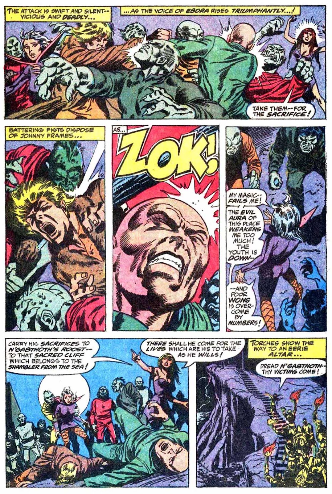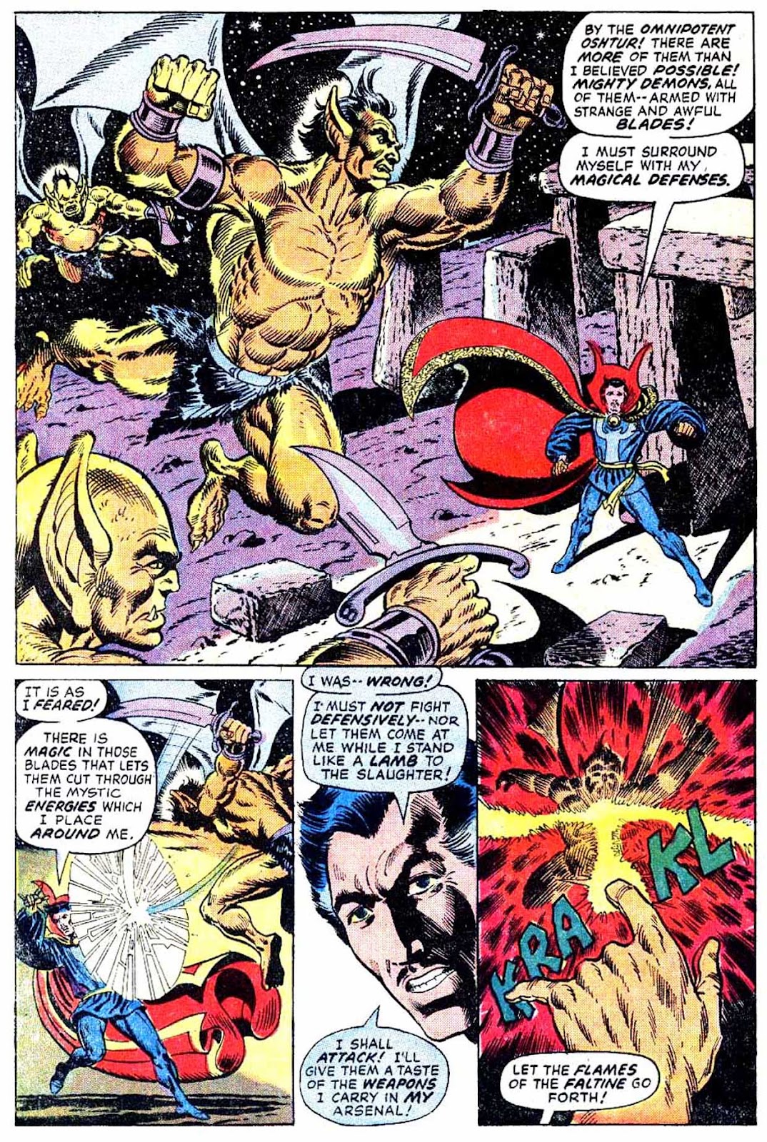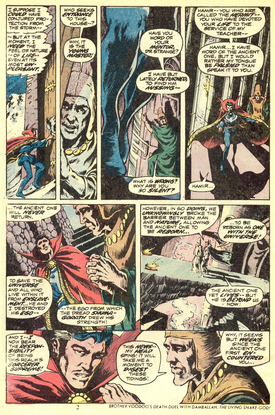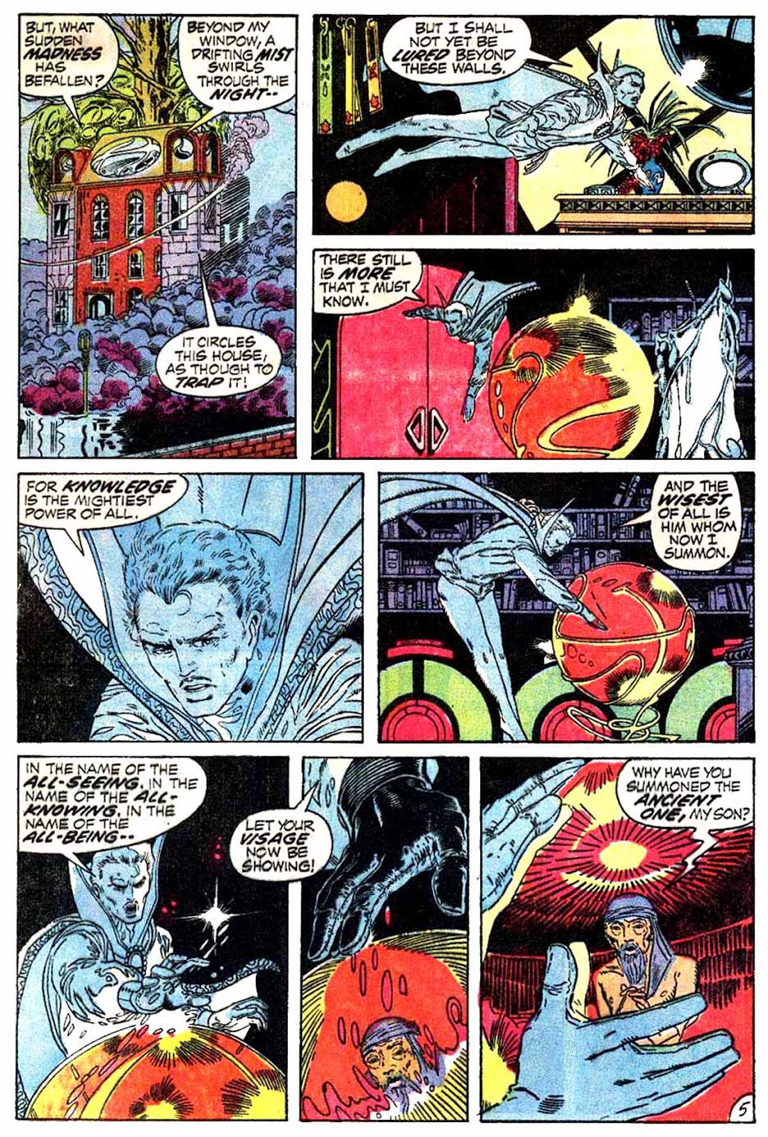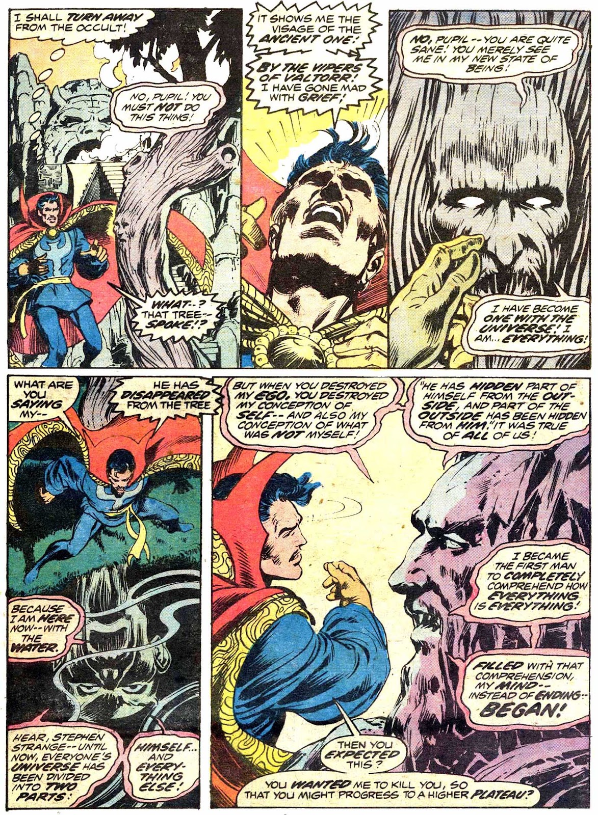 If I've got my chronology right, this is the very first appearance of the term "Sorcerer Supreme"! It's purely an Englehart thing, from what I understand-- Gerber never touched upon it around the same time, and neither Ditko nor Thomas ever brought it up. The Ancient One was always Strange's superior, but it was never so directly stated as it is here.