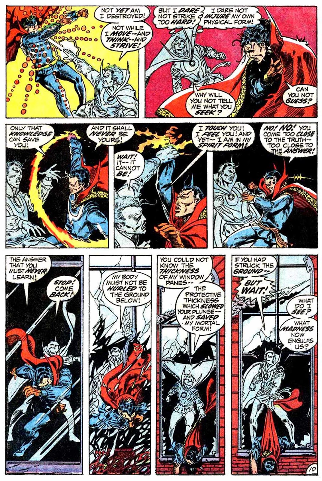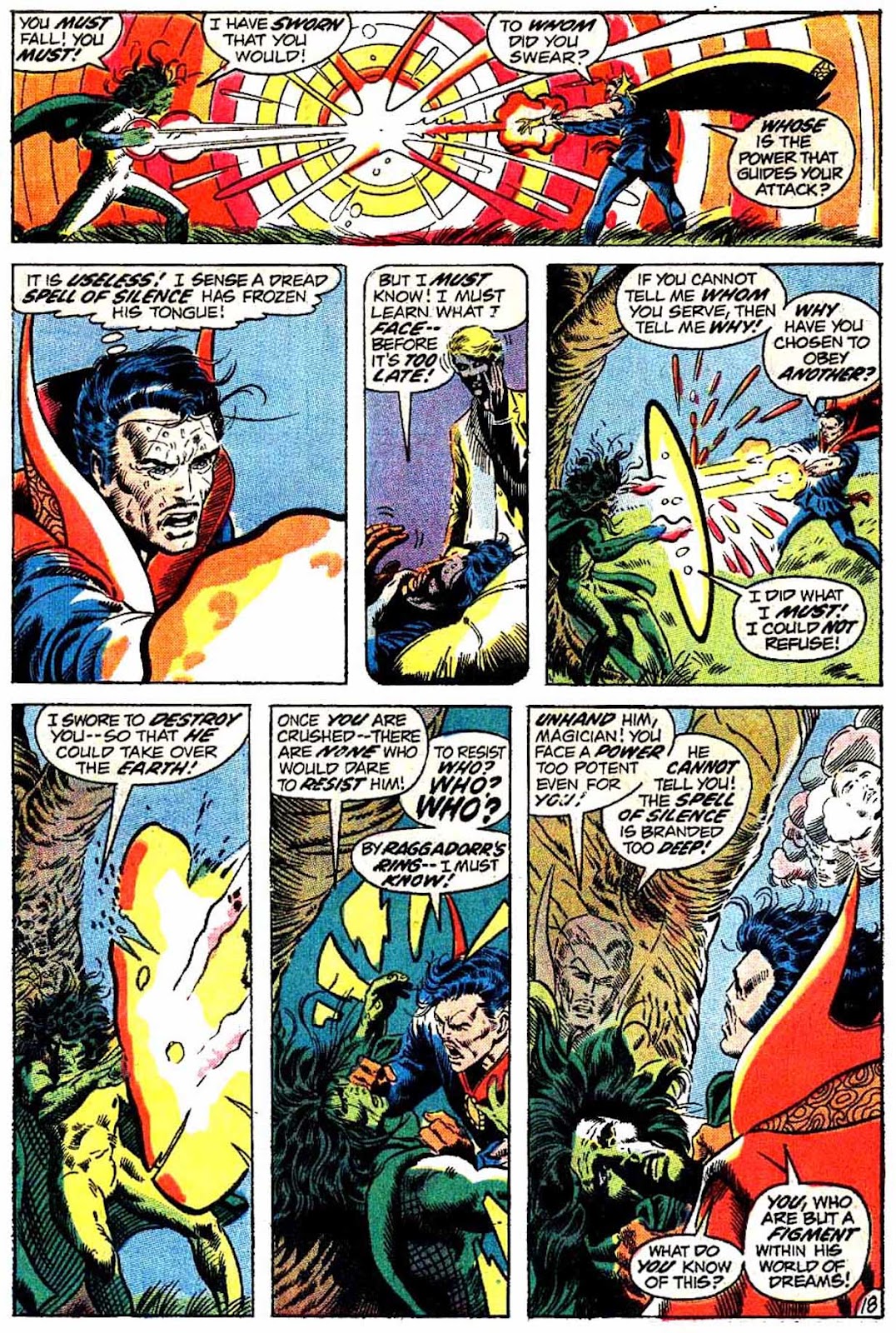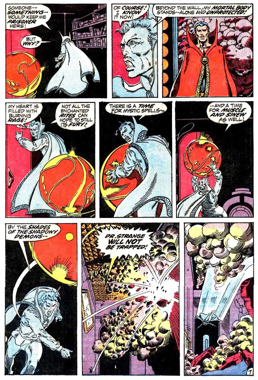 Another trick that Dr. Strange used to employ plentifully: illusions, specifically of himself. He didn't always use them like he does here, generally preferring to split himself into tens of different "selves" as opposed to Gardner's get-out-of-jail-free card, but they used to be one of his main implements. I'm not sure why they stopped being used. They were prominent even into the Stern years, though I think Gillis eased off on them quite a lot. I don't think I've seen them in a single comic published past the 90s.