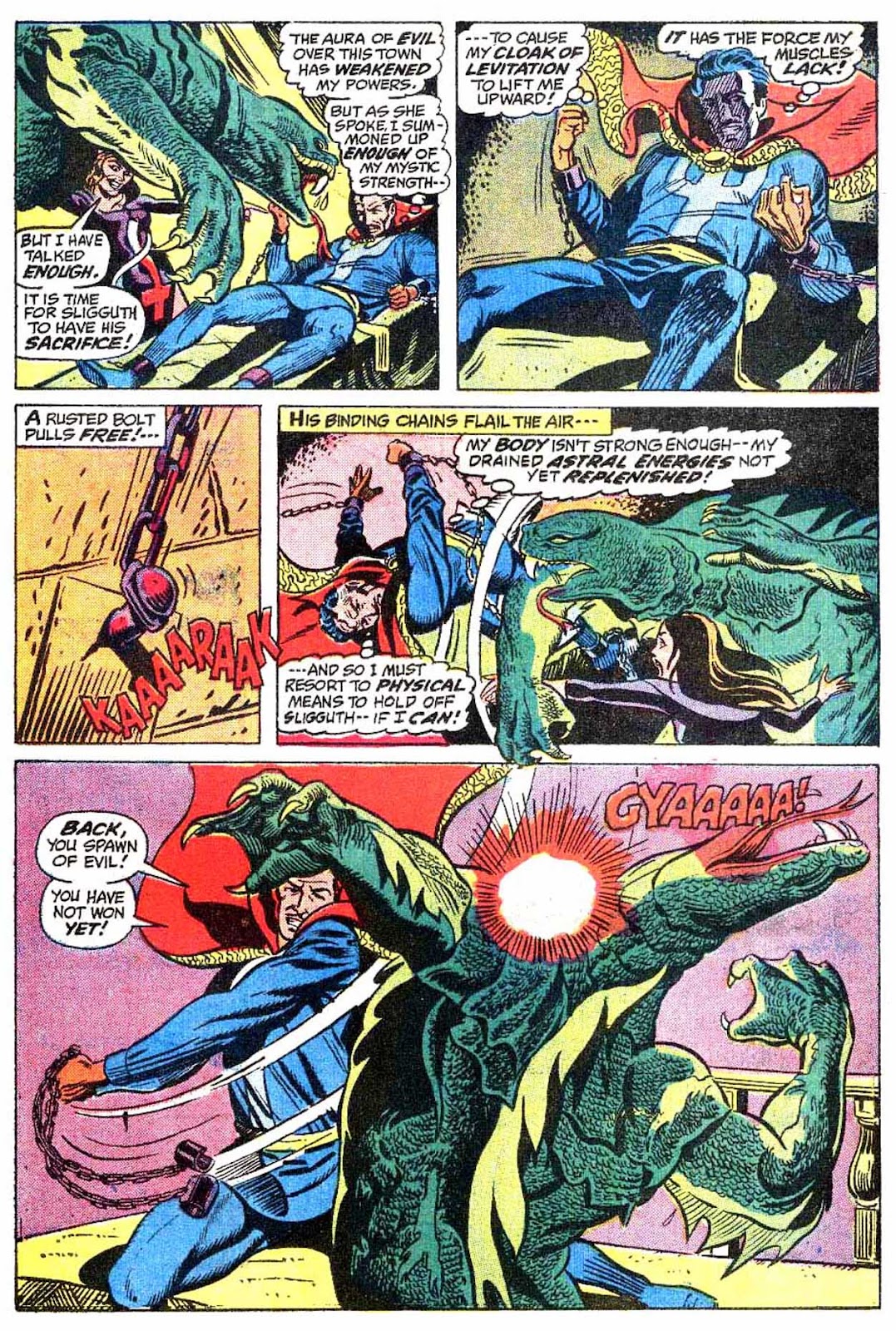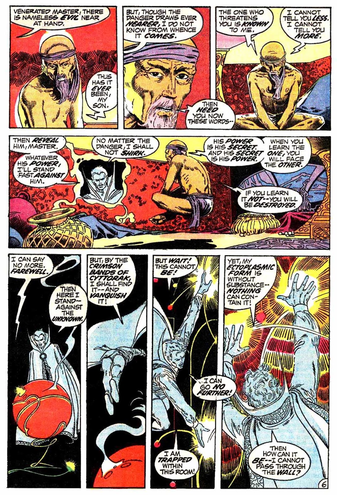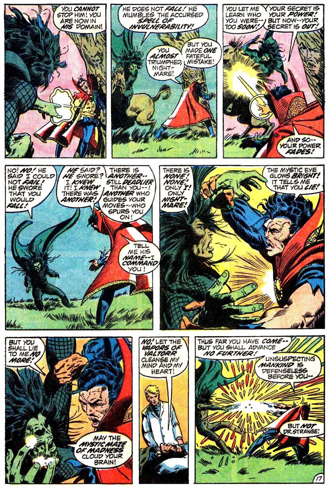 Another trick that Dr. Strange used to employ plentifully: illusions, specifically of himself. He didn't always use them like he does here, generally preferring to split himself into tens of different "selves" as opposed to Gardner's get-out-of-jail-free card, but they used to be one of his main implements. I'm not sure why they stopped being used. They were prominent even into the Stern years, though I think Gillis eased off on them quite a lot. I don't think I've seen them in a single comic published past the 90s.