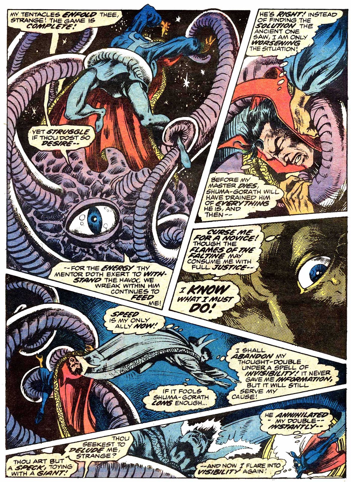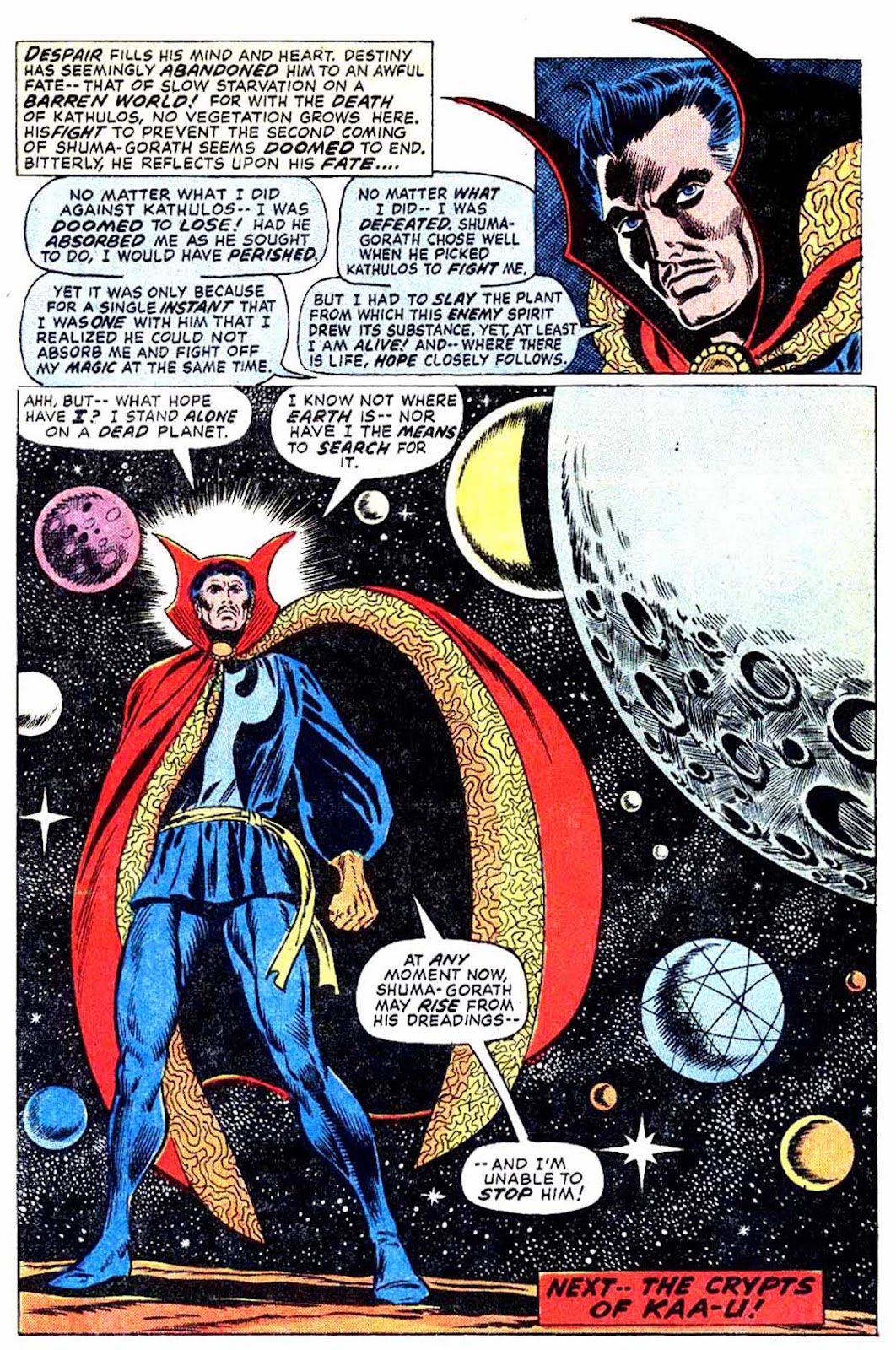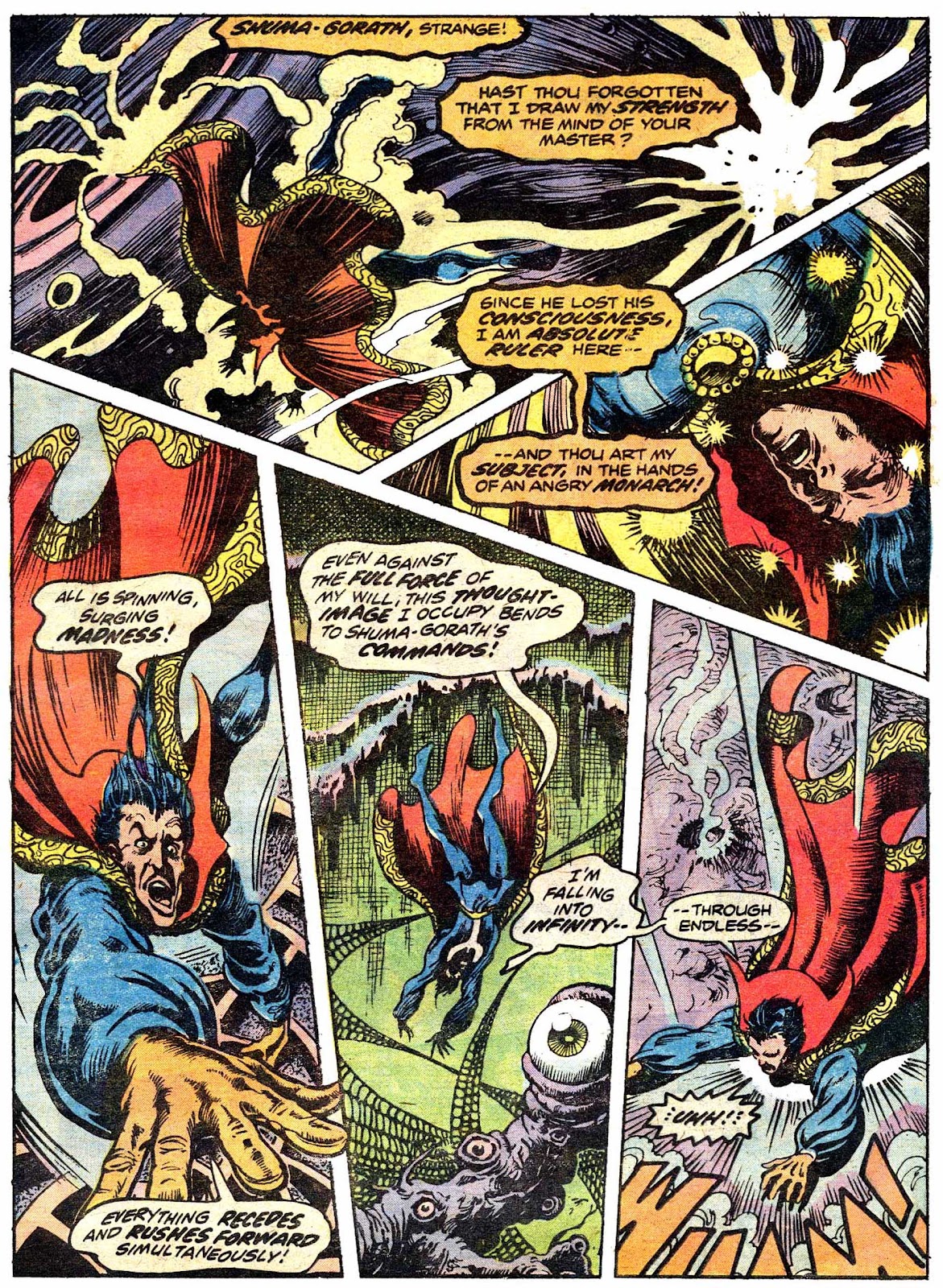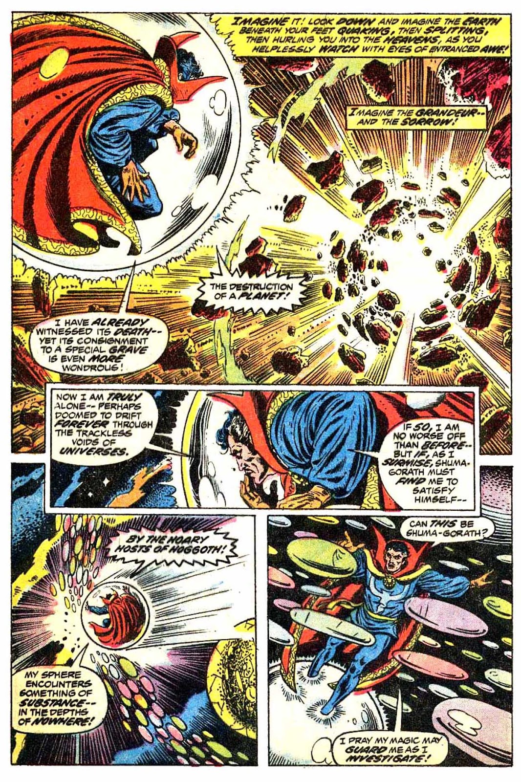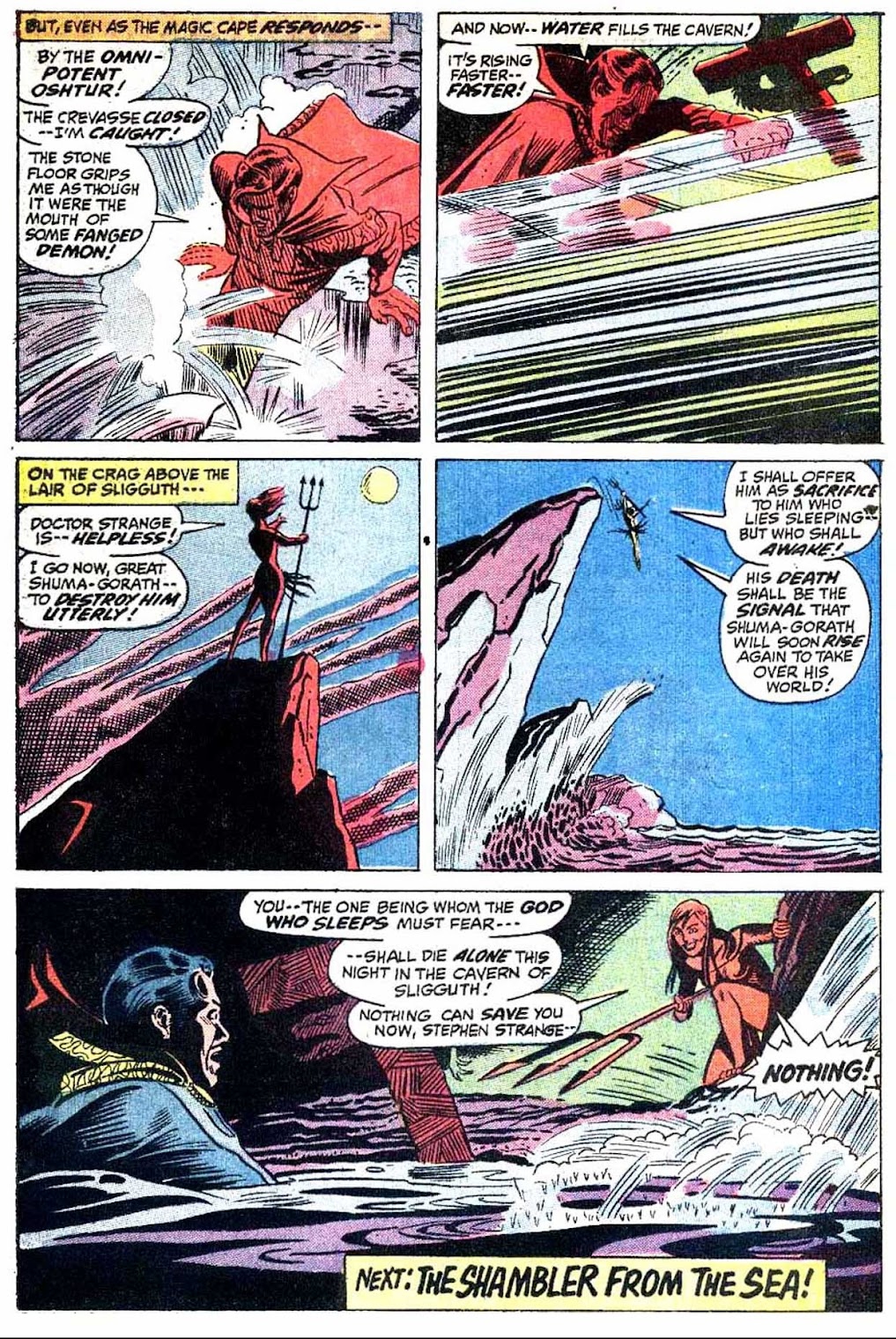 Shuma-Gorath realizes what Strange has done... and even he is intimidated! As he approaches his destination, the master of the mystic arts is wracked with apprehension...