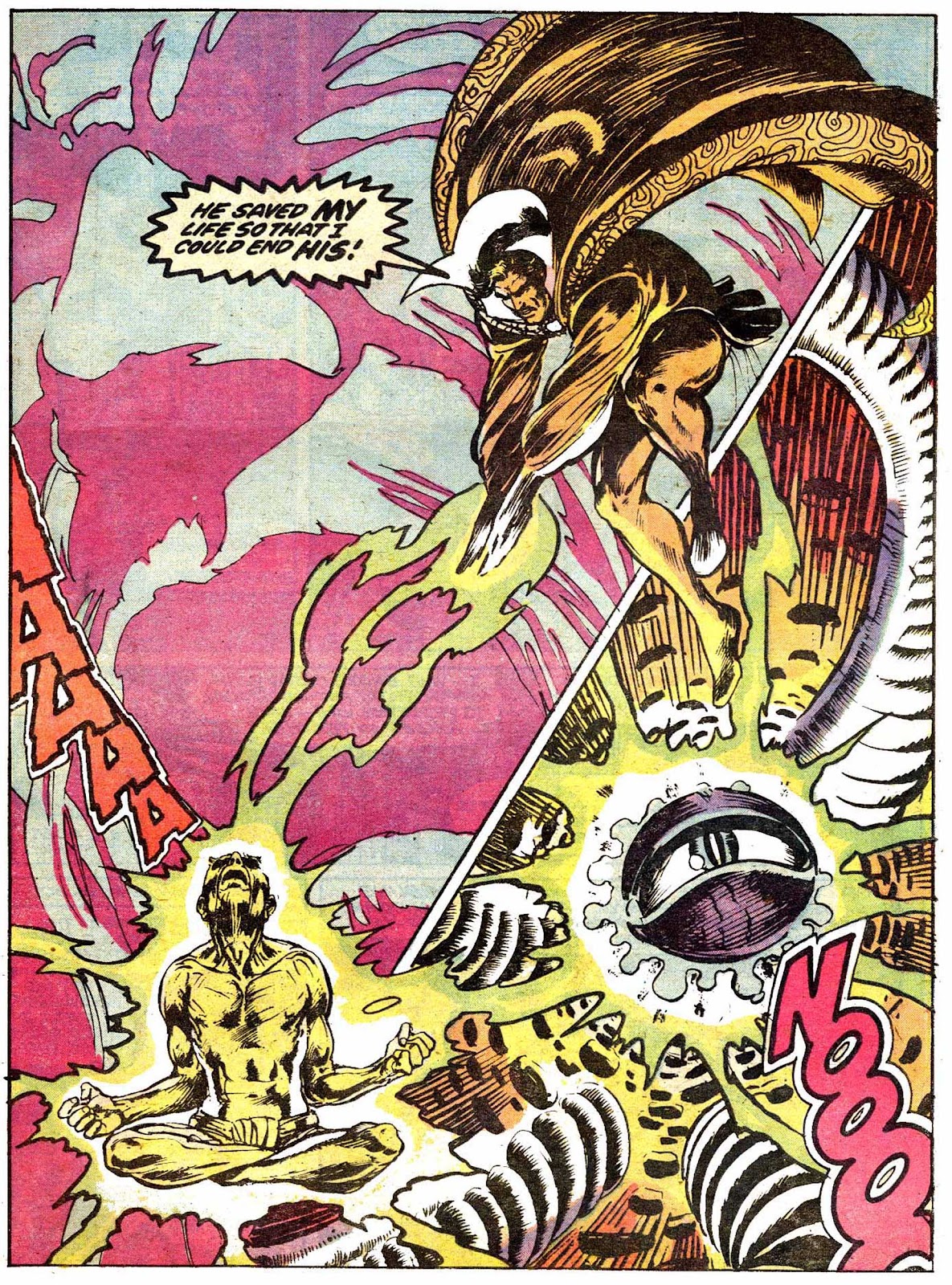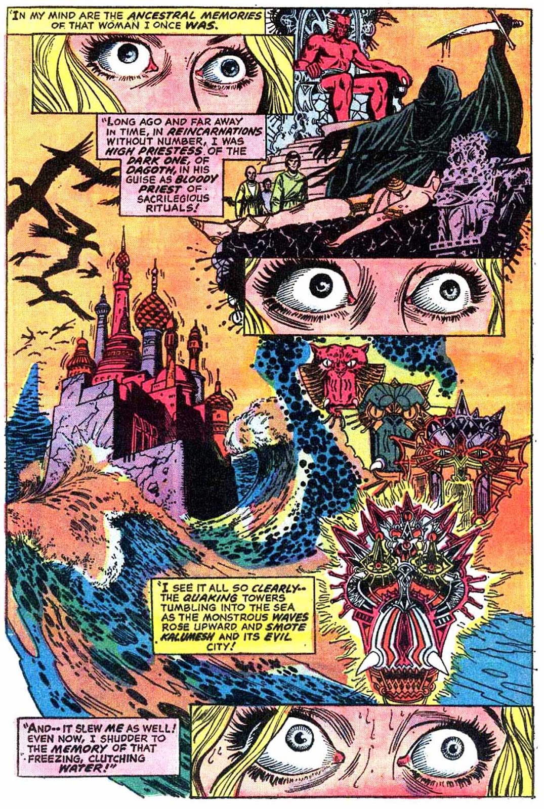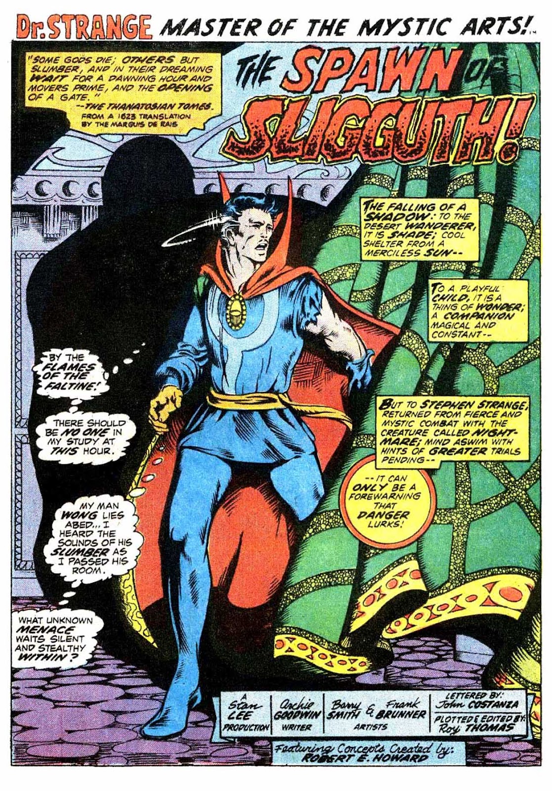 Now, you'll notice that the credits here are very different: Lee is little more than a "producer," while the writer is now one Archie Goodwin. Barry Smith is still on art, but newly joined by the ever-underrated Frank Brunner (who will go on to illustrate half of this saga, the entirety of the one immediately following it, and the first few issues of Strange's second ongoing). Get used to this-- unsteady credits are a constant throughout this saga.That little thank-you to Robert E. Howard may look a little misleading to those only familiar with his Conan work, but it will give you a good indication of where this story is going if you know him for more...
