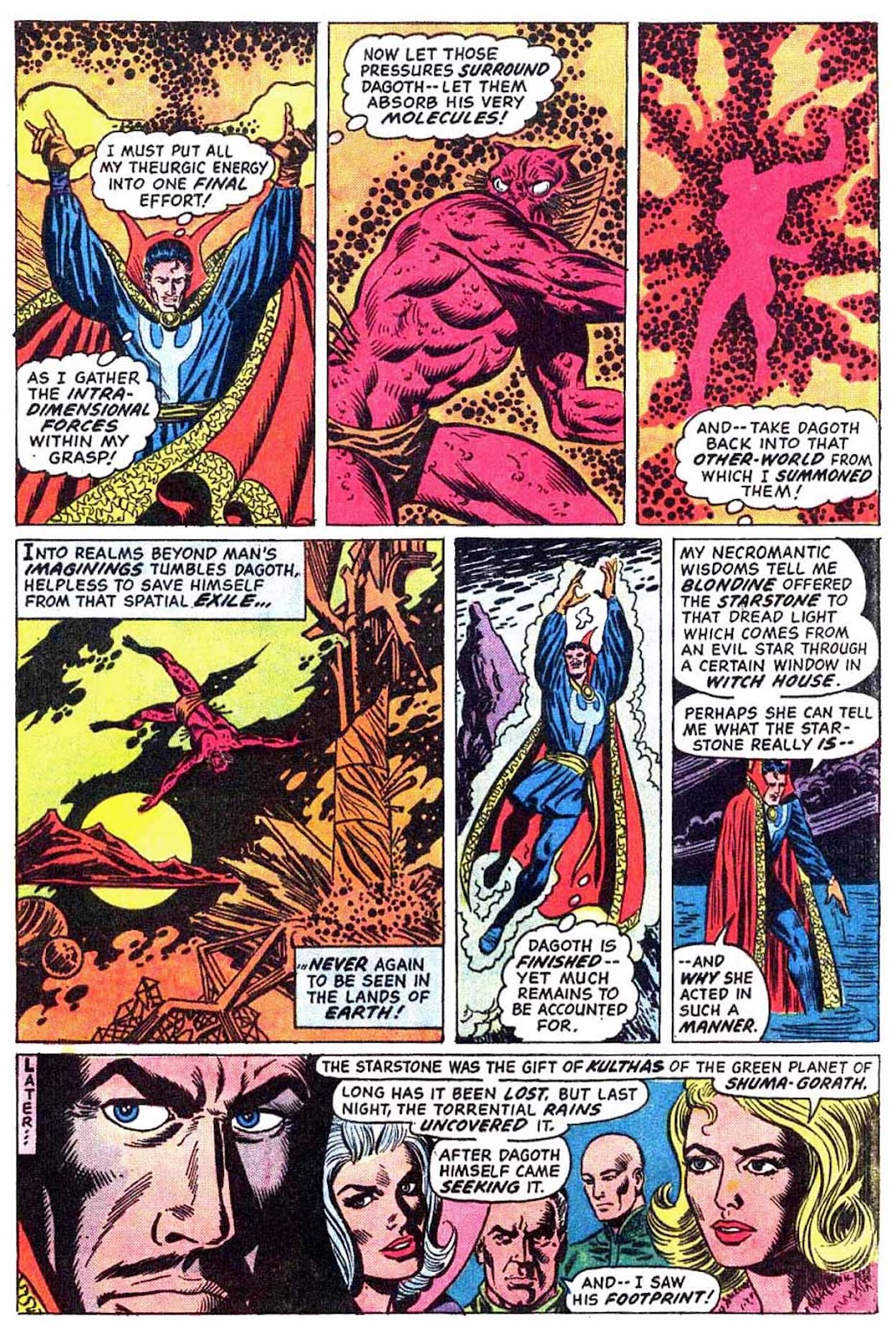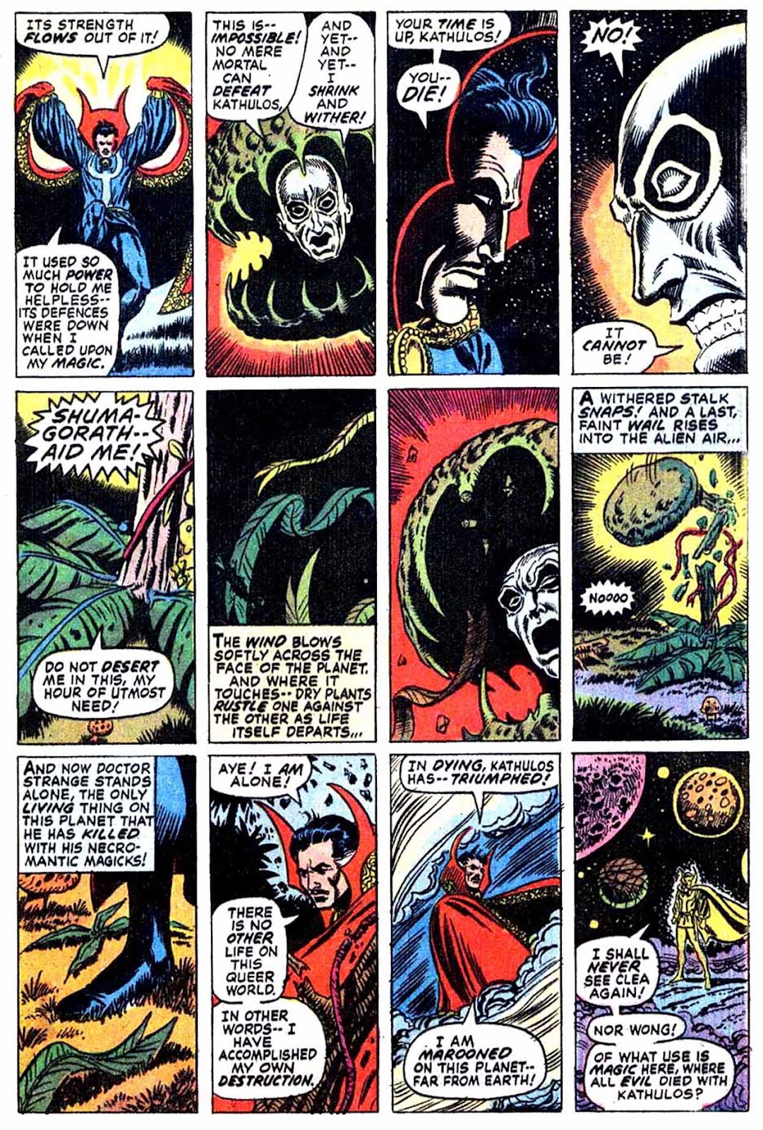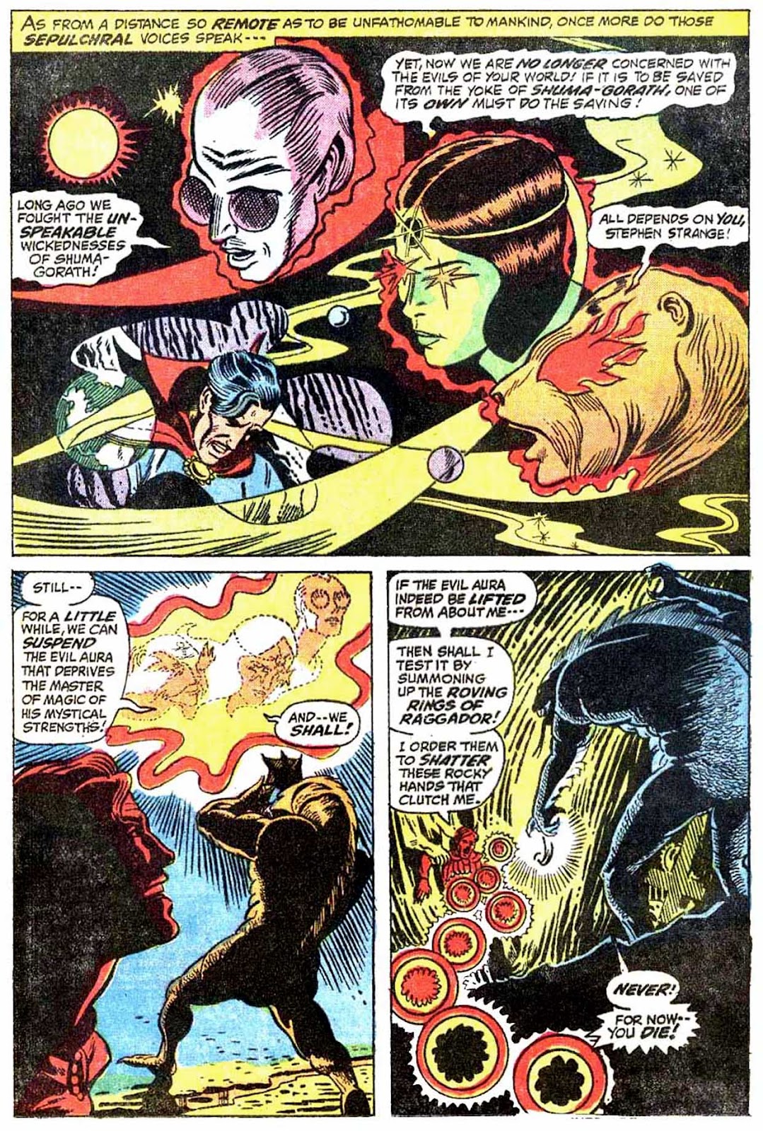 ...to the very end of the Shuma-Gorath saga, and the beginning of Strange's endless years as Sorcerer Supreme. Thank you all for reading along with me-- I hope you enjoyed this 54-year old yarn. It's one of my favorites, and it's a shame that it seems to have fallen by the wayside as of late.I promised a convenient way to read more Dr. Strange at the beginning of this lengthy trip, and I'm a man of my word: aside from the usual methods, feel free to follow the link below to a small introductory package of Dr. Strange stories.http://www.mediafire.com/download/araspaddej639ae/Doctor+Strange+Introductory+Package.zipI promise it's safe, even if it's mediafire. It was compiled by a saintly anon a little over 12 years ago and still works today. Within this .zip, you'll find a small collection of some of Dr. Strange's best books-- including the entire saga I've storytimed here! All you need to read them is a program that can open .cbzs and you're good to go. With all that said... thank you for reading! May the Vishanti smile upon you!