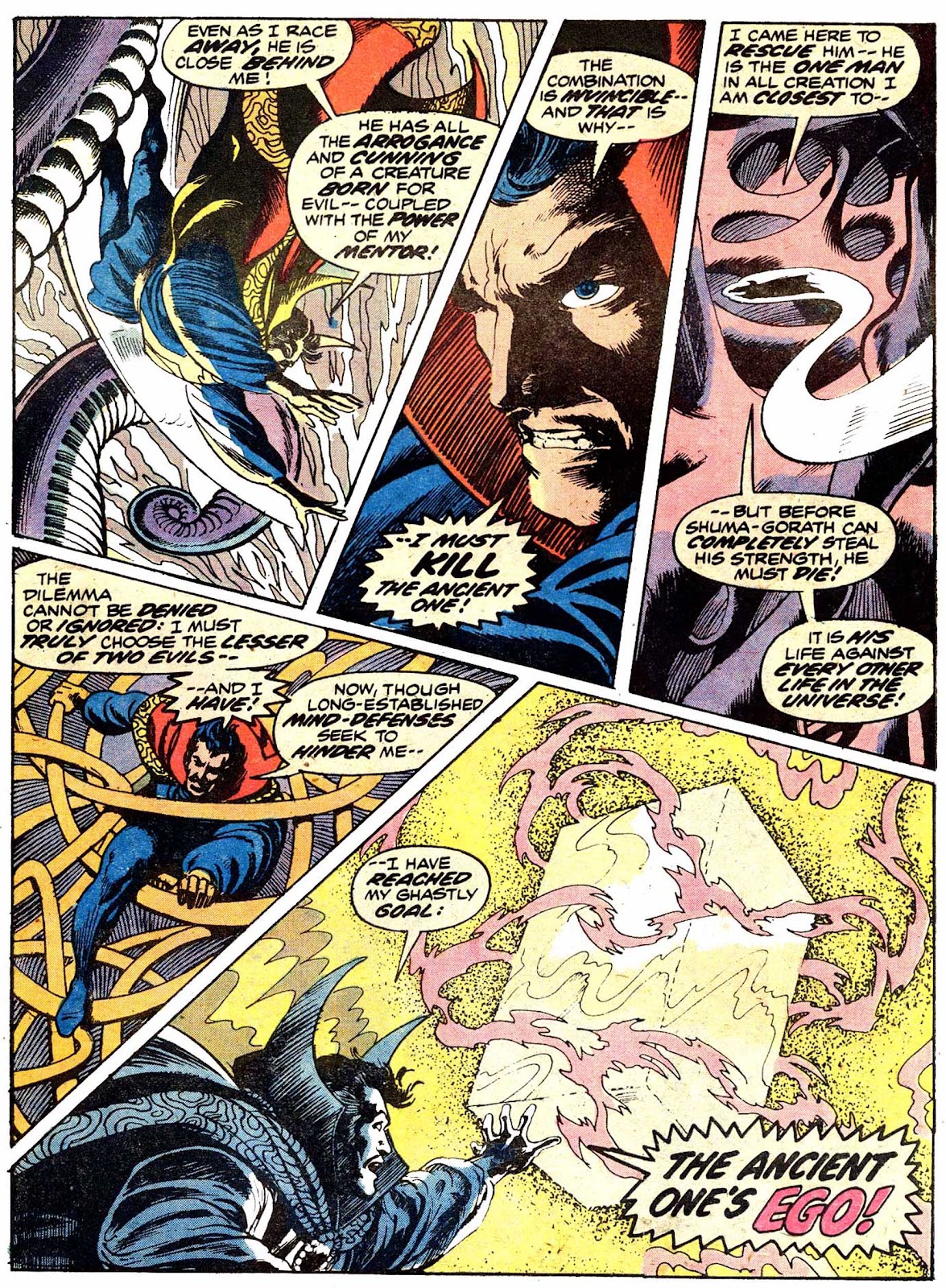 Once more, Strange must decide: save that which he loves, or save the wellbeing of the universe? It's no contest-- and so, the good doctor resolves to murder his adoptive father and long-time mentor for the sake of us all.