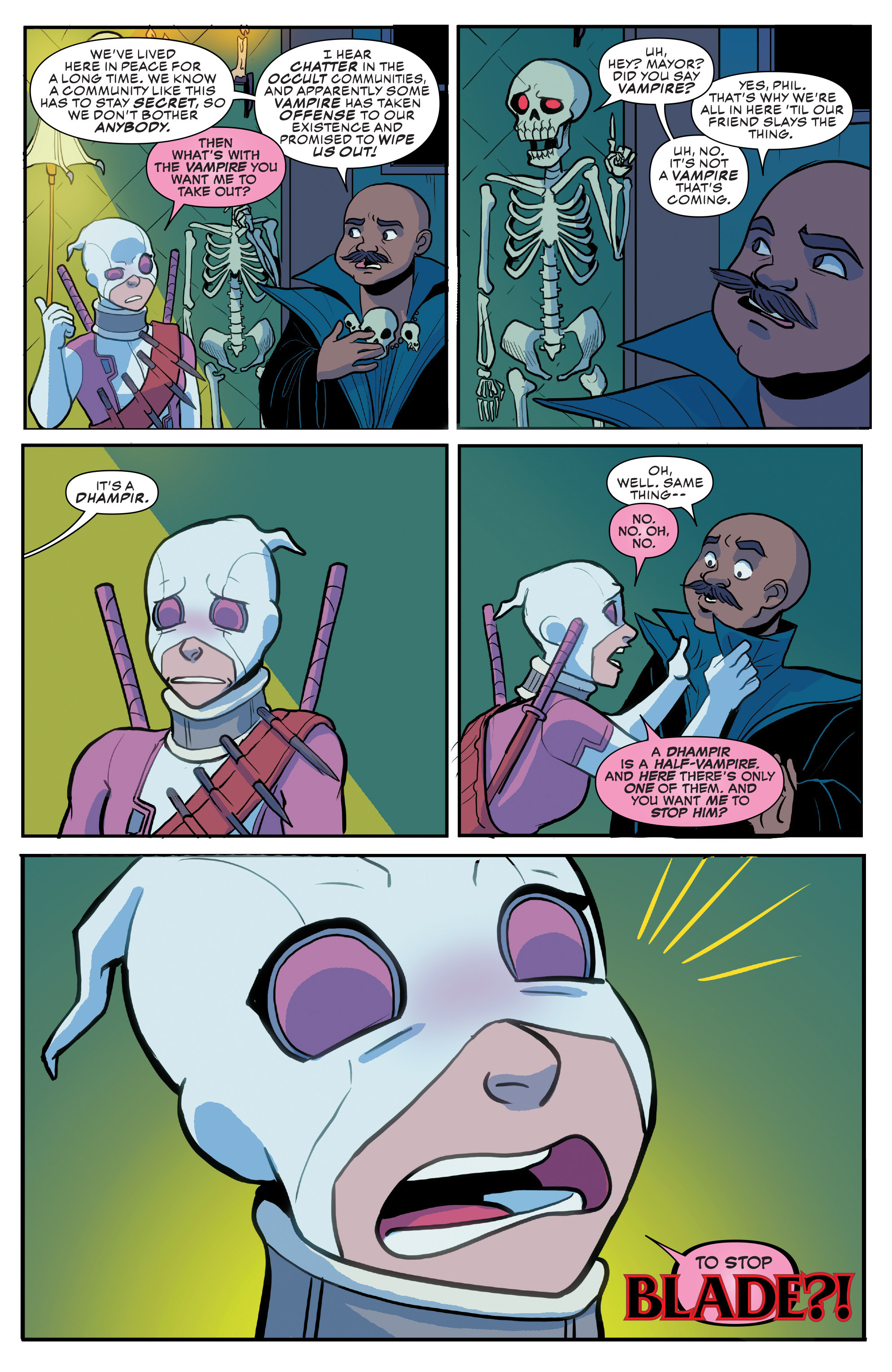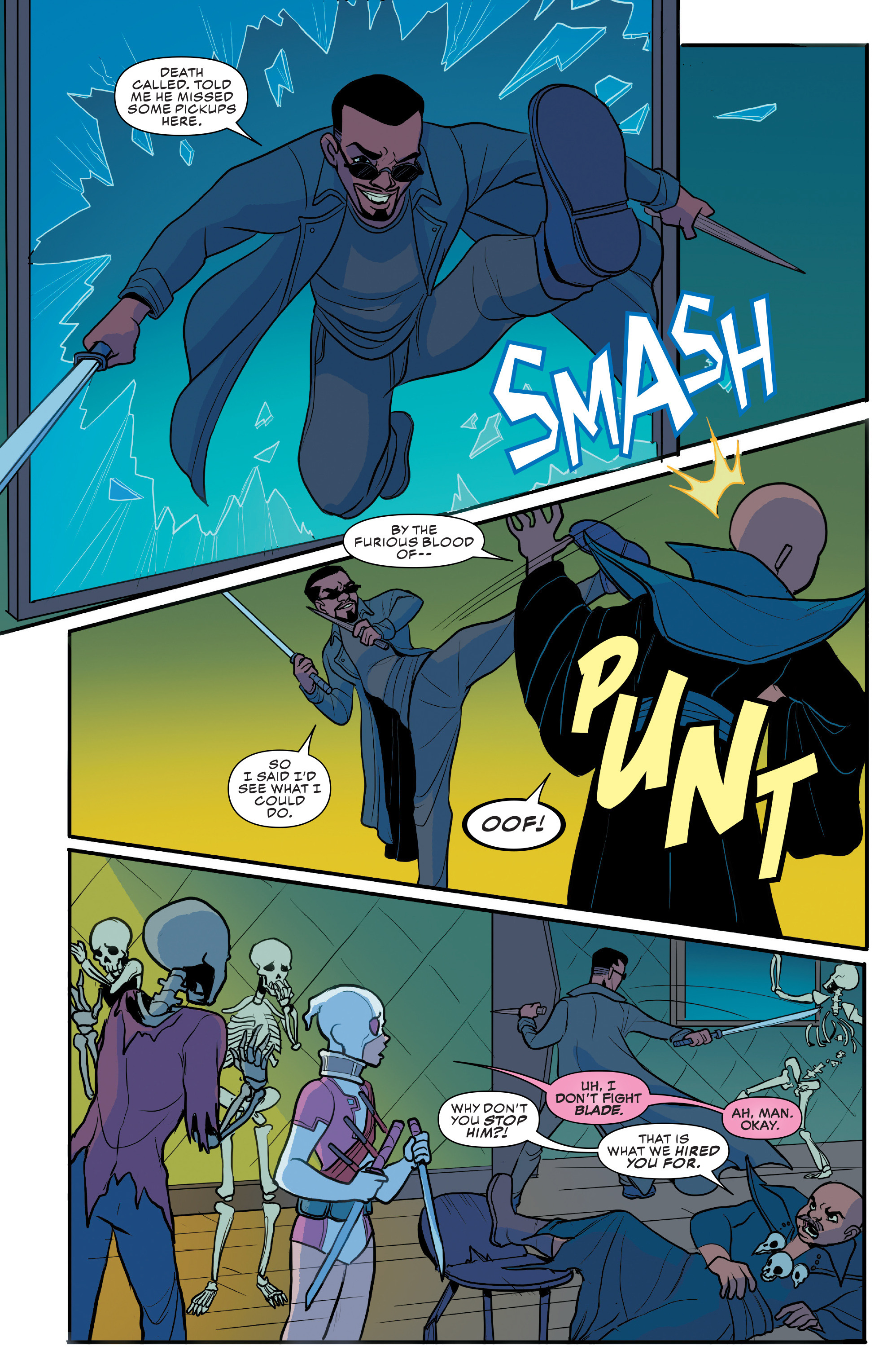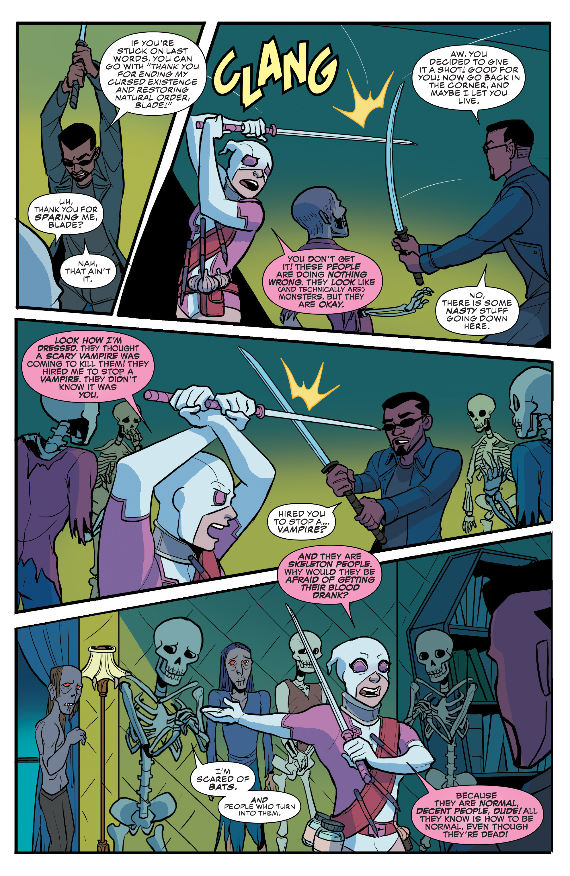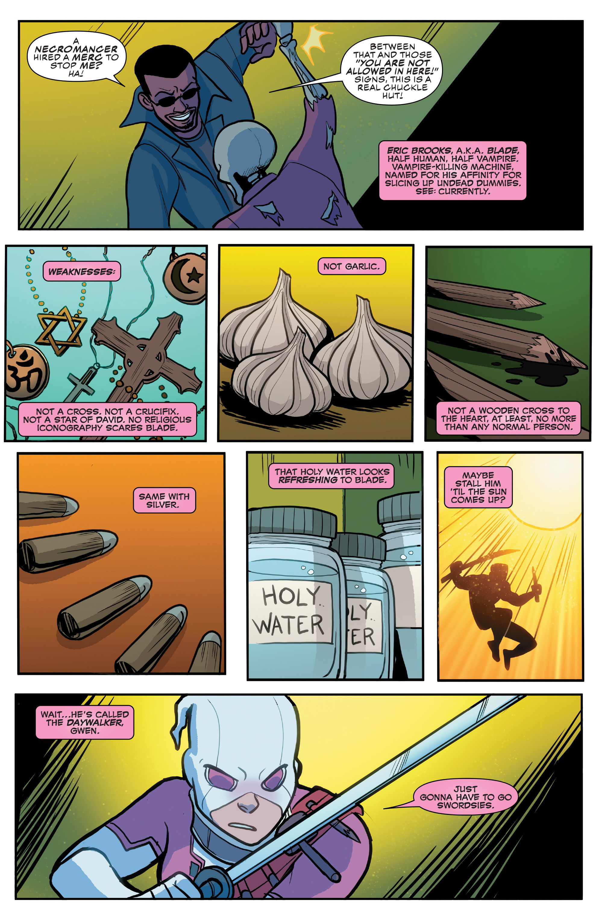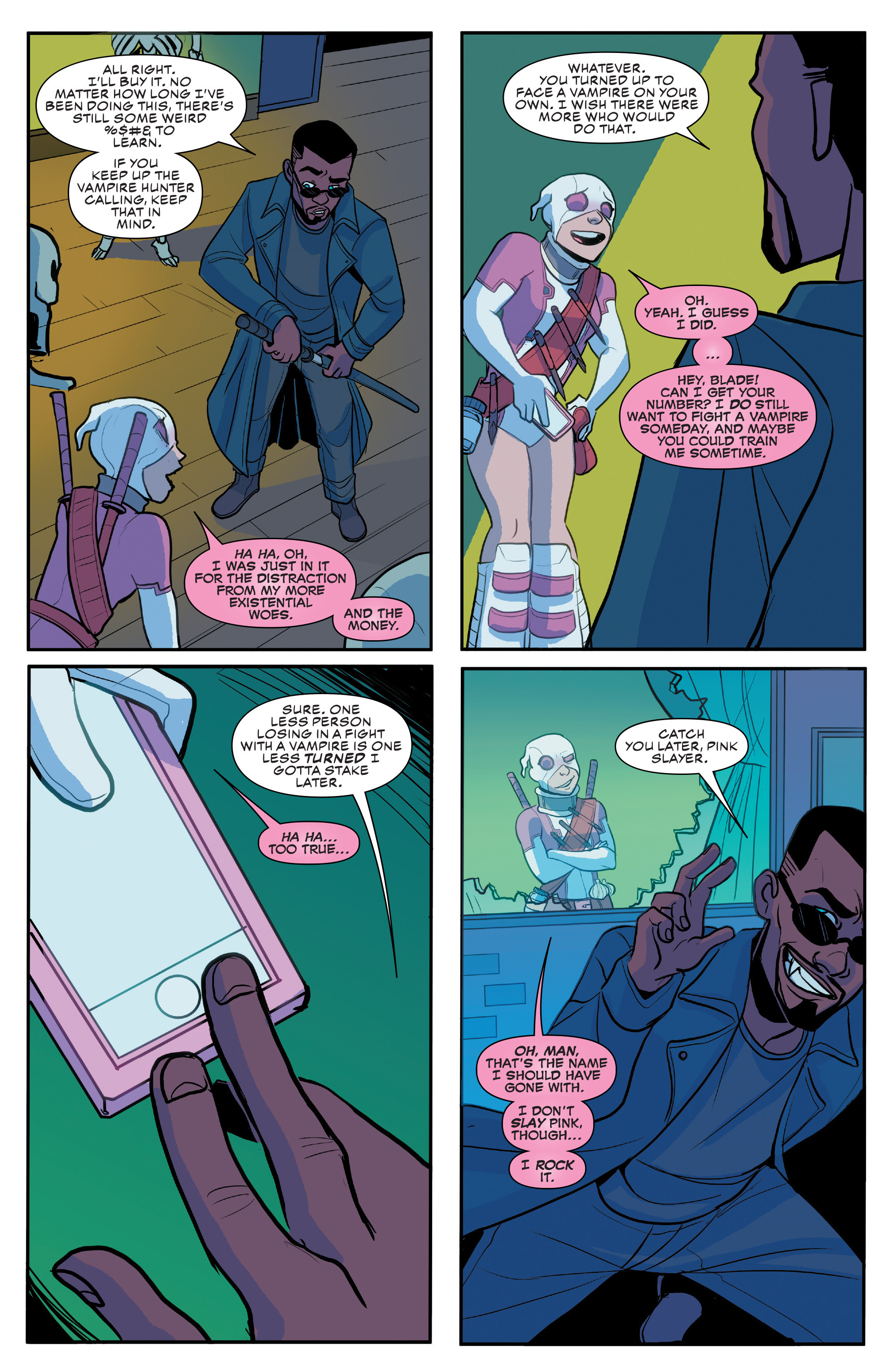 Among the heroes Gwen meets in Unbelievable, I particularly like them going with Blade. At the time of this run I think he'd be an underrated choice, there was no news of a new movie or anything out at the time and considering a lot of the others she meets are ANAD characters going with an established, less popular but very cool character like Blade was nice. Also this is probably the first interaction with another hero she's had where they actually kind of like Gwen at the end, that's progress.