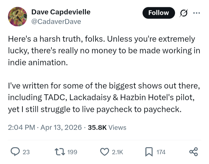Many people dislike the writing in indie shows and typically blame their lack of "life experience". In reality they're comparing these nobodies to great writers who are exceptional people with interesting lives. Most people do not live interesting lives and never had. You are not going to get the next JRR Tolkien through the indie market. Indie standards imo have gotten way too high since Hazbin but this is also a product of a dying industry. People want high quality animation, high quality writing, 30 minute runtimes, all for free on YouTube while the creators juggle full time jobs. This is absolutely insane and I don't know why this isn't talked about more. TV animation was subsidized by advertising and toy sales. Youtube AdSense pays like shit and the merch only sells to millennials