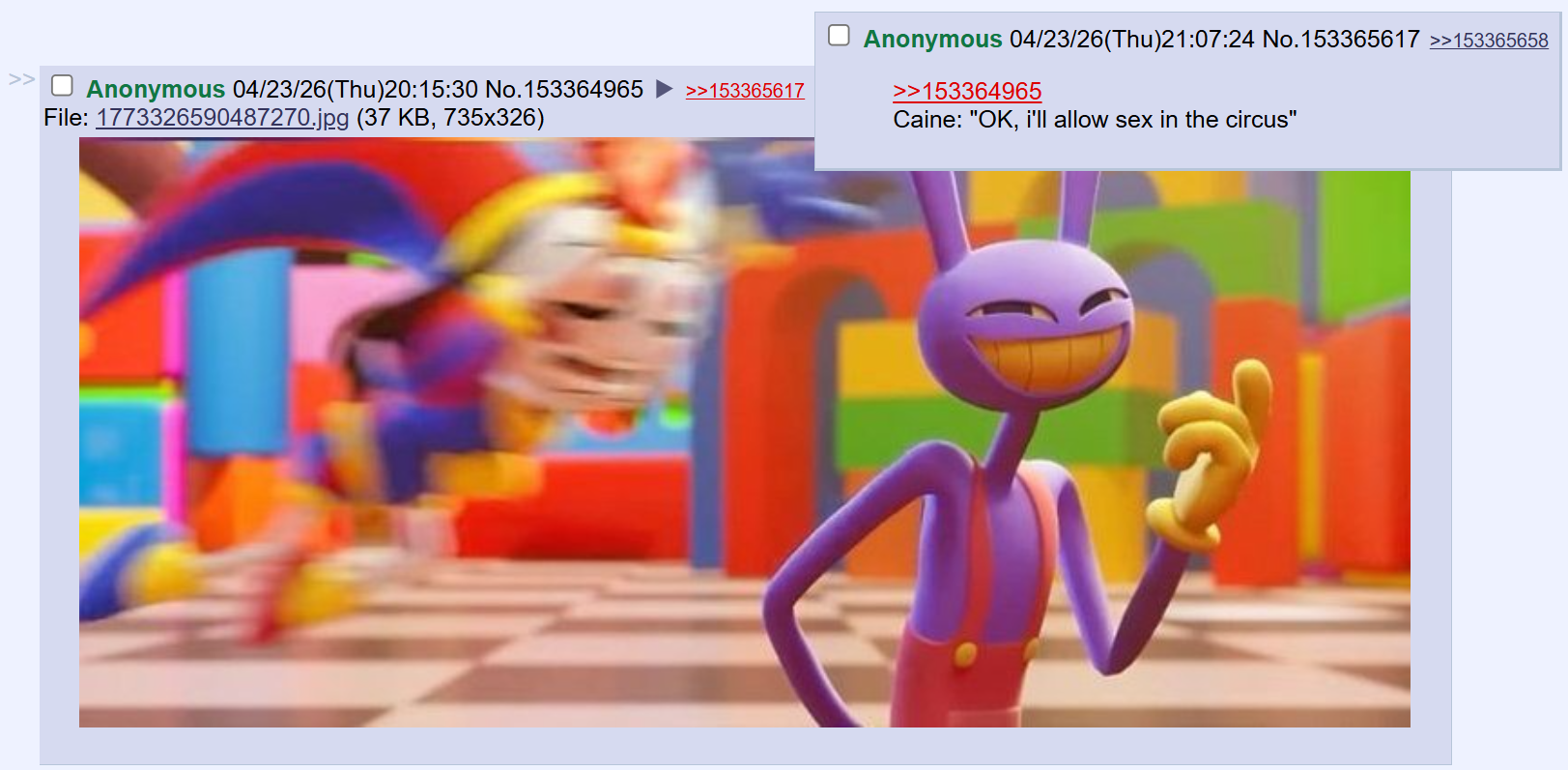 >>153397507I am interested in seeing just how much more mature and explicit this final Amazing Digital Circus will be now that all meta-censorship's been removed. Do the parents who bought their kids tickets know what they're in for?