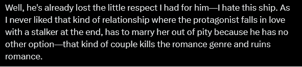 >>153408185Some of us like character dynamics instead of self inserting to get some mellow tradwife stalker
