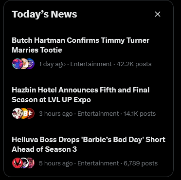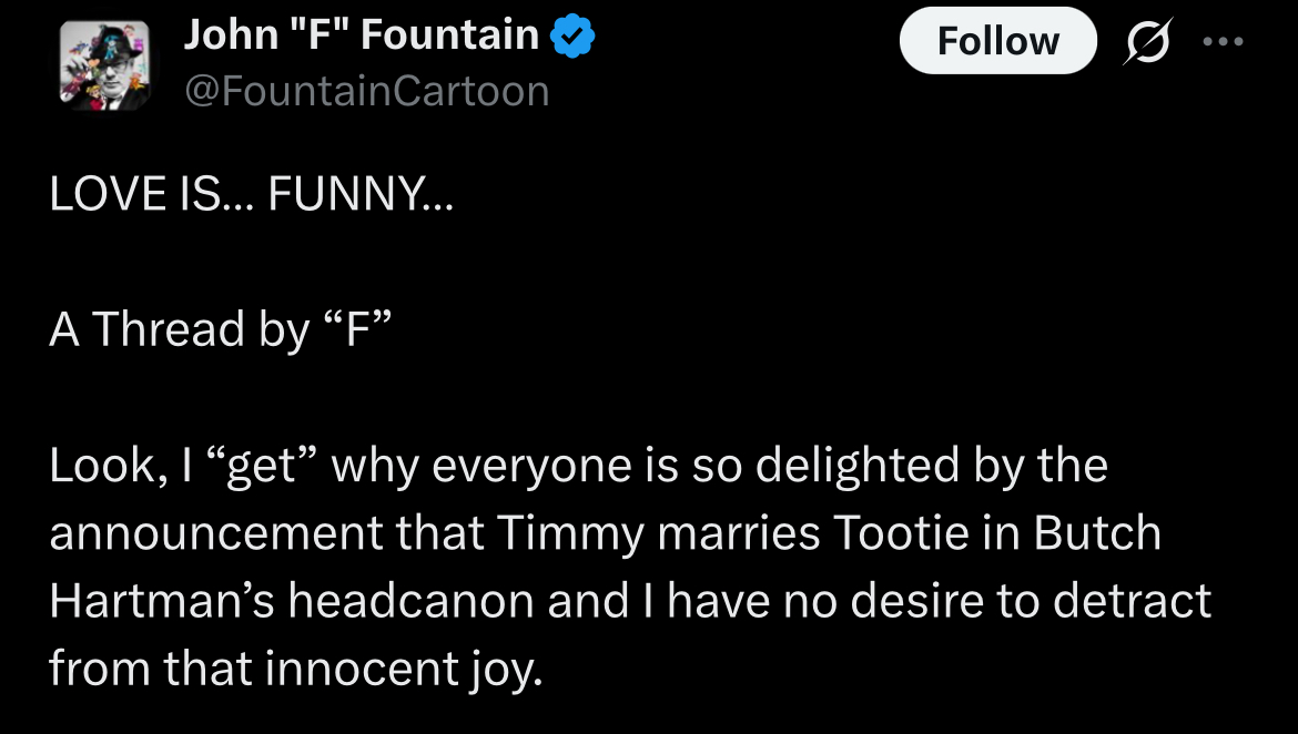 >>153394940>This is the single biggest /co/ cartoon related announcement we've had in a while.Really anon? THIS?It's definitely not that big of a deal in the animation circles I follow, don't see many people still caring about FOP like this, ironically enough except for when Hazel schizo sent Hazel's voice actor that creepy message.Like, wow, Timmy marries the girl that obsessed over him and that he also already married in the movies, this just doesn't feel like news to me, it just feels like Butch was bored and wanted some more attention so he confirmed something that was already confirmed.