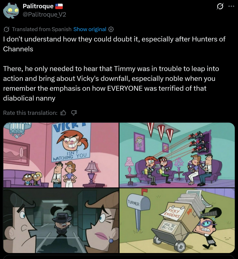 >>153395030As funny as that game is, it's a serious case of Vicky being mischaracterized into being more friendly with Timmy. Even if this was the early days of the show where the characters were sometimes taken more seriously it would still be out of character.