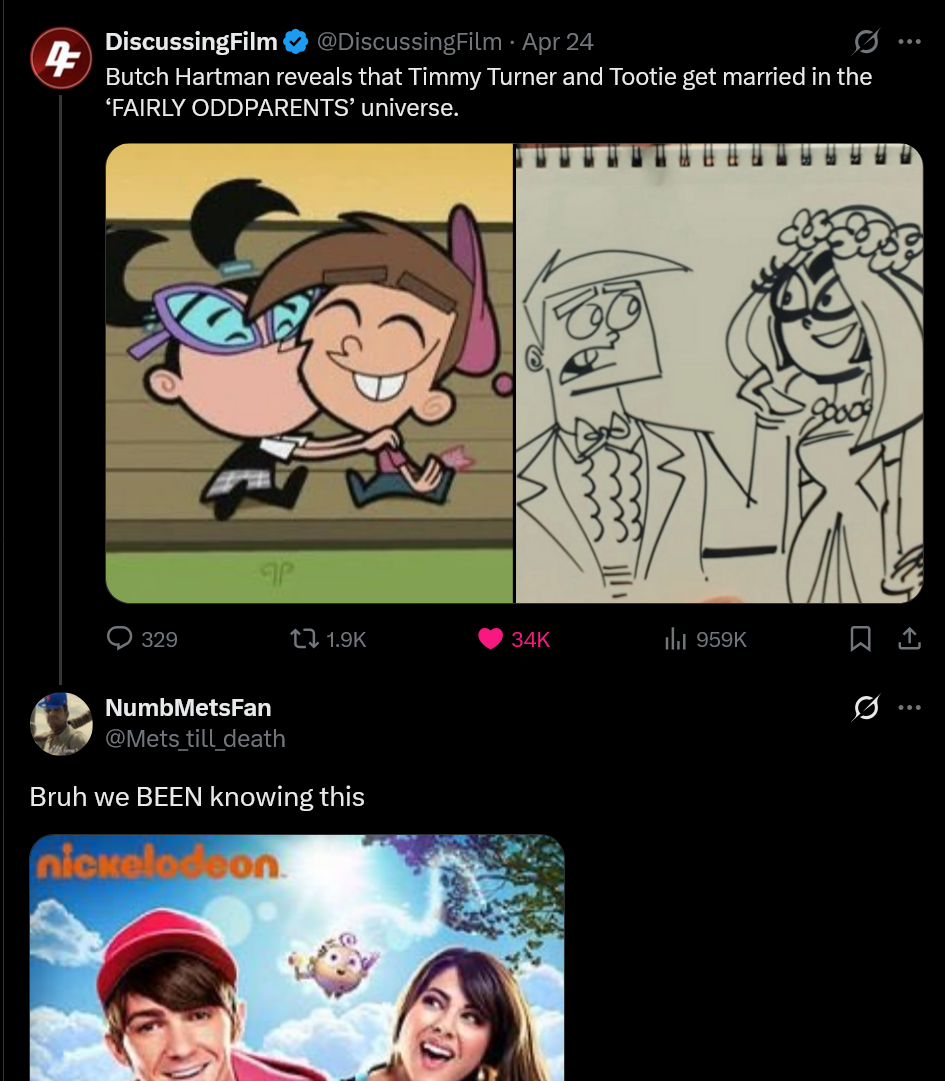 >>153394831I don't fucking care about grok news.And again, I don't know why we pretend like this is some big announcement when those live-action movies already soft-confirmed it.>erm, they weren't animatedThey were made by the same people as the show, the idea of Timmy ending up with Tootie isn't new.>>153394838Just for the record, I never could get into IZ after watching the organ stealing and time travel episodes, those turned me off from that show almost permanently.