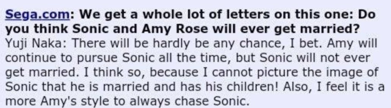 The Sonic comparison got me thinking. Yuji Naka (Creator of Sonic) said that Sonic isn't the kind of guy who settles down or has kids with anyone, but that didn't stop spinoff comics from marrying him off, that didnt' stop shippers from arguing about who he should fuck. The creator can explicitly say that the character will never end up with anybody and people will argue about it. So why would Butch Hartman saying Tootie ends up with Timmy change any diehard shipper autist's mind?