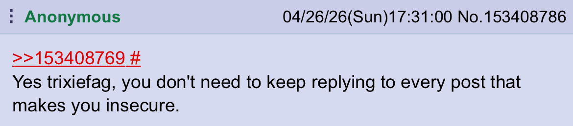>>153408769Yes trixiefag, you don't need to keep replying to every post that makes you insecure.