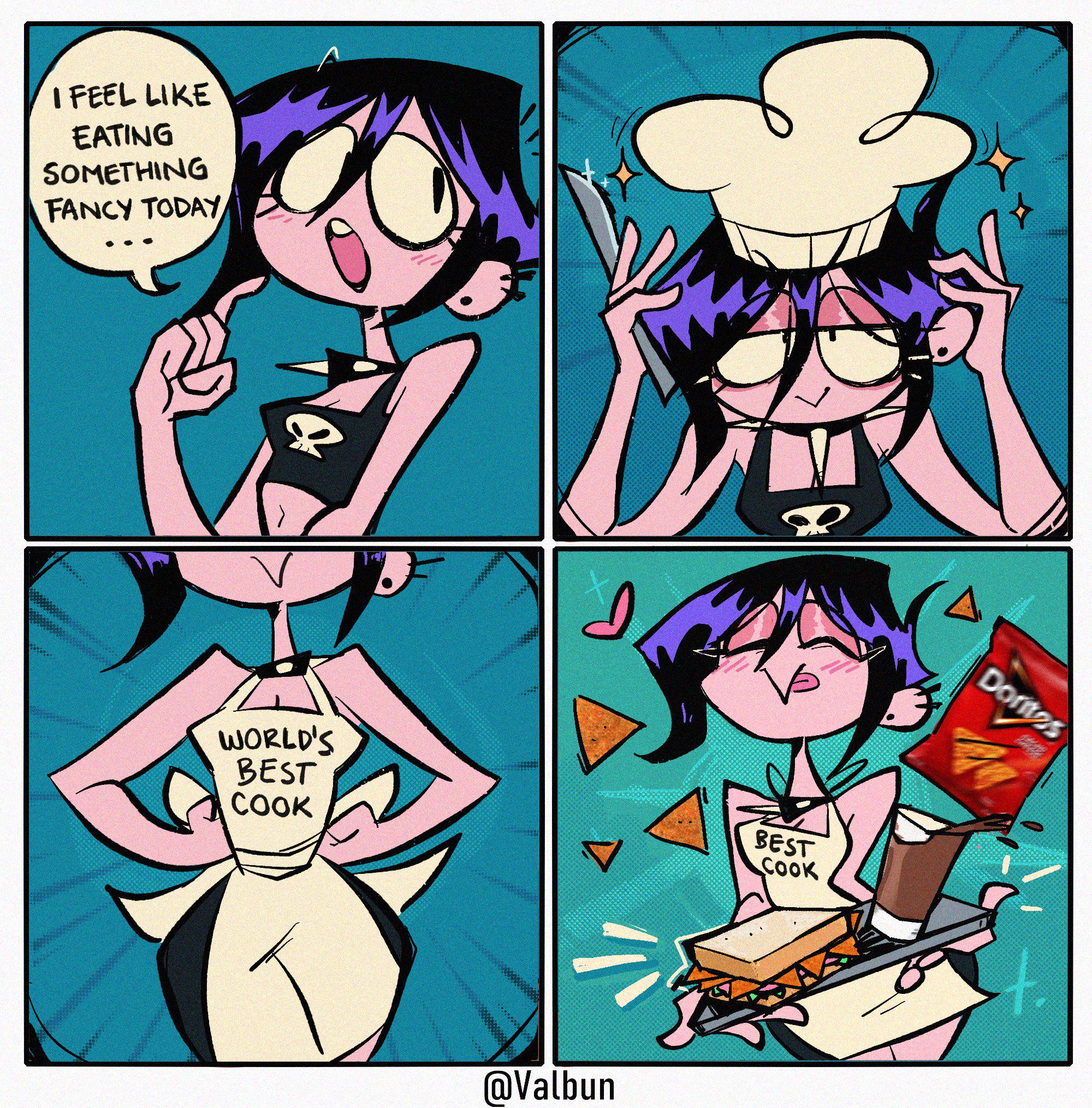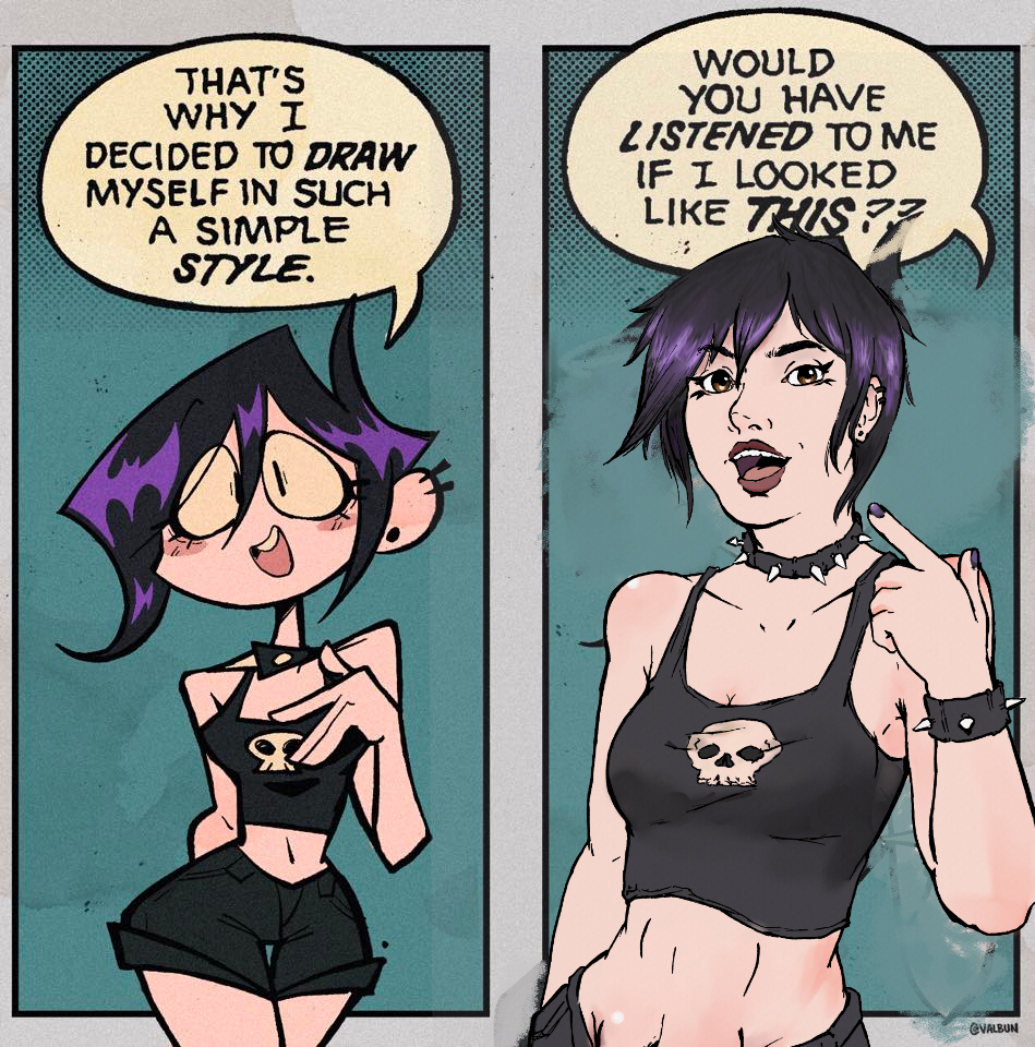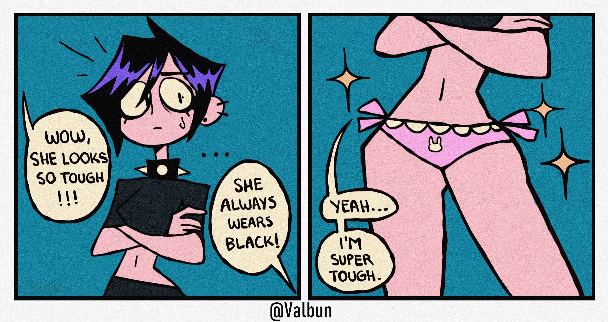 >>153401878This. Every single comic is just some variation of "teehee I'm so cute but also different because I'm a goth that likes cute things". She needs to just draw purely lewd art of herself.