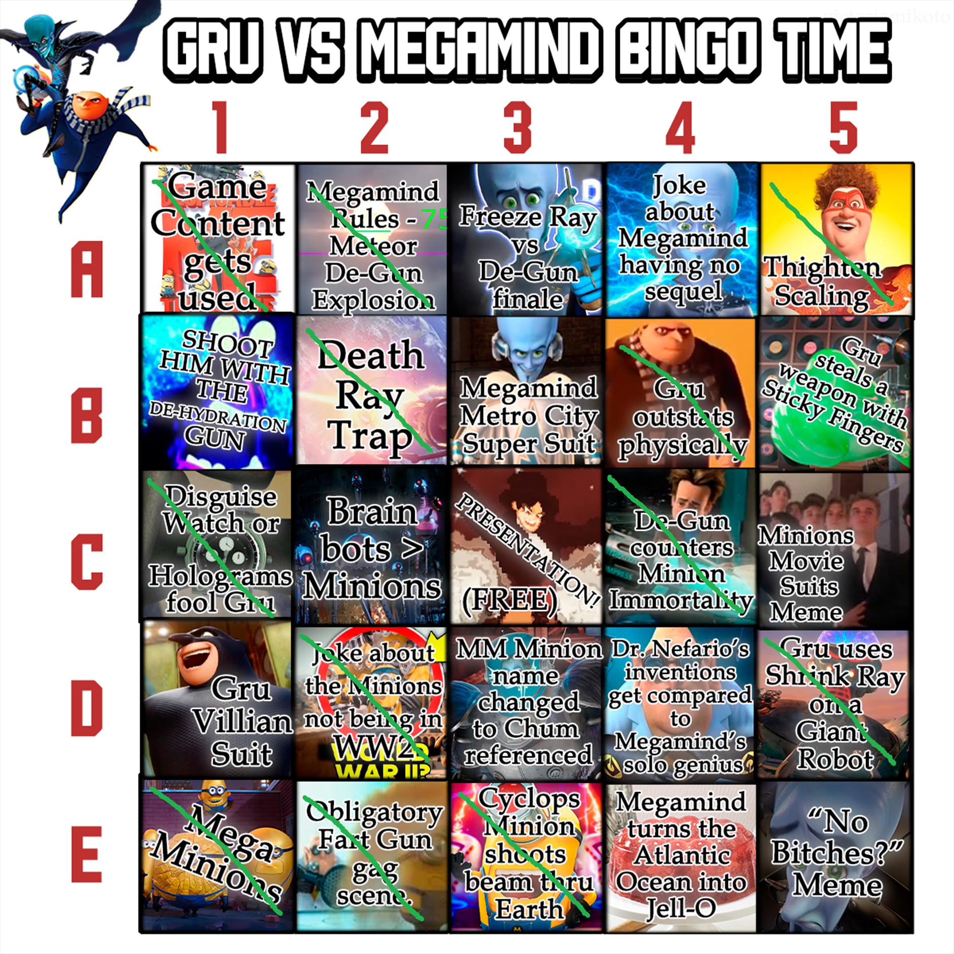 Megamind shoots Gru with the demoralize gun. Gru falls to his knees begging for death. Megamind grabs Gru and slits his throat in front of his family and minions. The minions cheer as Megamind gains a new harem. KO!