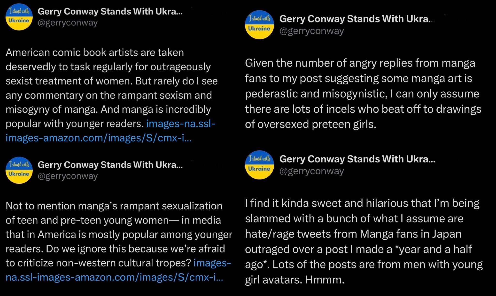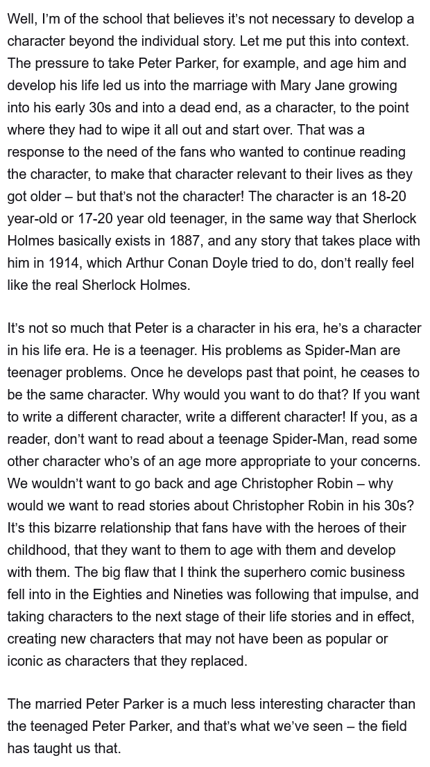>>153421359>>153421456If you really wanted to bait you'd bring up Conway's controversial tweets from the last few years where he justified Marvel's perpetual status quo by saying that if someone wants change there are alternative universe titles available (like Renew Your Vows or Ultimate). He also didn't really understand manga/anime culture and generally thought it was some weird degenerate shit for perverts.I never thought there was anything wrong with those tweets, the first was pretty reasonable and the second was an opinion he had the right to hold (especially considering his age), but /co/ seethed about them.