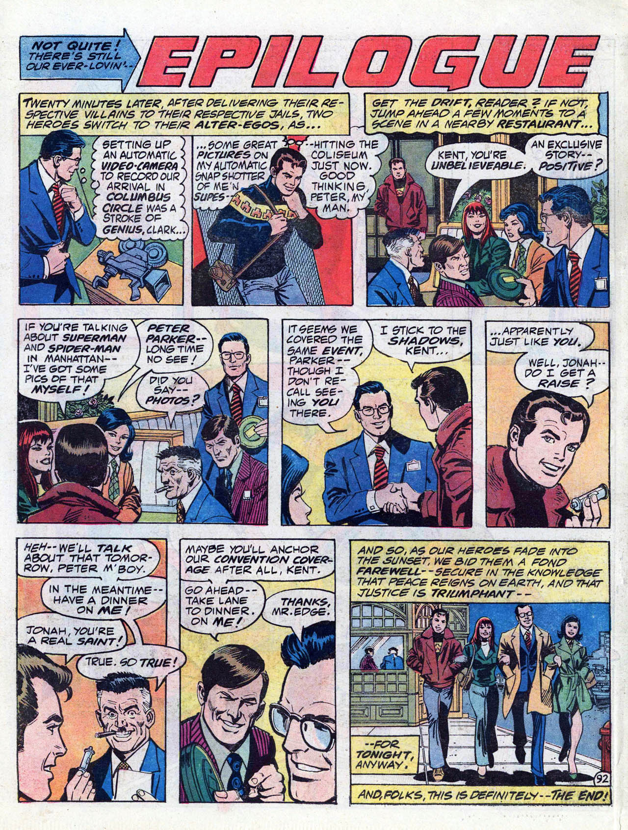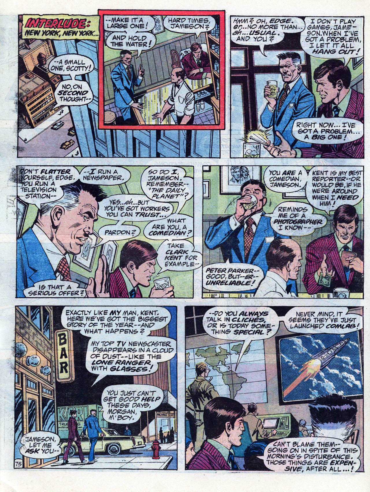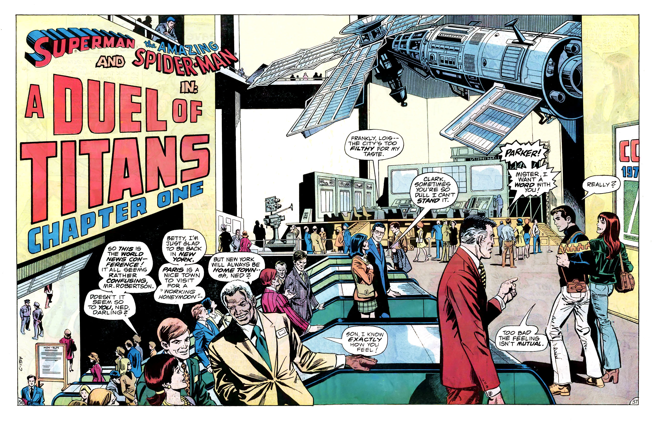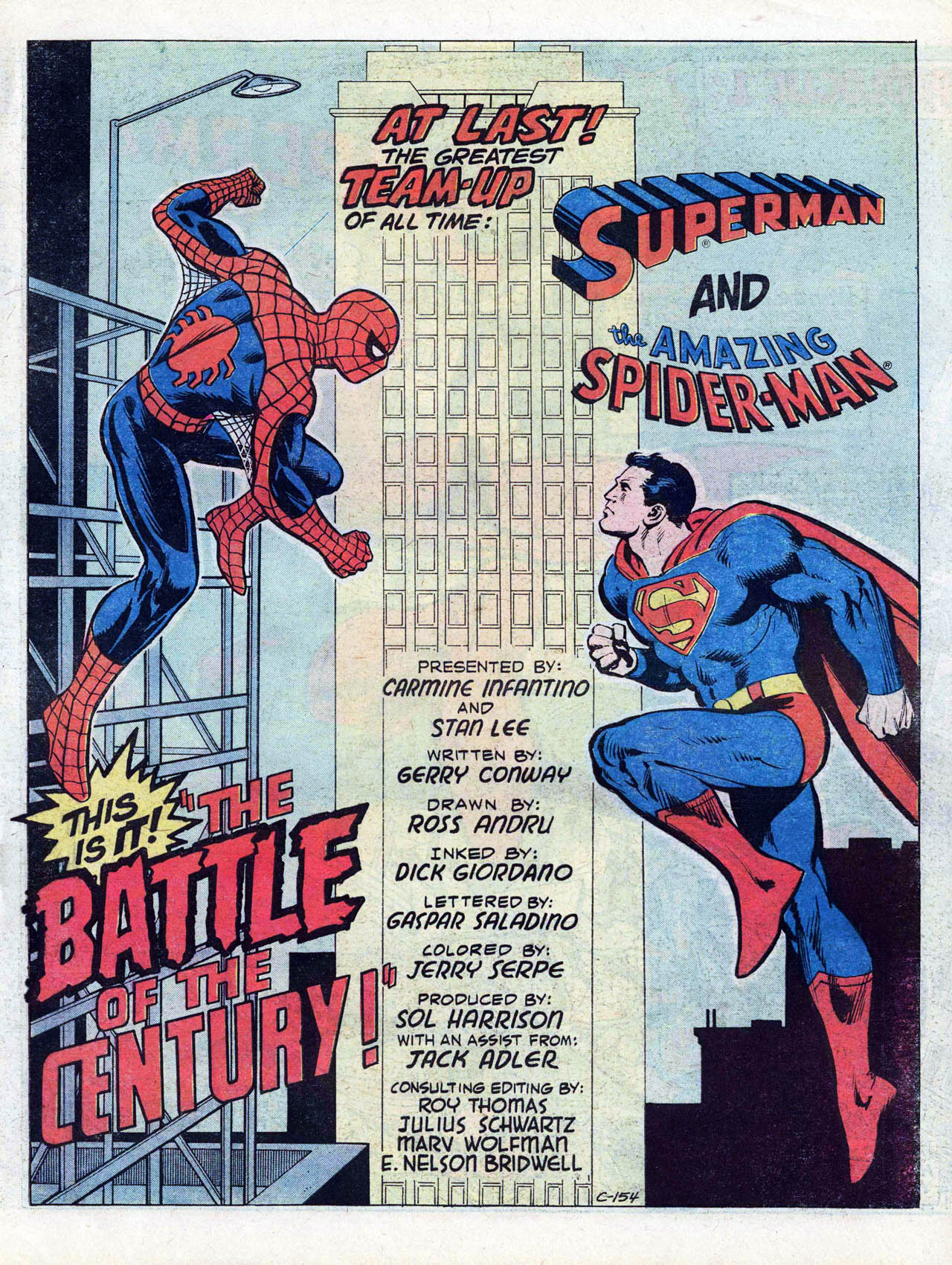 >In late 1972, Conway and writers Steve Englehart and Len Wein crafted a metafictional unofficial crossover spanning titles from both major comics companies. Each comic featured Englehart, Conway, and Wein, as well as Wein's first wife Glynis, interacting with Marvel or DC characters at the Rutland Halloween Parade in Rutland, Vermont. Beginning in Amazing Adventures #16 (by Englehart with art by Bob Brown and Frank McLaughlin), the story continued in Justice League of America #103 (by Wein, Dick Dillin and Dick Giordano), and concluded in Thor #207 (by Conway and penciler John Buscema). As Englehart explained in 2010, "It certainly seemed like a radical concept and we knew that we had to be subtle (laughs) and each story had to stand on its own, but we really worked it out. It's really worthwhile to read those stories back to back to back – it didn't matter to us that one was at DC and two were at Marvel – I think it was us being creative, thinking what would be really cool to do."[18][19][20]>Conway returned to DC Comics in mid-1975, beginning with three books cover-dated Nov. 1975: Hercules Unbound #1, Kong the Untamed #3, and Swamp Thing #19. He wrote a revival of the Golden Age comic book series All Star Comics, which introduced the character Power Girl.[21][22][23] Shortly afterward, he was chosen by Marvel and DC editors to script the historic intercompany crossover Superman vs. the Amazing Spider-Man #1, a 96-page, tabloid-sized, $2 one-shot, at a time when comic books sold for 25 cents.[7][24]>He continued writing for DC, on titles including Superman, Detective Comics (starring Batman), Metal Men, Justice League of America, 1st Issue Special #11 starring Codename: Assassin,[25] and that of the licensed character Tarzan.[7] Conway briefly returned to Marvel where he succeeded Marv Wolfman as editor-in-chief in March 1976,[26] but held the job only "about a month-and-a-half,"[27] relinquishing the post and being succeeded by Archie Goodwin.