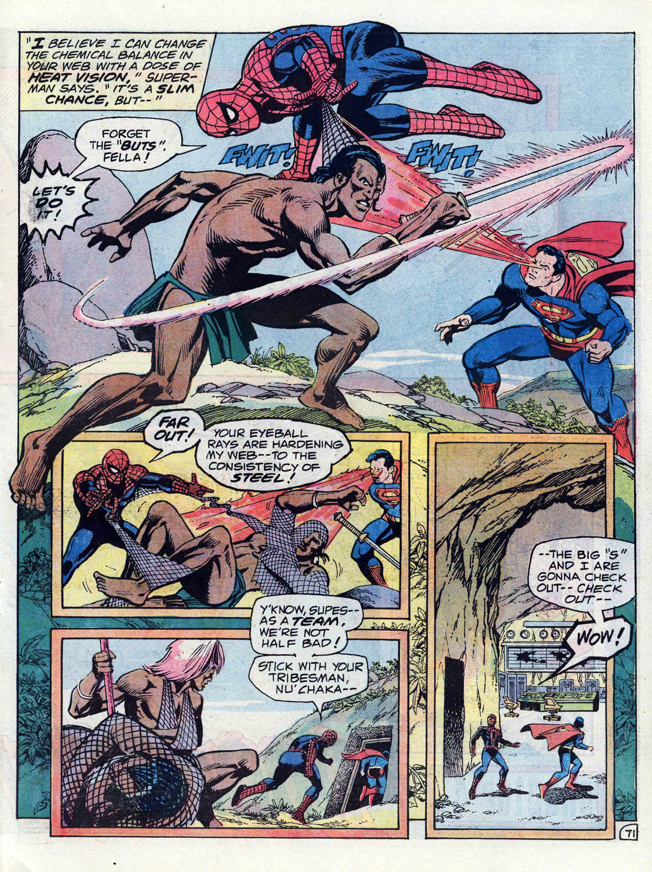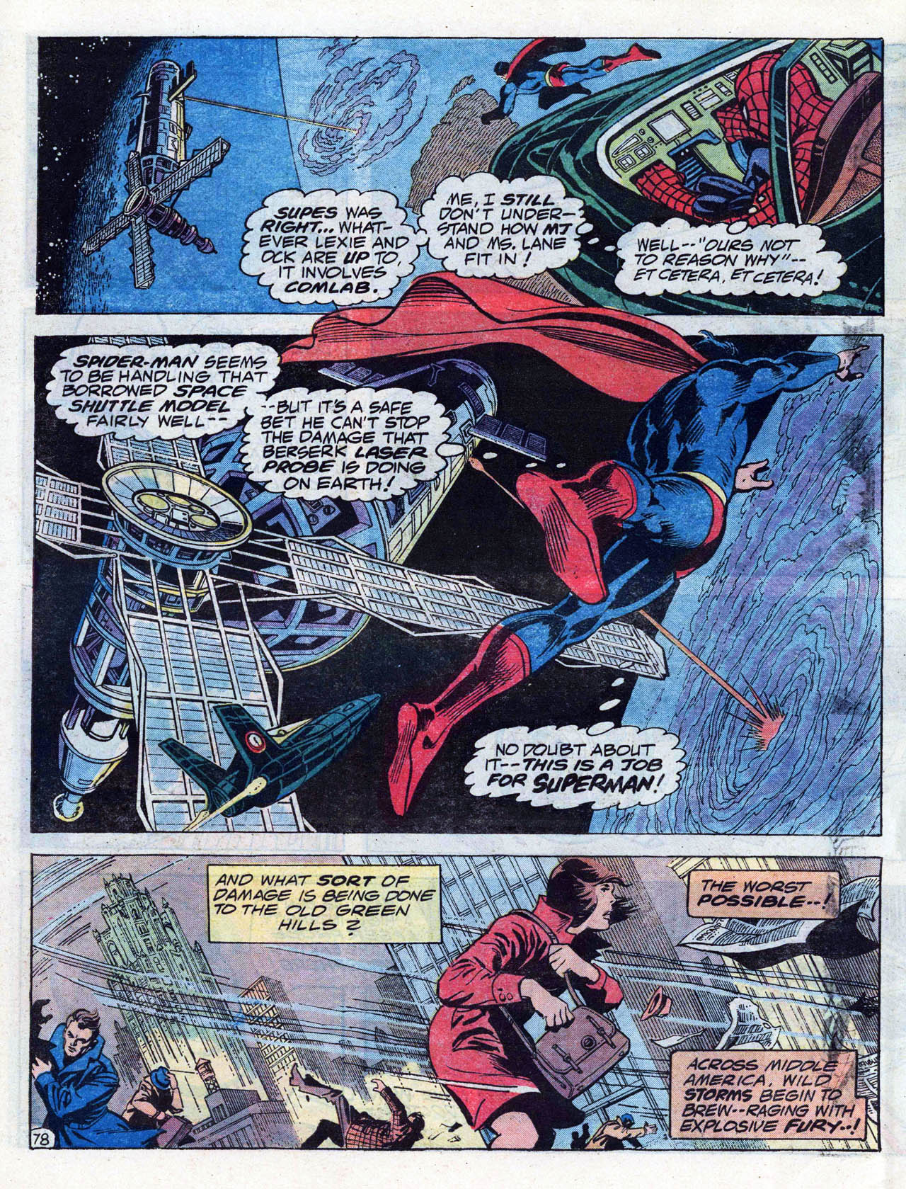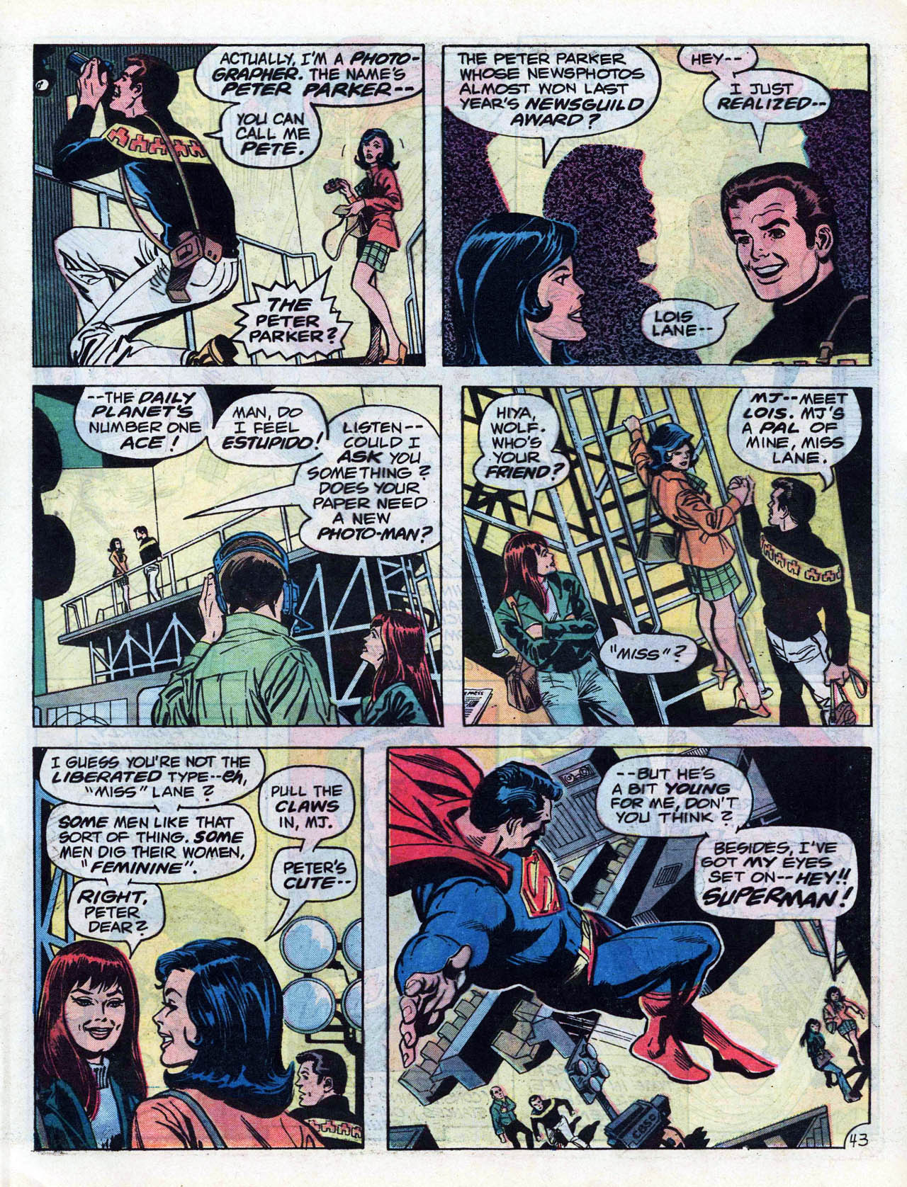 >In late 1972, Conway and writers Steve Englehart and Len Wein crafted a metafictional unofficial crossover spanning titles from both major comics companies. Each comic featured Englehart, Conway, and Wein, as well as Wein's first wife Glynis, interacting with Marvel or DC characters at the Rutland Halloween Parade in Rutland, Vermont. Beginning in Amazing Adventures #16 (by Englehart with art by Bob Brown and Frank McLaughlin), the story continued in Justice League of America #103 (by Wein, Dick Dillin and Dick Giordano), and concluded in Thor #207 (by Conway and penciler John Buscema). As Englehart explained in 2010, "It certainly seemed like a radical concept and we knew that we had to be subtle (laughs) and each story had to stand on its own, but we really worked it out. It's really worthwhile to read those stories back to back to back – it didn't matter to us that one was at DC and two were at Marvel – I think it was us being creative, thinking what would be really cool to do."[18][19][20]>Conway returned to DC Comics in mid-1975, beginning with three books cover-dated Nov. 1975: Hercules Unbound #1, Kong the Untamed #3, and Swamp Thing #19. He wrote a revival of the Golden Age comic book series All Star Comics, which introduced the character Power Girl.[21][22][23] Shortly afterward, he was chosen by Marvel and DC editors to script the historic intercompany crossover Superman vs. the Amazing Spider-Man #1, a 96-page, tabloid-sized, $2 one-shot, at a time when comic books sold for 25 cents.[7][24]>He continued writing for DC, on titles including Superman, Detective Comics (starring Batman), Metal Men, Justice League of America, 1st Issue Special #11 starring Codename: Assassin,[25] and that of the licensed character Tarzan.[7] Conway briefly returned to Marvel where he succeeded Marv Wolfman as editor-in-chief in March 1976,[26] but held the job only "about a month-and-a-half,"[27] relinquishing the post and being succeeded by Archie Goodwin.