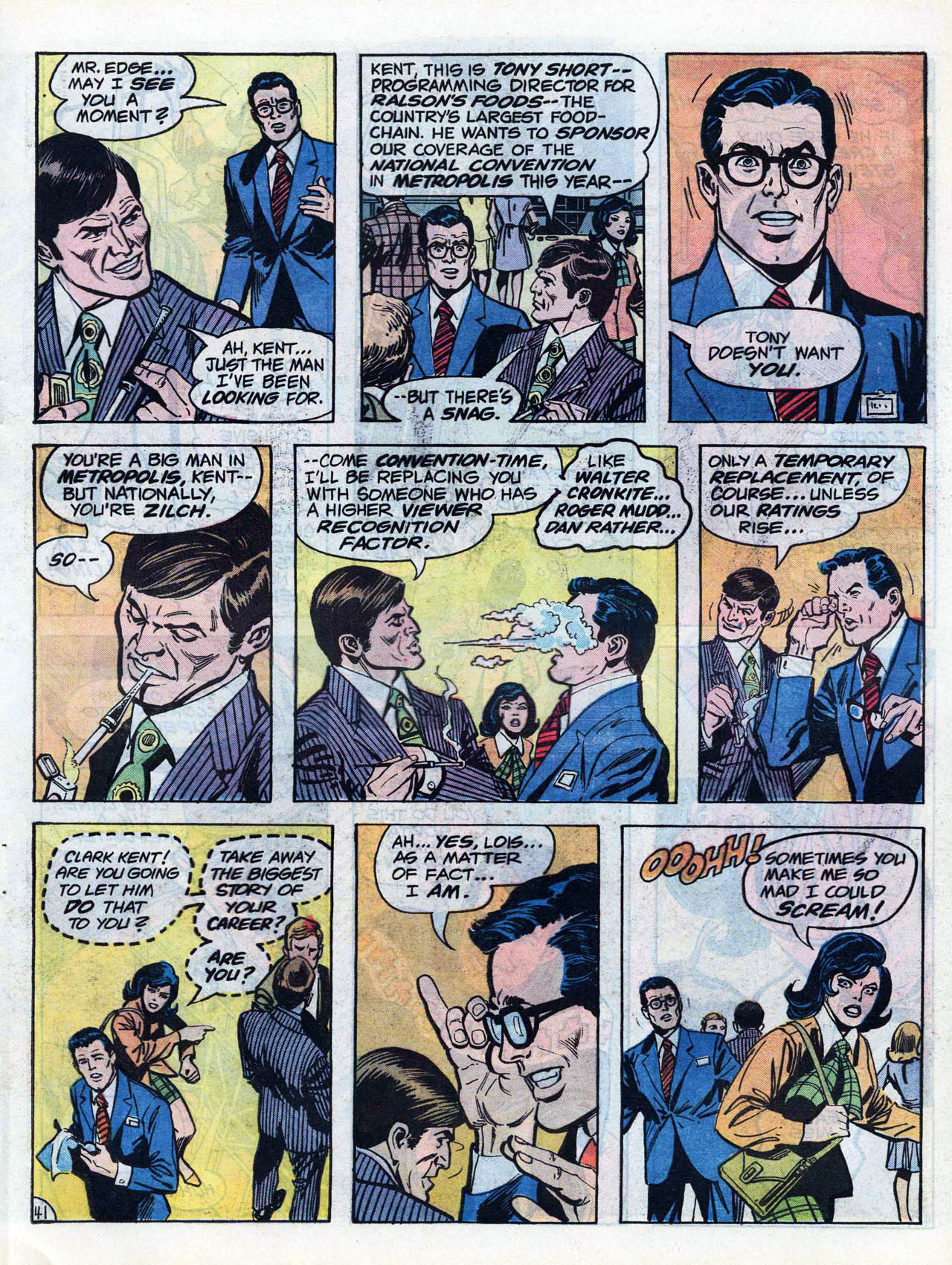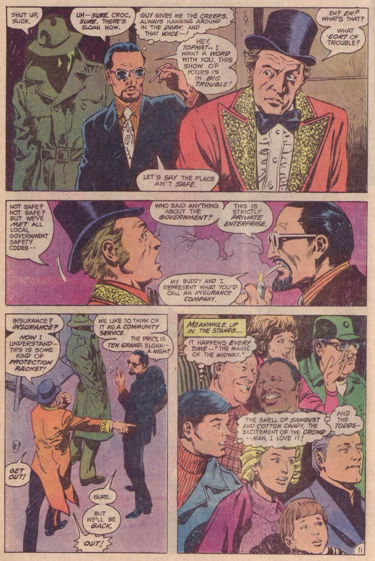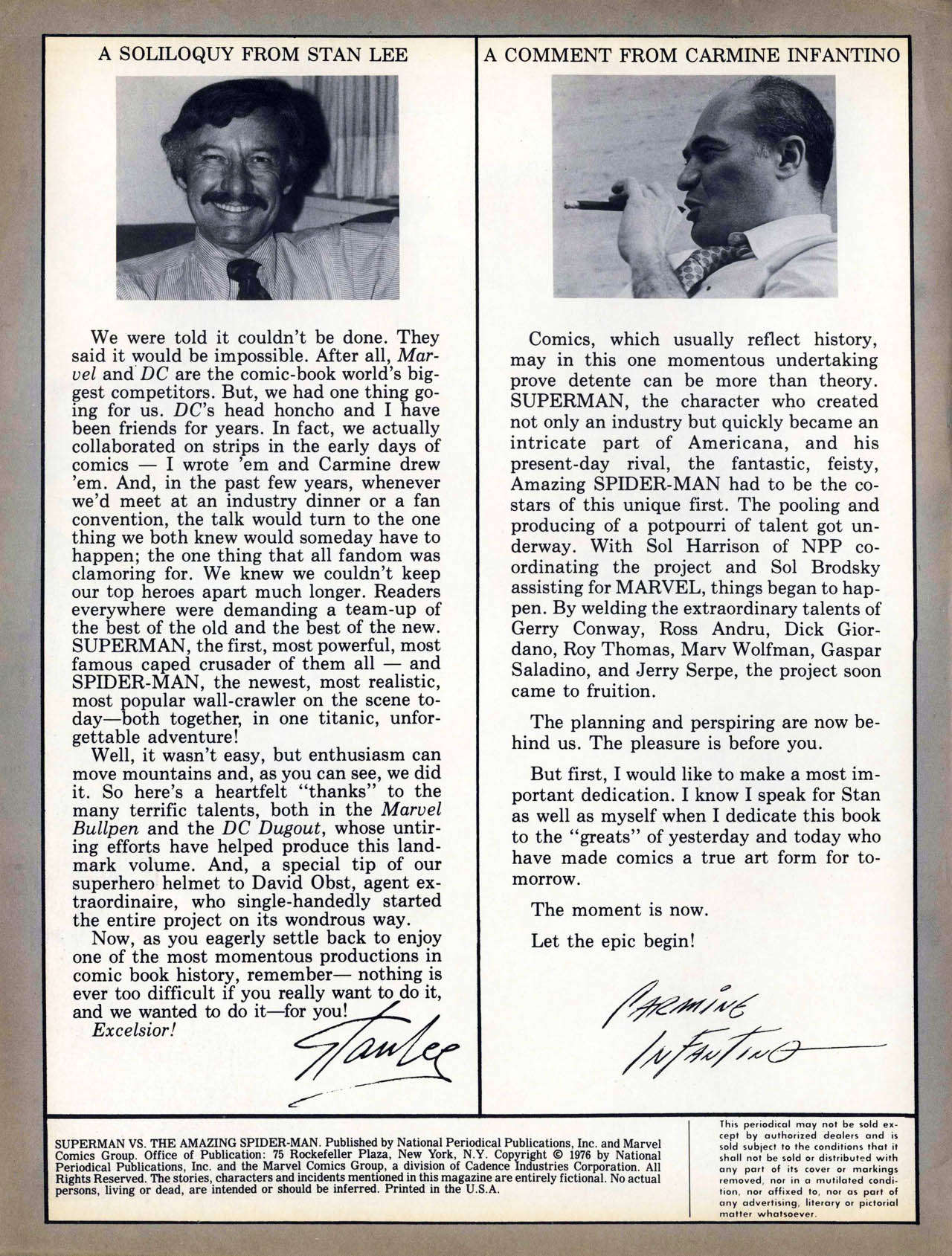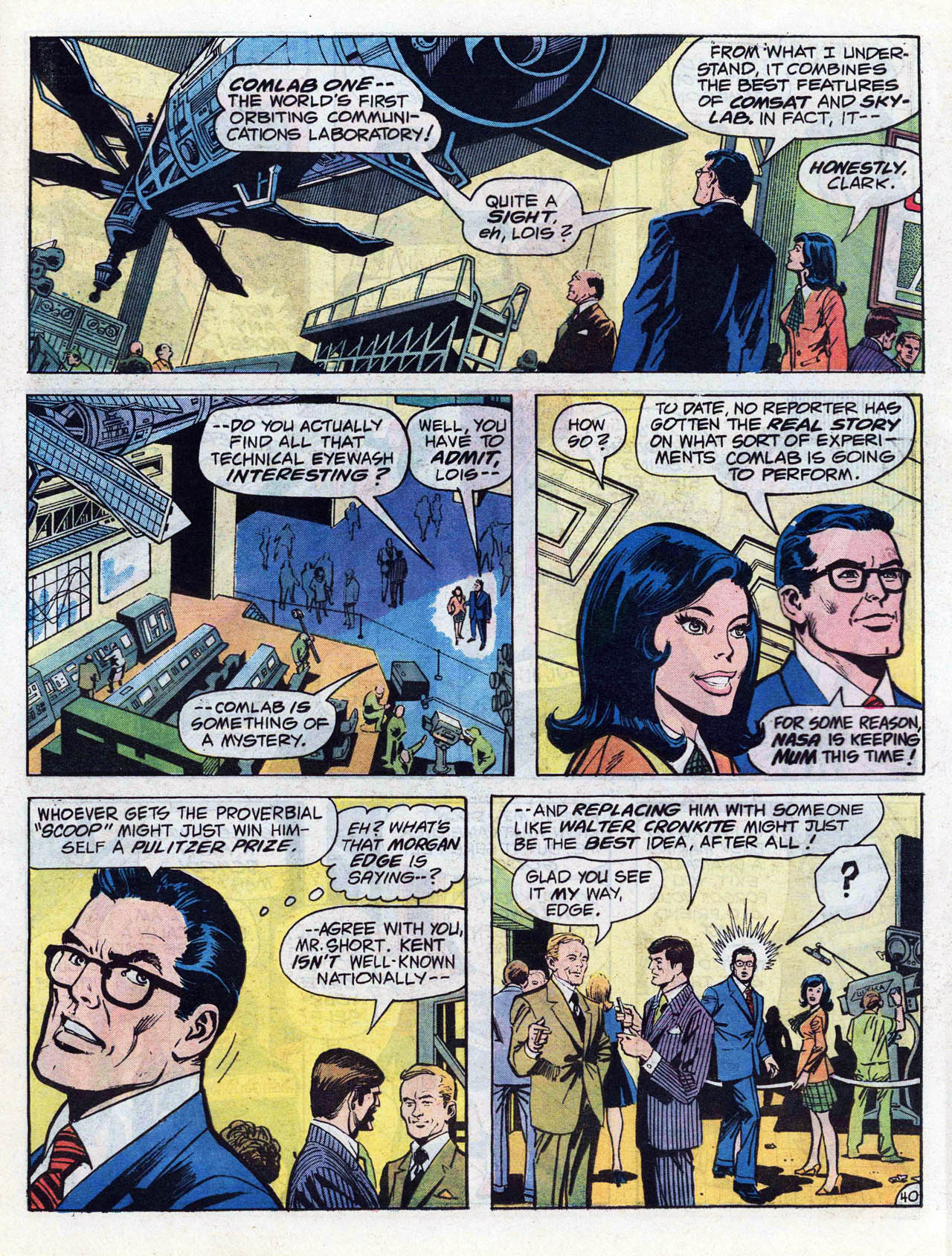 >In late 1972, Conway and writers Steve Englehart and Len Wein crafted a metafictional unofficial crossover spanning titles from both major comics companies. Each comic featured Englehart, Conway, and Wein, as well as Wein's first wife Glynis, interacting with Marvel or DC characters at the Rutland Halloween Parade in Rutland, Vermont. Beginning in Amazing Adventures #16 (by Englehart with art by Bob Brown and Frank McLaughlin), the story continued in Justice League of America #103 (by Wein, Dick Dillin and Dick Giordano), and concluded in Thor #207 (by Conway and penciler John Buscema). As Englehart explained in 2010, "It certainly seemed like a radical concept and we knew that we had to be subtle (laughs) and each story had to stand on its own, but we really worked it out. It's really worthwhile to read those stories back to back to back – it didn't matter to us that one was at DC and two were at Marvel – I think it was us being creative, thinking what would be really cool to do."[18][19][20]>Conway returned to DC Comics in mid-1975, beginning with three books cover-dated Nov. 1975: Hercules Unbound #1, Kong the Untamed #3, and Swamp Thing #19. He wrote a revival of the Golden Age comic book series All Star Comics, which introduced the character Power Girl.[21][22][23] Shortly afterward, he was chosen by Marvel and DC editors to script the historic intercompany crossover Superman vs. the Amazing Spider-Man #1, a 96-page, tabloid-sized, $2 one-shot, at a time when comic books sold for 25 cents.[7][24]>He continued writing for DC, on titles including Superman, Detective Comics (starring Batman), Metal Men, Justice League of America, 1st Issue Special #11 starring Codename: Assassin,[25] and that of the licensed character Tarzan.[7] Conway briefly returned to Marvel where he succeeded Marv Wolfman as editor-in-chief in March 1976,[26] but held the job only "about a month-and-a-half,"[27] relinquishing the post and being succeeded by Archie Goodwin.