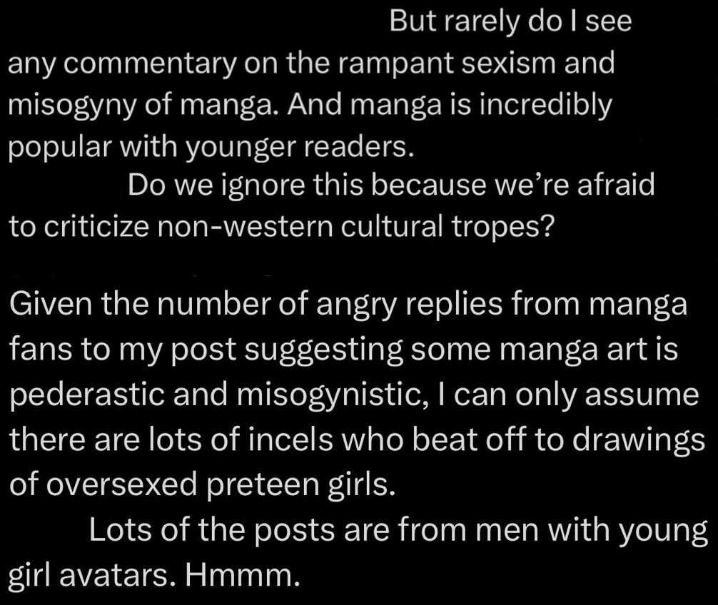 >>153423033Manga has been called out for sexism for years tho? Even with people coping with Yuri(which is not different than Korra) Kishimoto, Oda , Gege,Horikoshi,... Has 24/7 manchilds mad at them writing woman or being homophobes(hilarious because Hori probably is sorta centre-left wing reading his vision of trans stuff)Also the pedo stuff is hilarious, pedo in manga gets more talk than pedo in comics, read a Claremont ,Wolfman or Byrne comic and has 100% pedo relationships