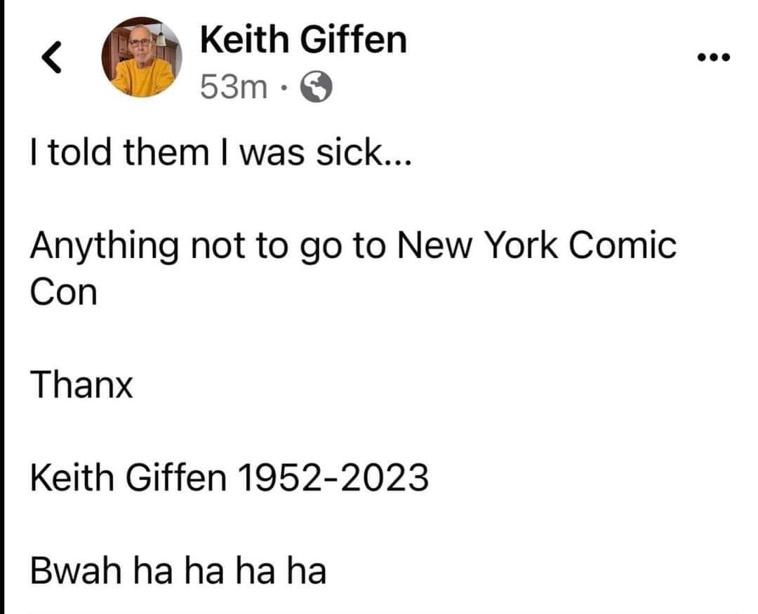 I wish I could muster the capacity to feel bad but unfortunately comics has wasted my time and money for 20 years RIP old guy from 3 decades ago, if only your work mattered enough to keep this industry afloat