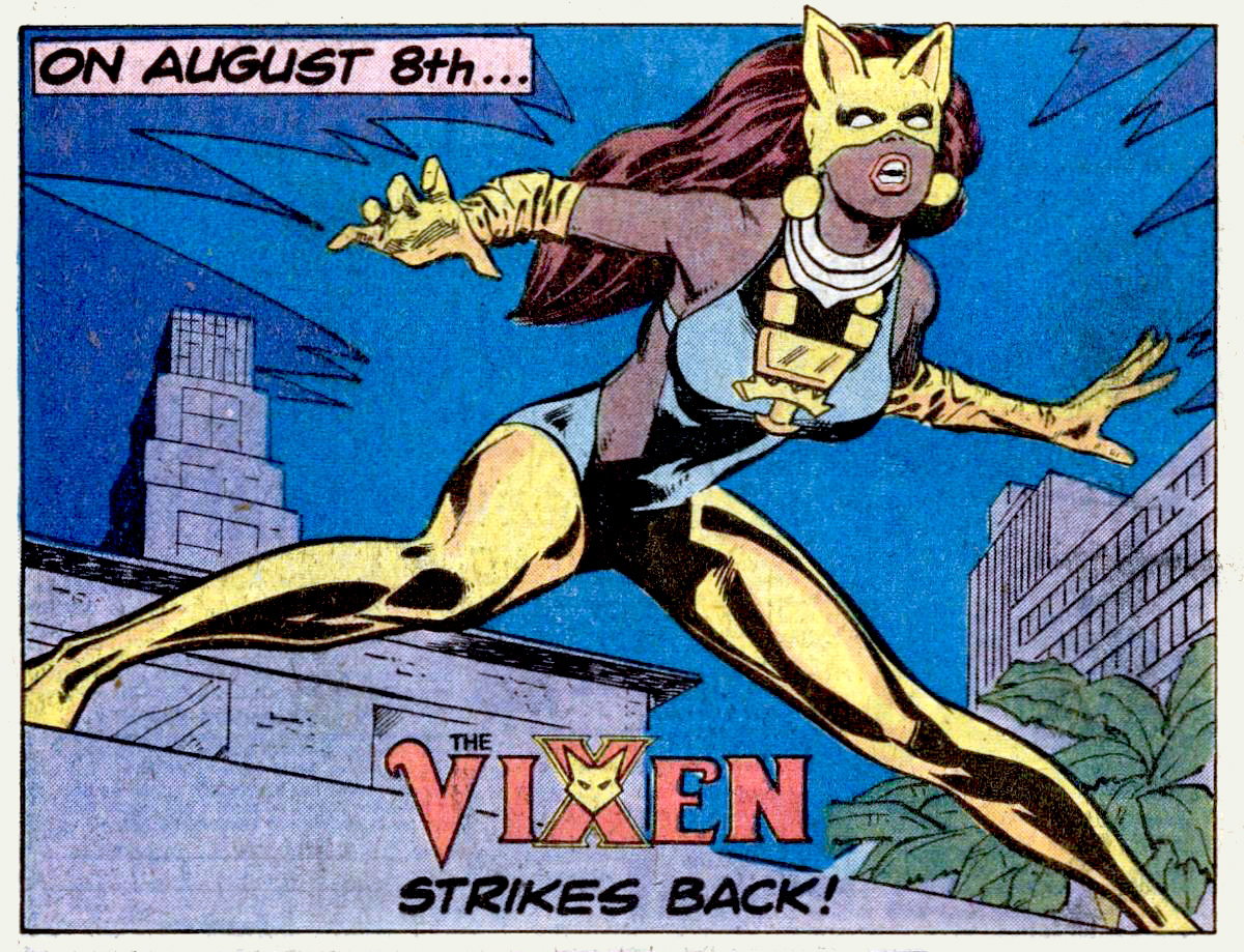 >Creation of Vixen>what I was trying to address was what I perceived to be a lack of strong female leads in DC's comics at the time. Or, let me put it this way: there was an opportunity, as DC was looking for additional books. Surveying the titles that they have, it seemed to me there were some obvious openings for characters that had been underrepresented. One of them had been lead female super-heroes. They had Wonder Woman. To a lesser degree they had Supergirl, Power Girl (who I also created), and Wonder Girl. There were a lot of girls, but not a lot of full-formed adult female super-heroes operating at DC, so I wanted to create one I also wanted to create a character who was a minority, and the idea of a female Black super-heroine hadn't been played up to any great extent at that point. I think Storm (of the X-Men) was around, but I don't think there were very many other representations of that type of character in the field... She was kind of based on what we called supermodels at the time. It was a very strange social phenomenon that was starting to occur back then. You had these women who were obviously objects of the male gaze, but they were also extremely empowered. They took charge of their own image, their own business, and identity. I wanted to show that.