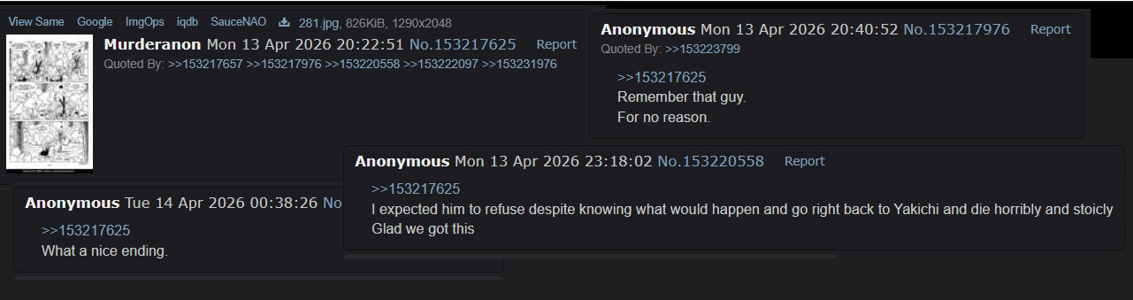 >>153446848murder and enma end up on tv for raising an army of million crows>but why? news reporters around the globe asked>for the final war against resurrected hikiji and hijiki>stan sakai's spirit smiles down at us like shinzo abe's smile that wishes the Japanese youth would reproduce