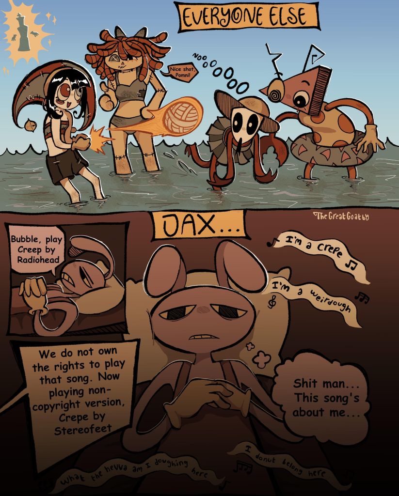I just woke up from a dream>caine explains the adventure. something something survival horror shooter action rpg >I'm not listening, because I'm too busy looking at the soulful source engine view of the world in this adventure. like being in city 17 from half life 2.>randomly paired up with jax and we spawn in a building, with assault rifles and isekai anime menus for rpg stat customization >i just stare out an open window like a drooling retard and spot an electric billboard advertisement for Deltarune chapter 5>I'm full of joy and rush to tell Jax that indie games are finally getting the respect they deserve >overhear jax talking to a woman in another room>(woman with seductive voice) You should invest into the impregnation skill tree. I mean if your enemies are pregnant they can't fight back, right Jaxyboy?>jax enters my room >(me) JAX LOOK! INDIE GAMES ARE GETTING THE LOVE THEY DESERVE. DELTARUNE ADVERTISEMENT IN A BIG CITY LIKE THIS!!! GAMING IS SAVED!>i gesture outside the window to where the advertisement was>(jax) What are you on about, you green nega? I mean, you don't even have any hair!>I quickly look at where I was pointing and saw a woman's hair advertisement instead of a Deltarune one>(jax) See? It was just your imagination.>i peak into the other room and see it's empty >(me) By the way, Jax, who were you talking to?>jax gives me the schizo stare>(jax) your imagination >then jax shoved me out of the open window and i fell into a different dream that was like the game NiGHTS into Dreams