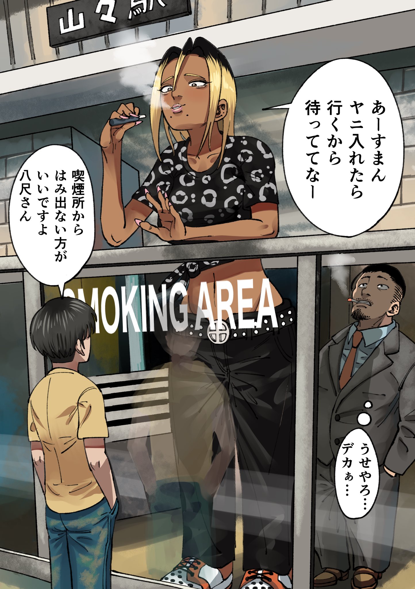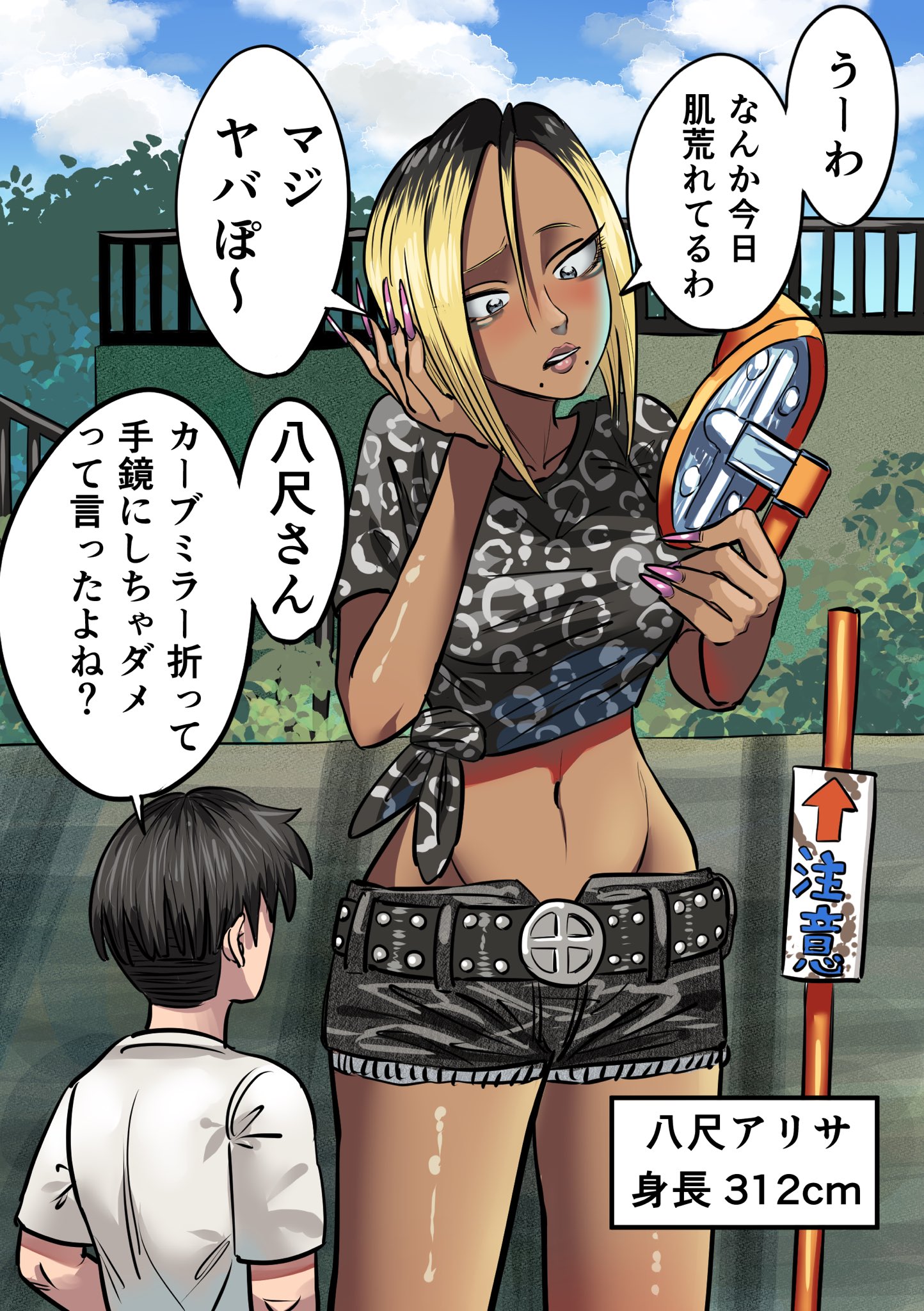 >>11475676>tall gal:“Ugh…My skin’s kind of breaking out today.”>tall gal: “This is seriously bad…”>short dude: “Hasshaku-san, I told you not to break off a roadside convex mirror and use it as a hand mirror, right?”>>11475678>tall gal: “Ah, sorry. I’ll come after I have a smoke. Wait for me, okay?”>short dude: “You shouldn’t stick out of the smoking area, Hasshaku-san.”>Suit man: “No way…She’s huge…”
