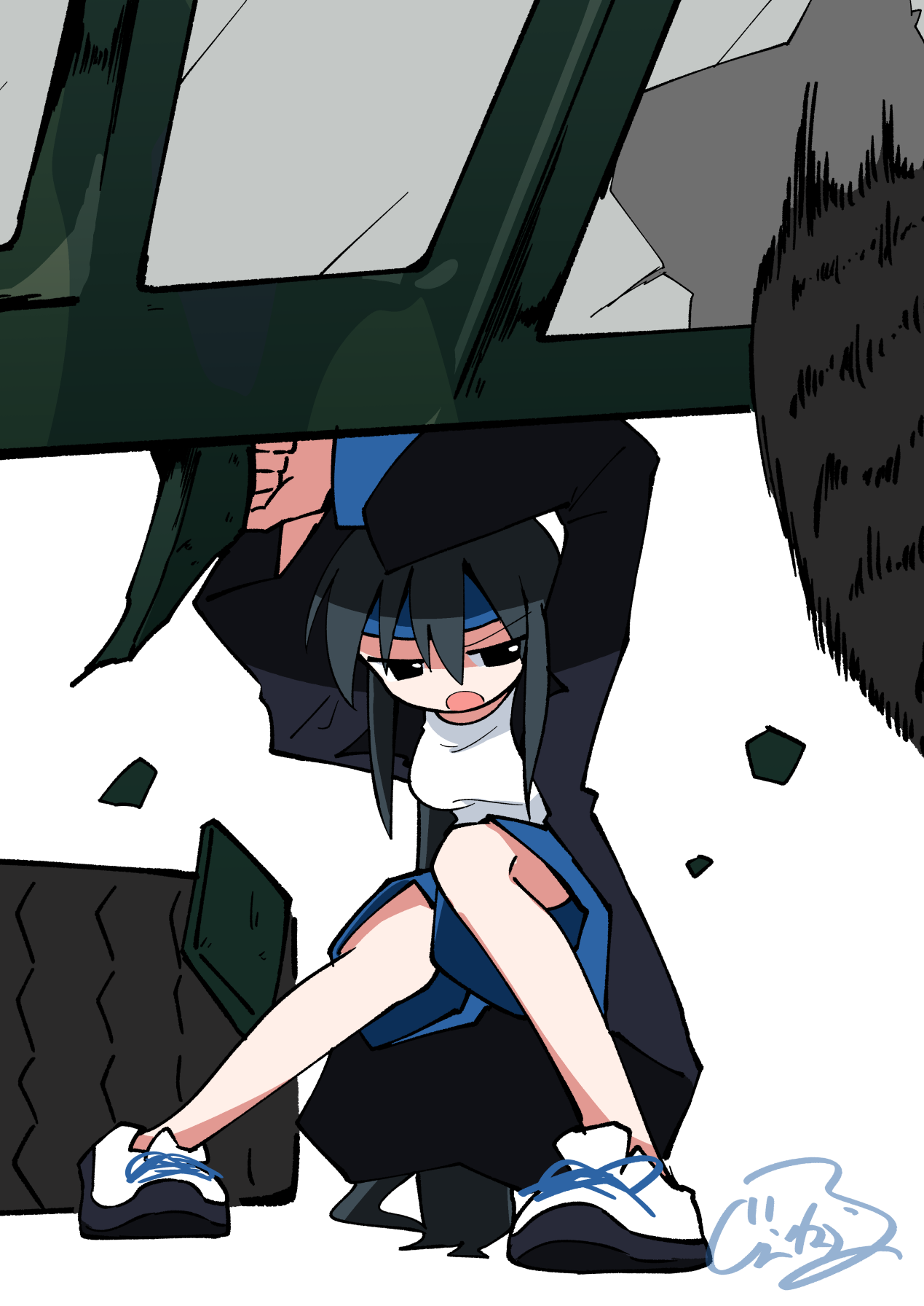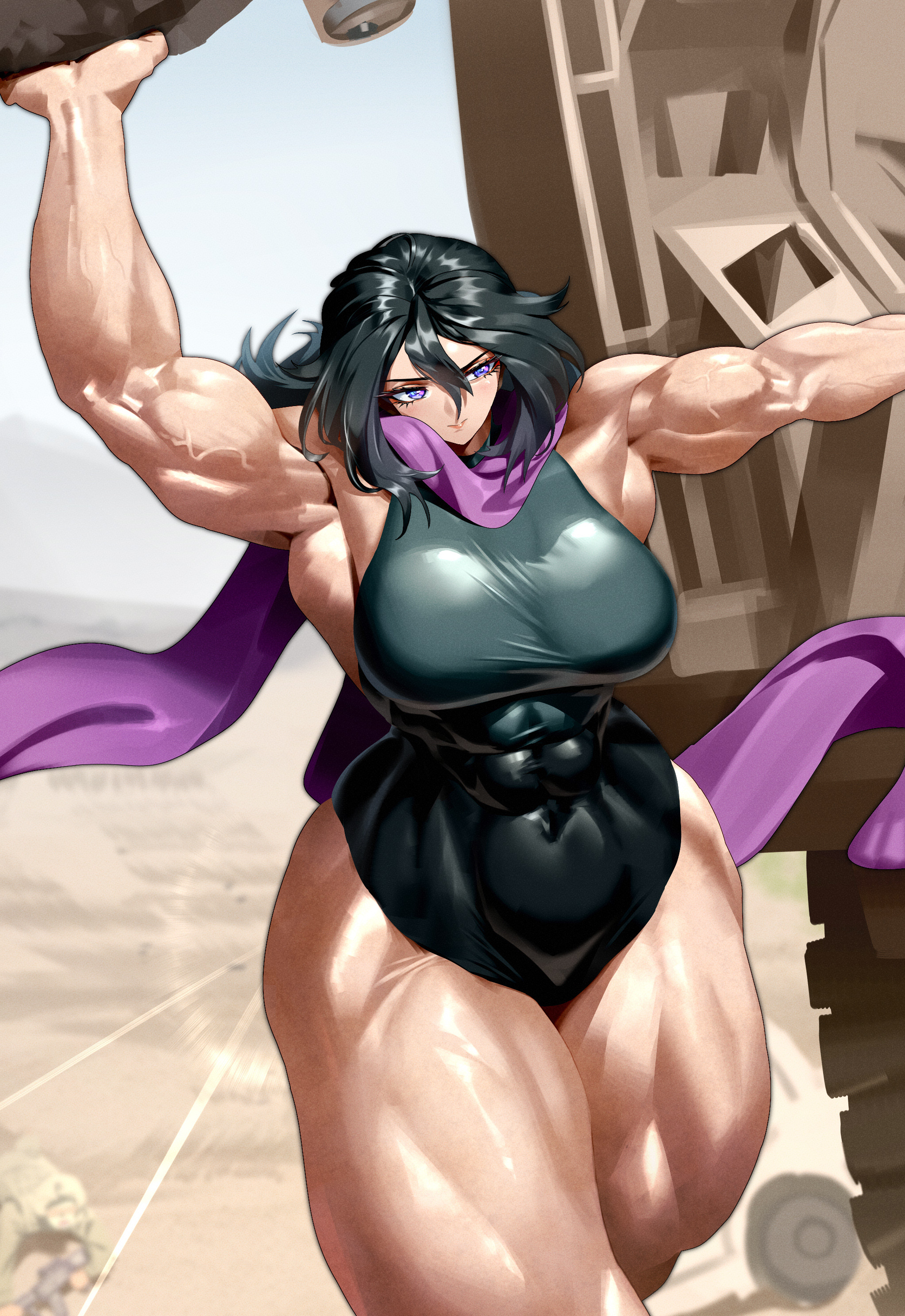 Mizuki from Somnium Files would be perfect for this since she has superhuman strength. Unfortunately the series doesn't get much art. I'm sure her being a loli for 2 1/2 of the 3 games doesn't help either