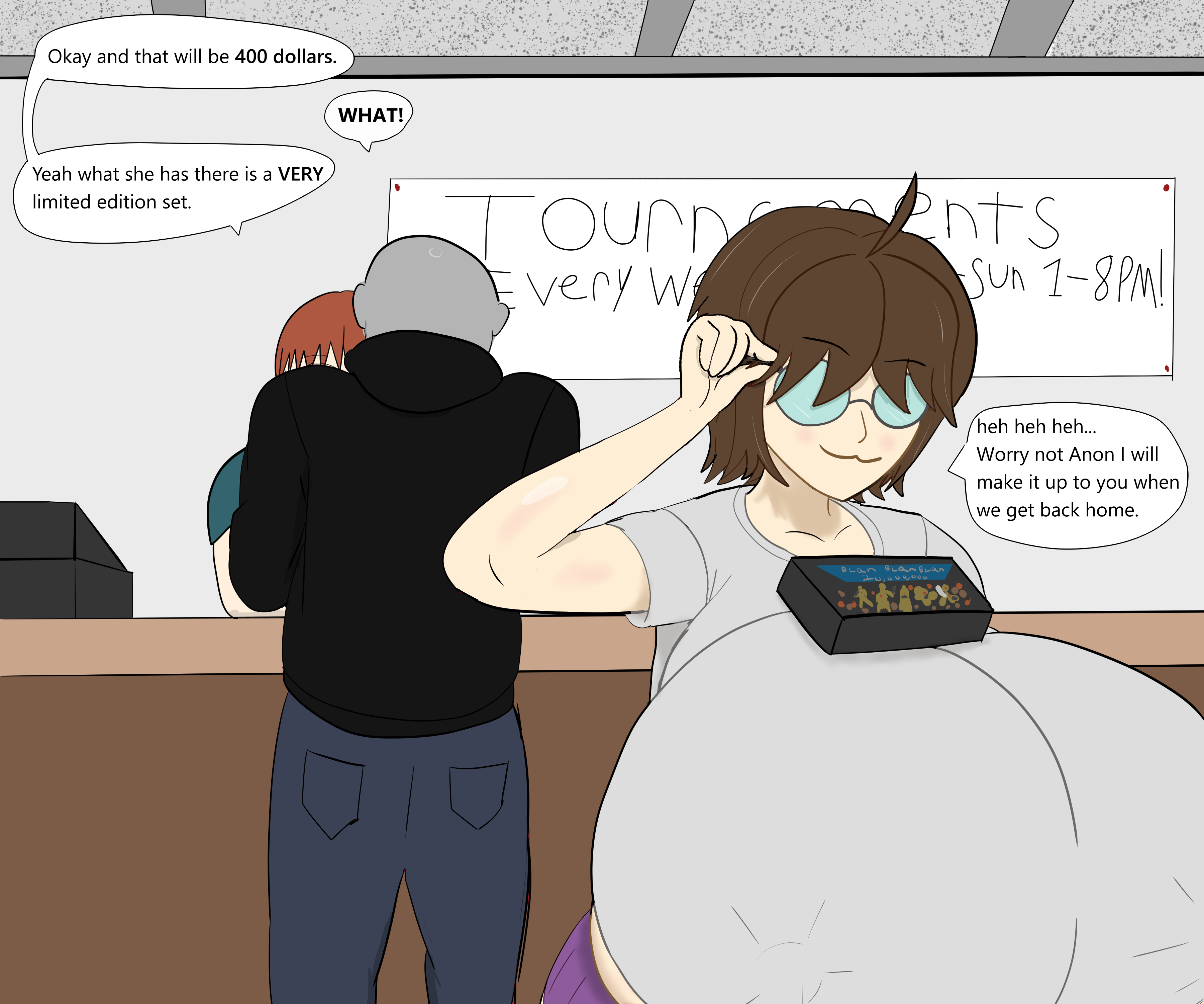 >>11384985>a doujinMy idea wouldn't really fit in a standard doujin without a few cuts, but:>Femboy gets a night job closing a convenience store in the outskirts of a big city>Most of the customers are women who show modest interest in him, but nothing outright sexual in nature>One day, a strange girl dressed like a fortune teller shows up and performs a "fortune telling" right there at the checkout counter>After that, changes come hard and fast, suddenly all his usual shoppers are turning into various flavors of monstergirl, he's turned into a horseboy himself>And everyone's just plain getting bigger>Before long, he's sporting a foot and a half of horse meat and the girls who frequent the store each night are becoming increasingly fecund, overtly sexual, and all but throwing themselves at him>If it had to be trimmed down, the sex scene would actually be in the middle with a handful of pages after as things settle into a form of normalcy with all the huge girls coming in, struggling to grab shit, knocking stuff over, etc. and the MC steps out from behind the counter, fat dick hanging to just shy of the floor as he comes and helps