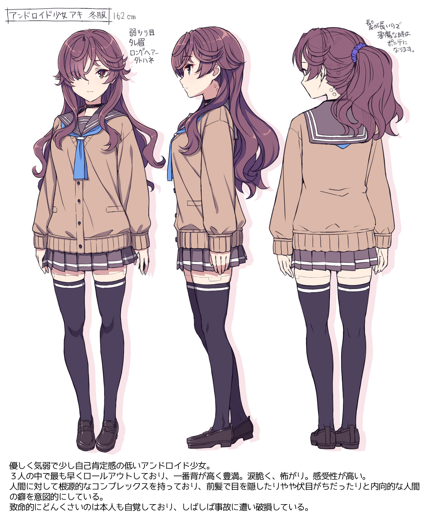 These were posted in the last thread, but I feel they're important enough to repost here too. >Aki>A gentle, timid android girl with low self-esteem.>Rolled out earliest among the three, is the tallest, and has the most voluptuous figure.>Quick to cry, easily frightened, and very sensitive. >Has a deep-seated inferority complex towards humans, and intentionally adopts the habits of an introverted human, such as hiding her eyes with her bangs and keep her gaze towards the ground. >Ac cutely aware of her own clumsiness, frequently getting into accidents and breaking things, including herself. >Wears her hair in a ponytail if it bothers her.