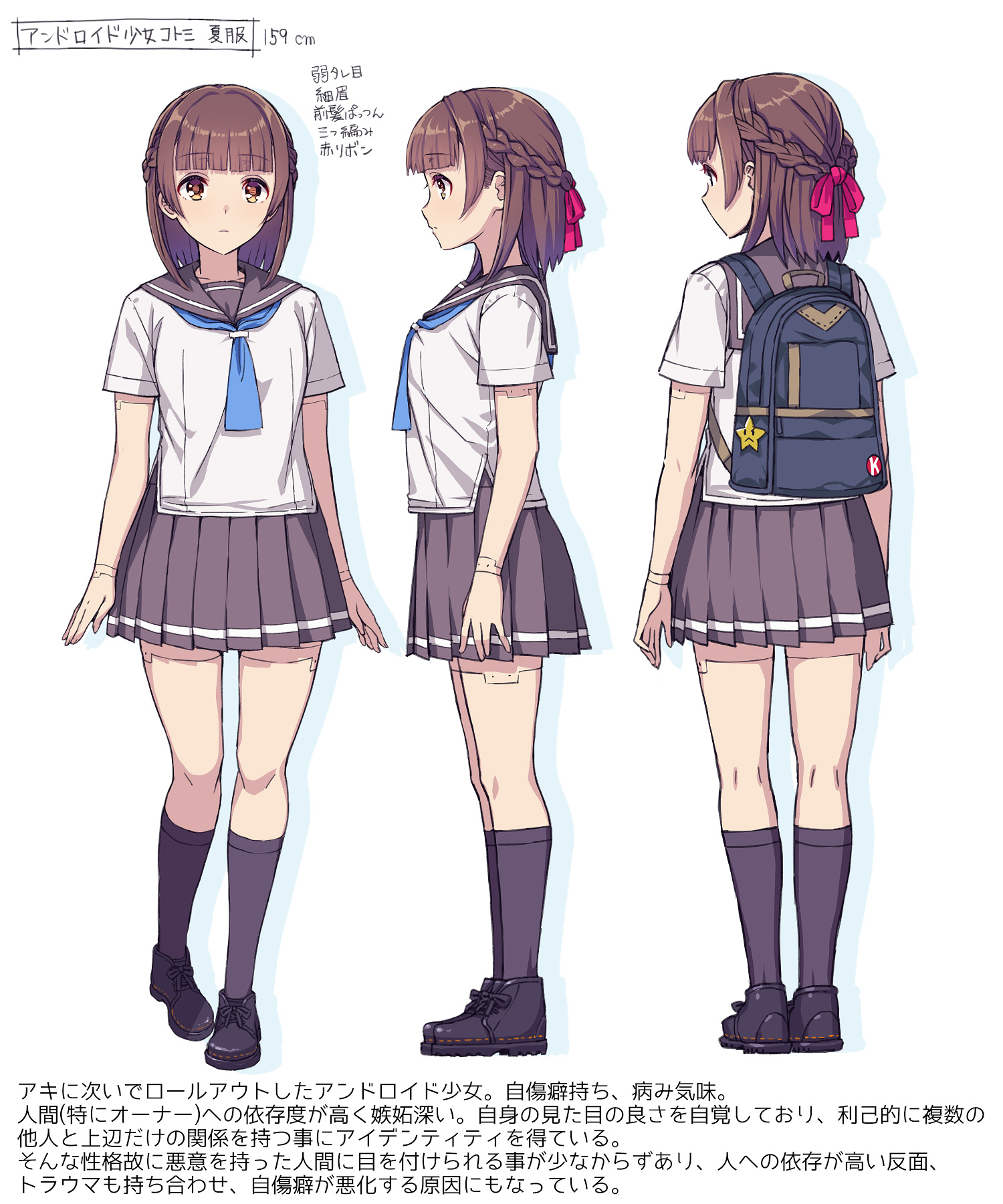 >Kotomi>The second of the android girls, rolled out after Aki.>Has a habit for self-harm and a troubled disposition. Often depressed. >Highly dependent on humans (especially her owner) and prone to jealousy. Aware of her own attractiveness and derives her identity from maintaining superficial relationships with multiple people.>Due to this personality, she is often targeted my malicious people. >Carries some trauma due to this, which contributes to her tendency towards self-harm.