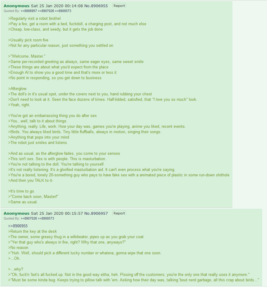 >>11402137>She told her ningen friend that she is actually a robot, as she lifted her skirt to show him her artificial body.>She's unaware that the ningen in question has a massive boner for robot girls, he got so sexually aroused by the sight he ended up ejaculating all over the robutt's crotch before she could even process what was going on.>Her low self-esteem led her to fear that the ningen would react in disgust towards her being a robot. so she is both blushing and crying as her AI struggles to comprehend what just happened and whether she should be grossed out about the uncontrollable libido of the ningen or if she should feel happy over being seen as highly desirable woman by her ningen friend