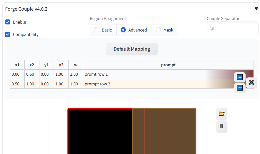 >>11405931For the aya x mao image, I did this setup I'm pretty sure. I just typed the x and y co-ordinates (i.e. percentages) for the regional prompt and put all the prompts on one line per region.