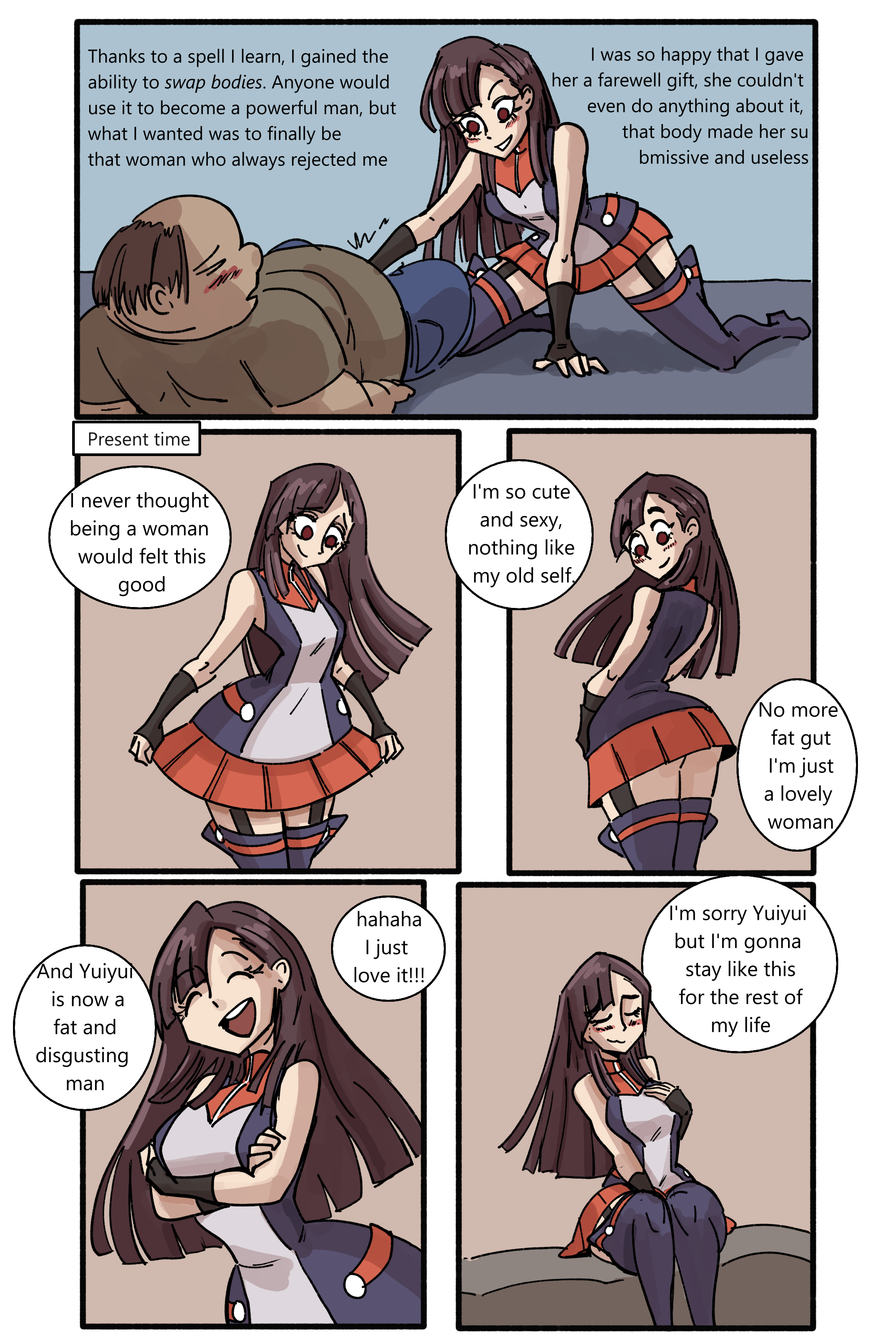 >>11412009>I haven't really seen one where the girl would be happyBecause it would require someone to actually use their brain and figure out how a normal girl would realistically act in a guys body.